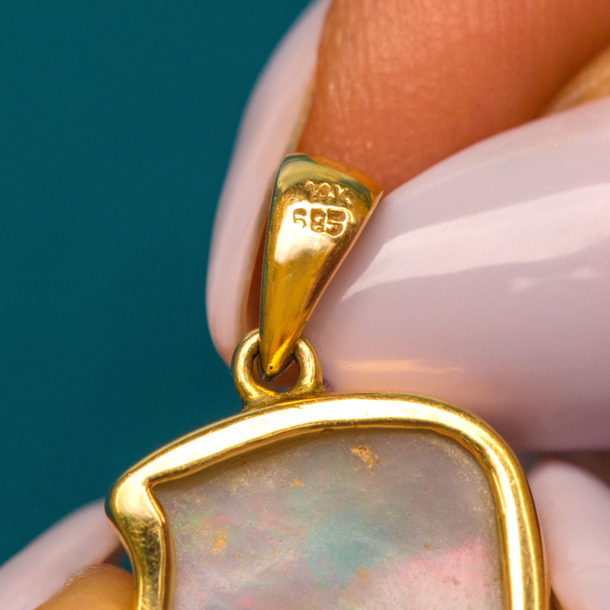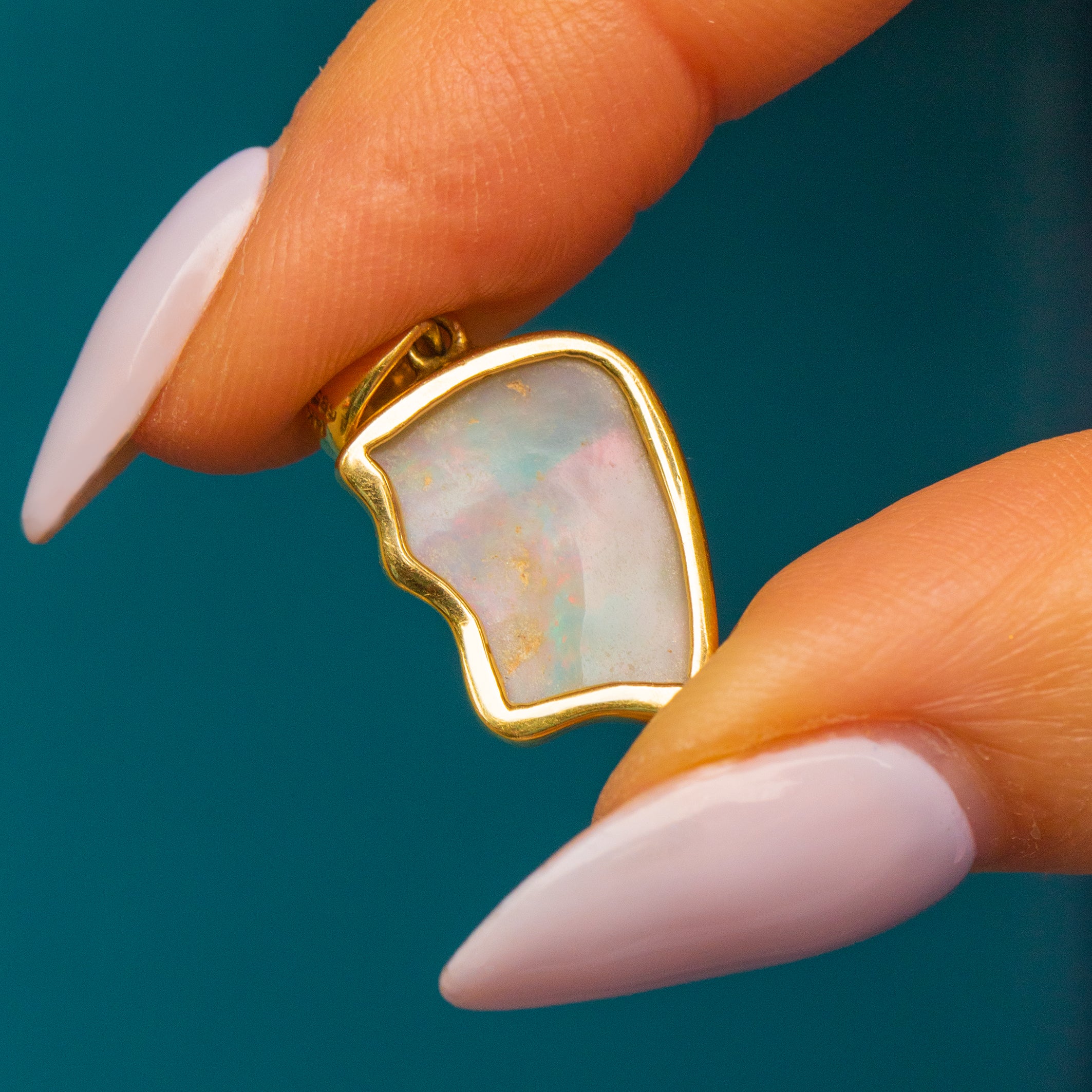EXCELLENT. This 14ct Gold Opal pendant is in excellent condition. The bezel setting perfectly moulds to the unique shape of the Opal, with the Gold baring no damage to note. The Opal is also in tip top condition and displays a magnificent display of colour. You'll be wearing her form the moment you open your pink Lillicoco box!