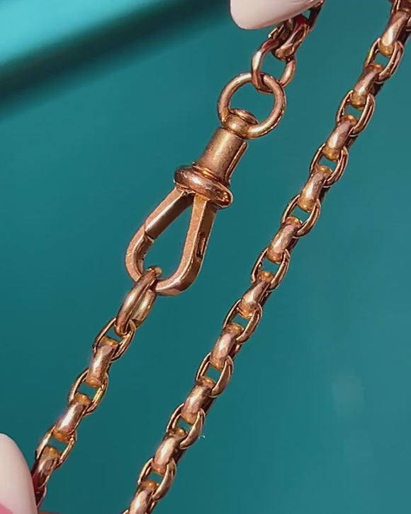 This impressive antique belcher chain is crafted in solid 9ct Gold and measures a substantial 28 inches in length. The classic belcher links are smooth and rounded, giving the chain a bold yet refined look, while the sturdy dog clip clasp adds both security and antique charm.