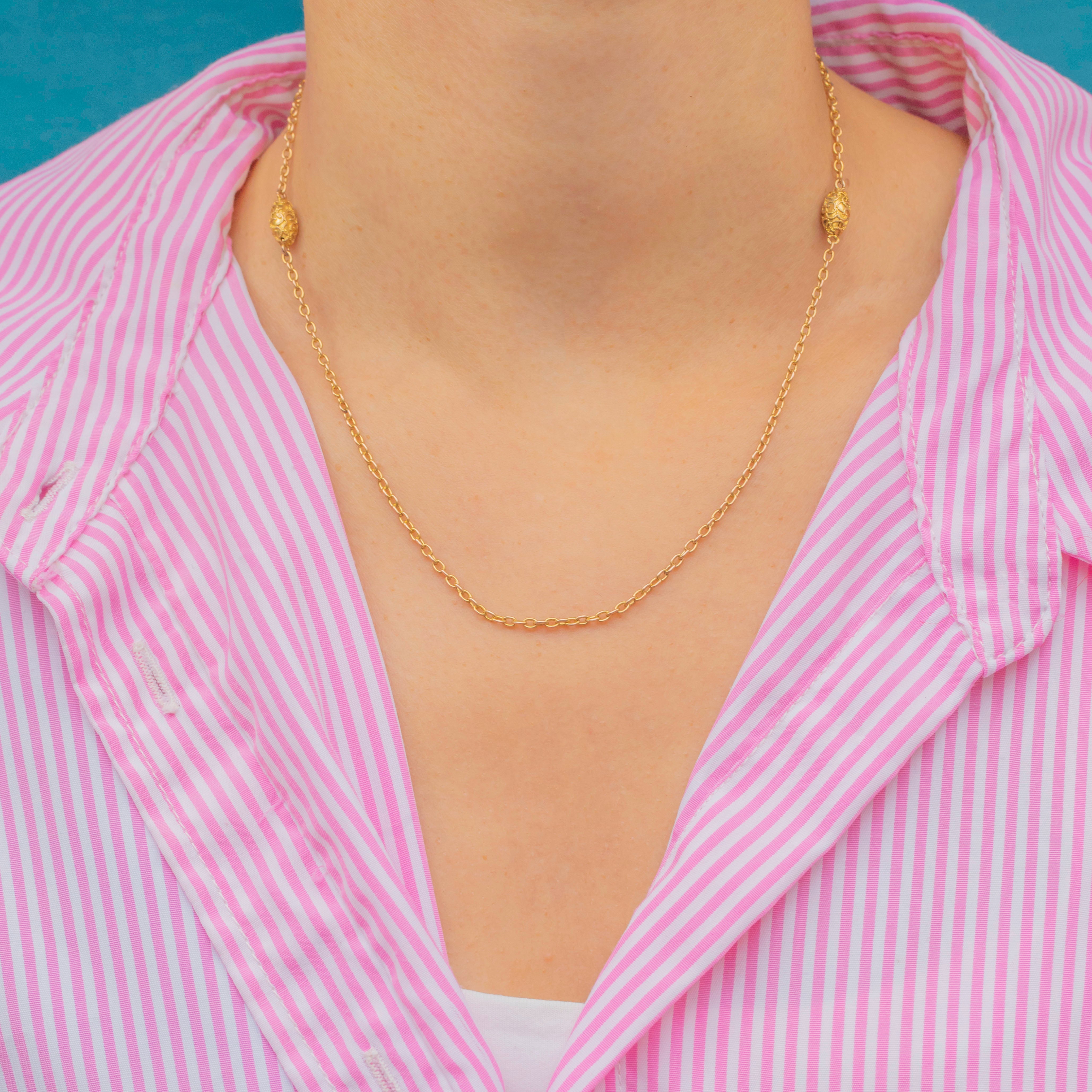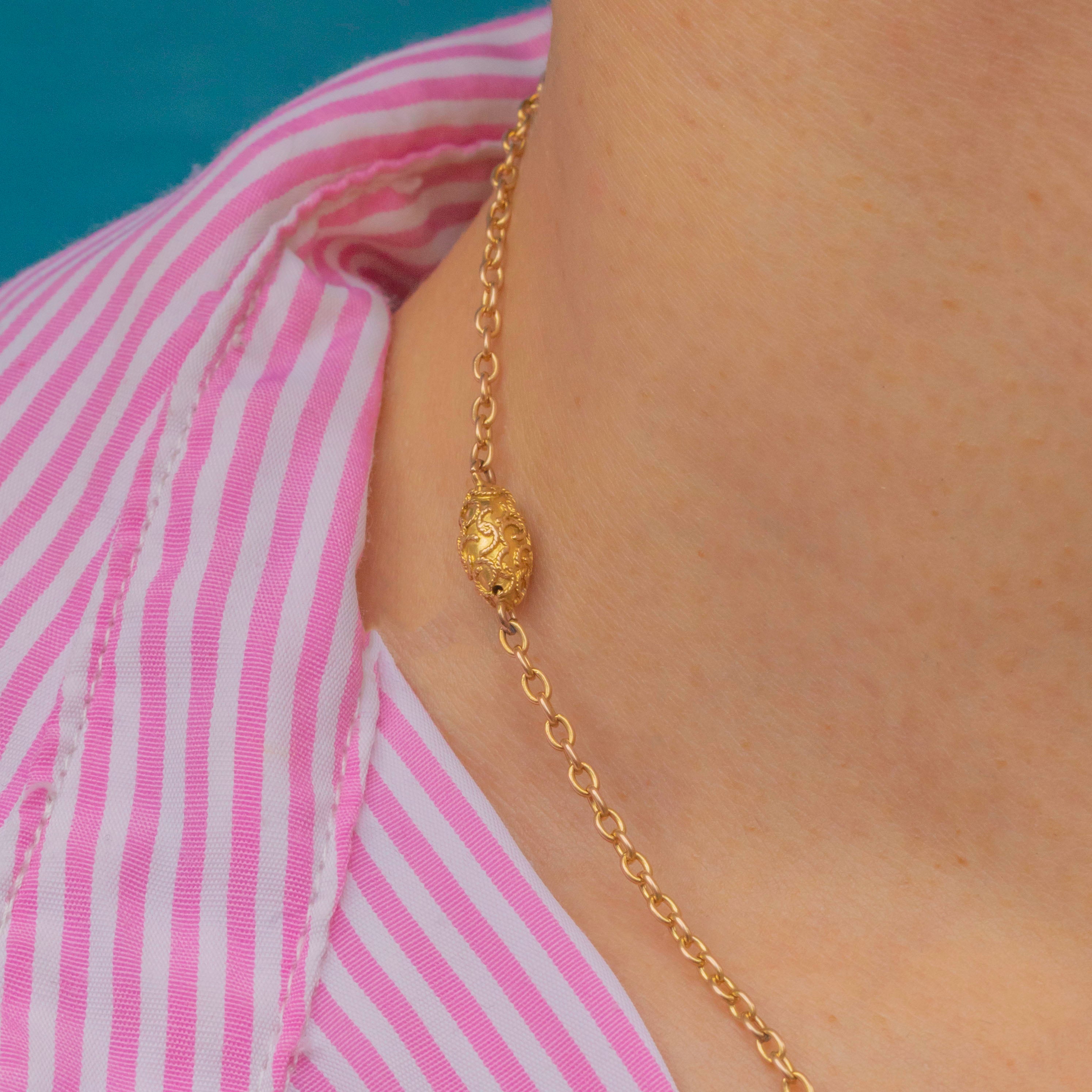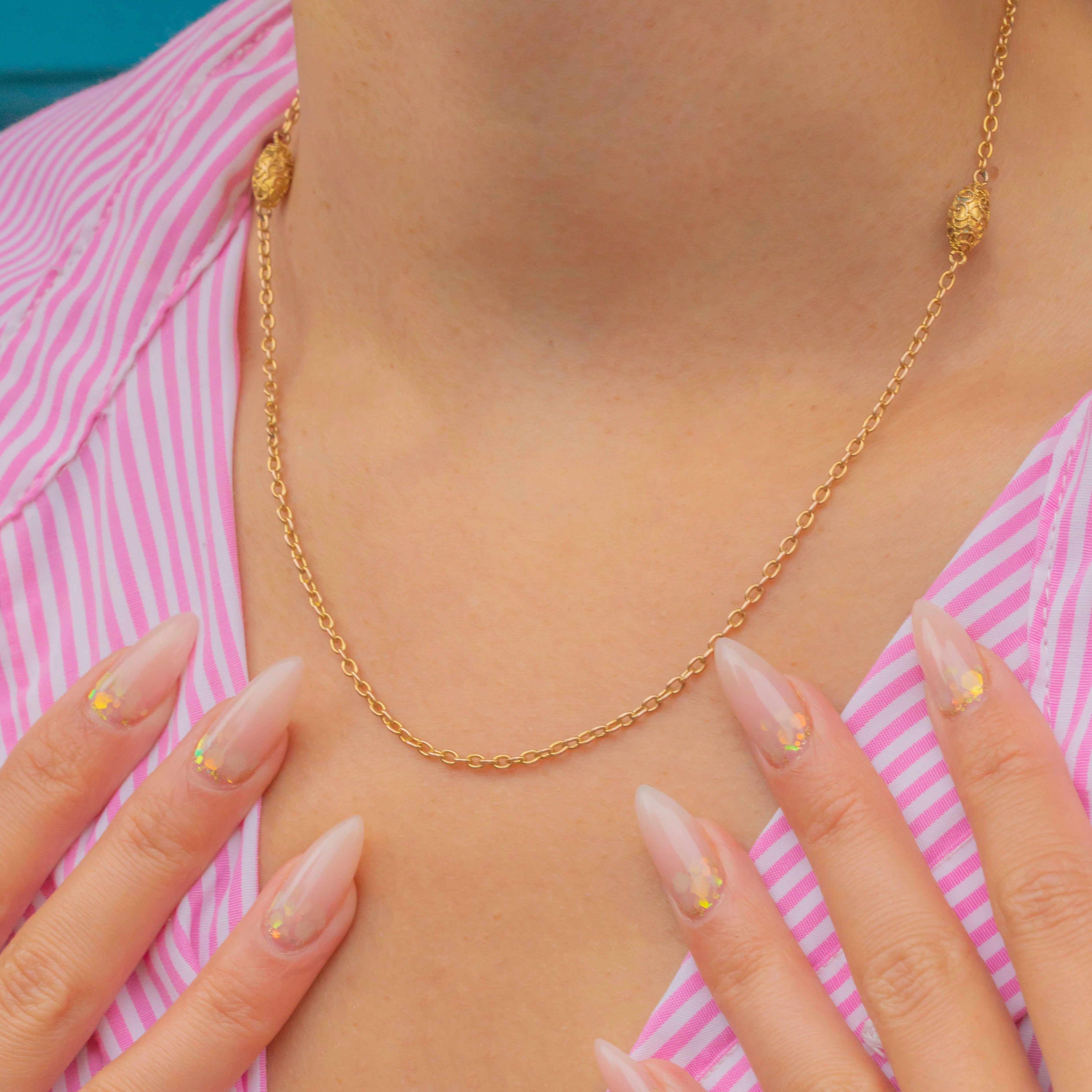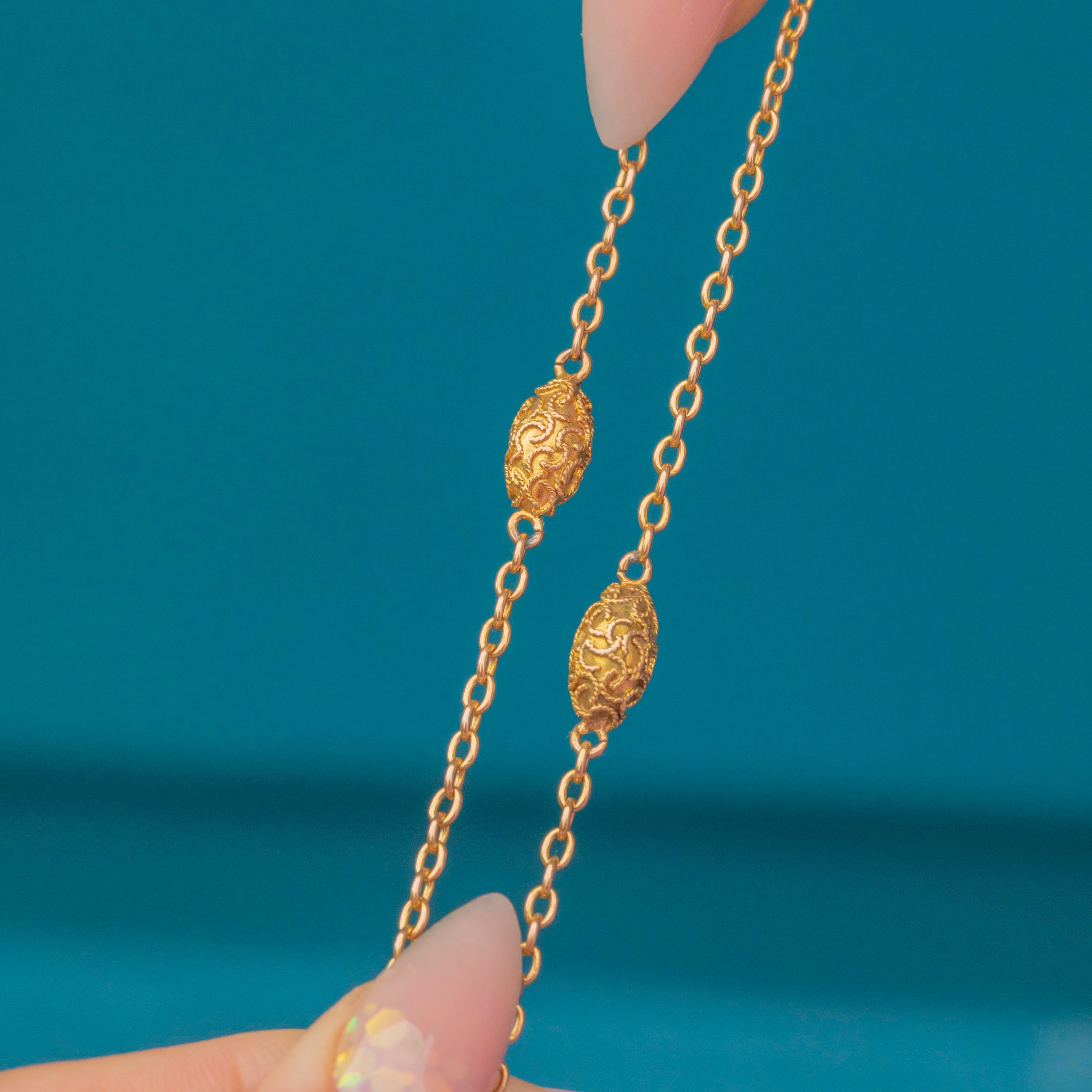 A fine antique chain crafted in rich 15ct Gold, featuring glossy oval belcher links and ornate cannetille lozenge terminals. Each terminal has a beautiful three-dimensional puffy orb design that catches the light with every movement.