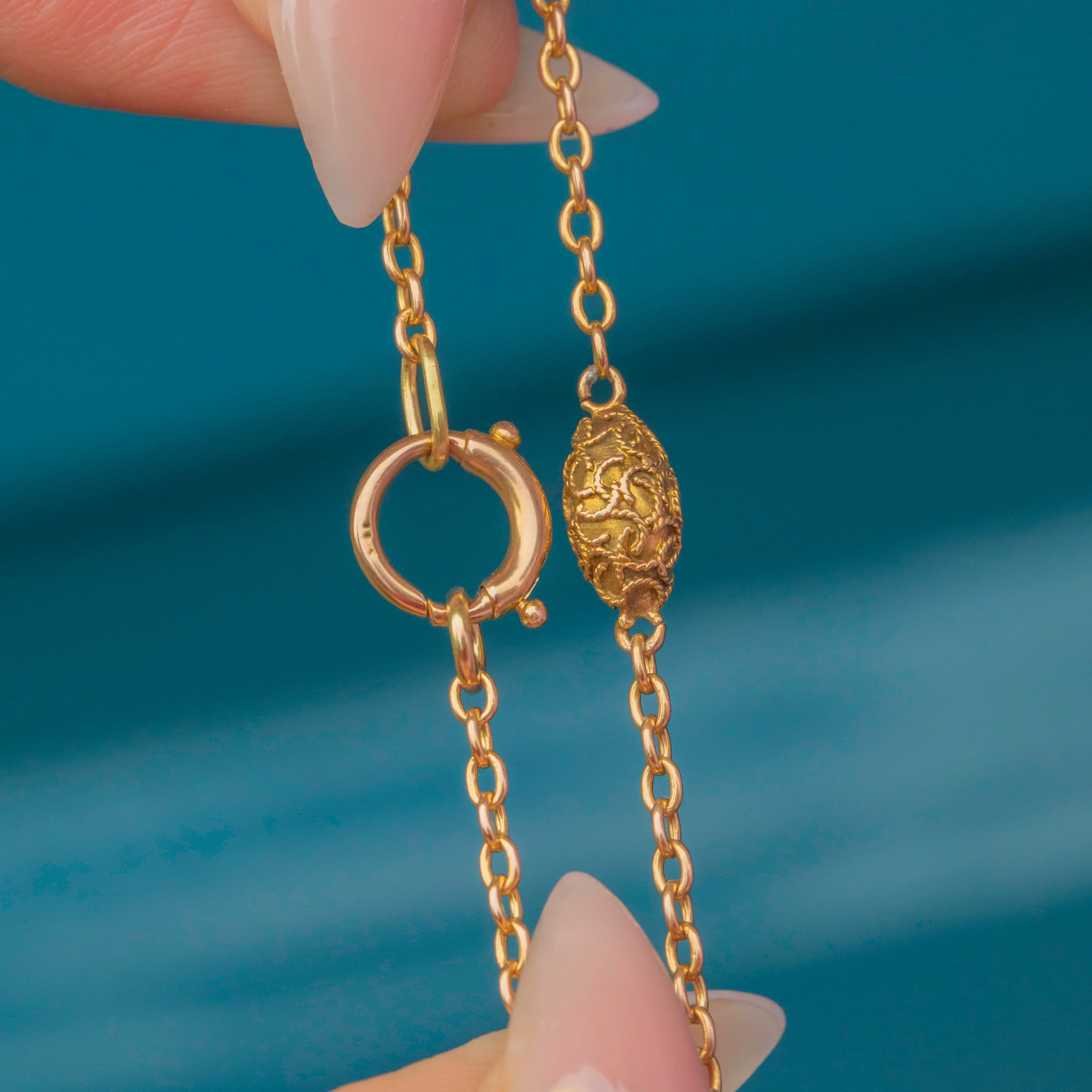 The chain is secured with a large 15ct Gold bolt-ring clasp, offering versatility as it can be used interchangeably with other chains or to hold a charm or pendant. With its buttery gold hue and intricate details, this is a superb Victorian jewel that combines functionality with ornate design.