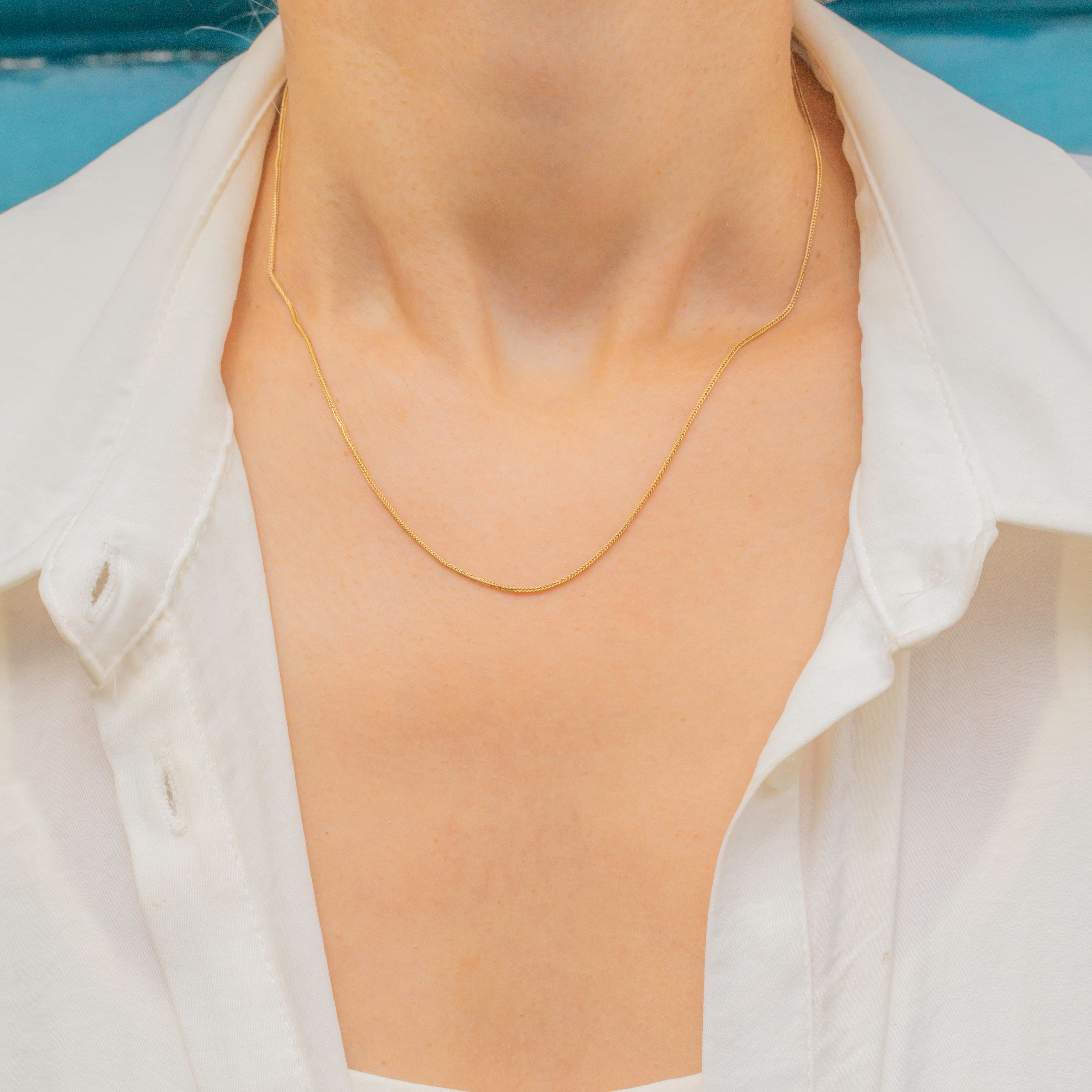The smooth foxtail links sit comfortably against the chest and the barrel clasp provides secure closure. Whether you wear this antique Gold chain alone or as part of a neck stack, it'll make a versatile piece that you'll reach for time and time again!