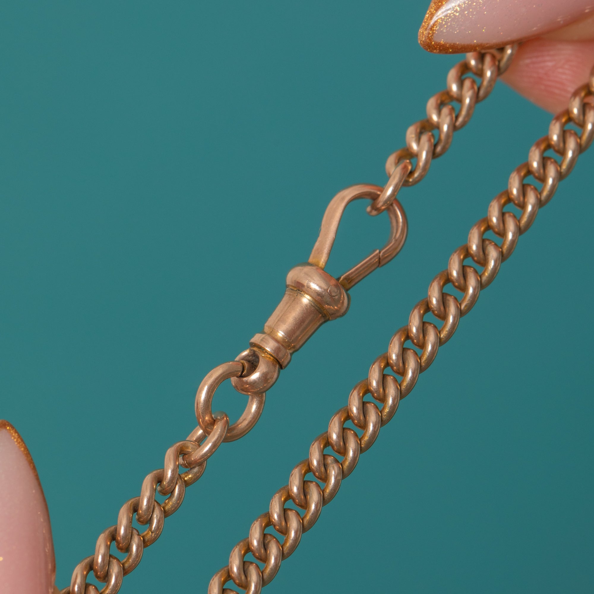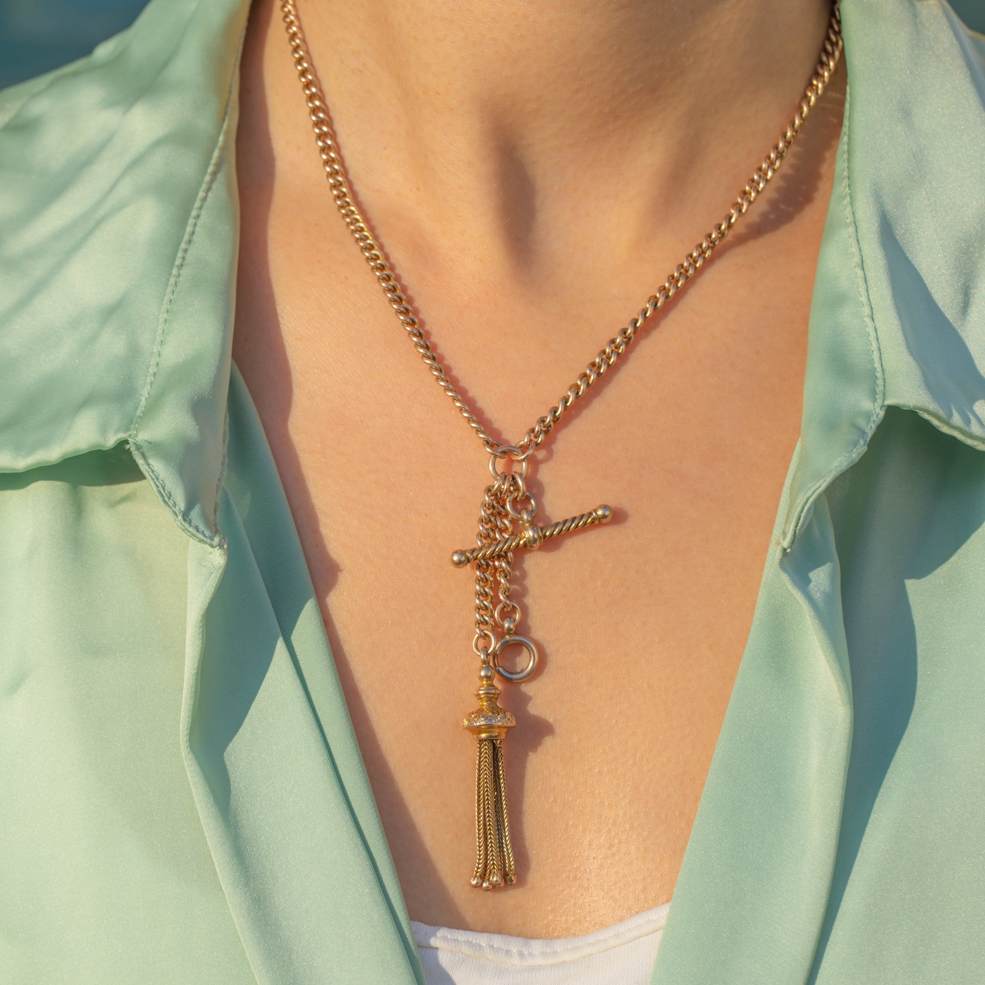 A magnificent Victorian 9ct Gold curb chain showcasing all the charm of the era — a substantial weight, beautiful buttery Gold tone and a cascade of original antique fittings. At the centre hangs a wonderful trio: a tassel drop, a bolt-ring dangle and a fancy T-bar, all moving gracefully with the wearer and adding layers of texture and antique detail.