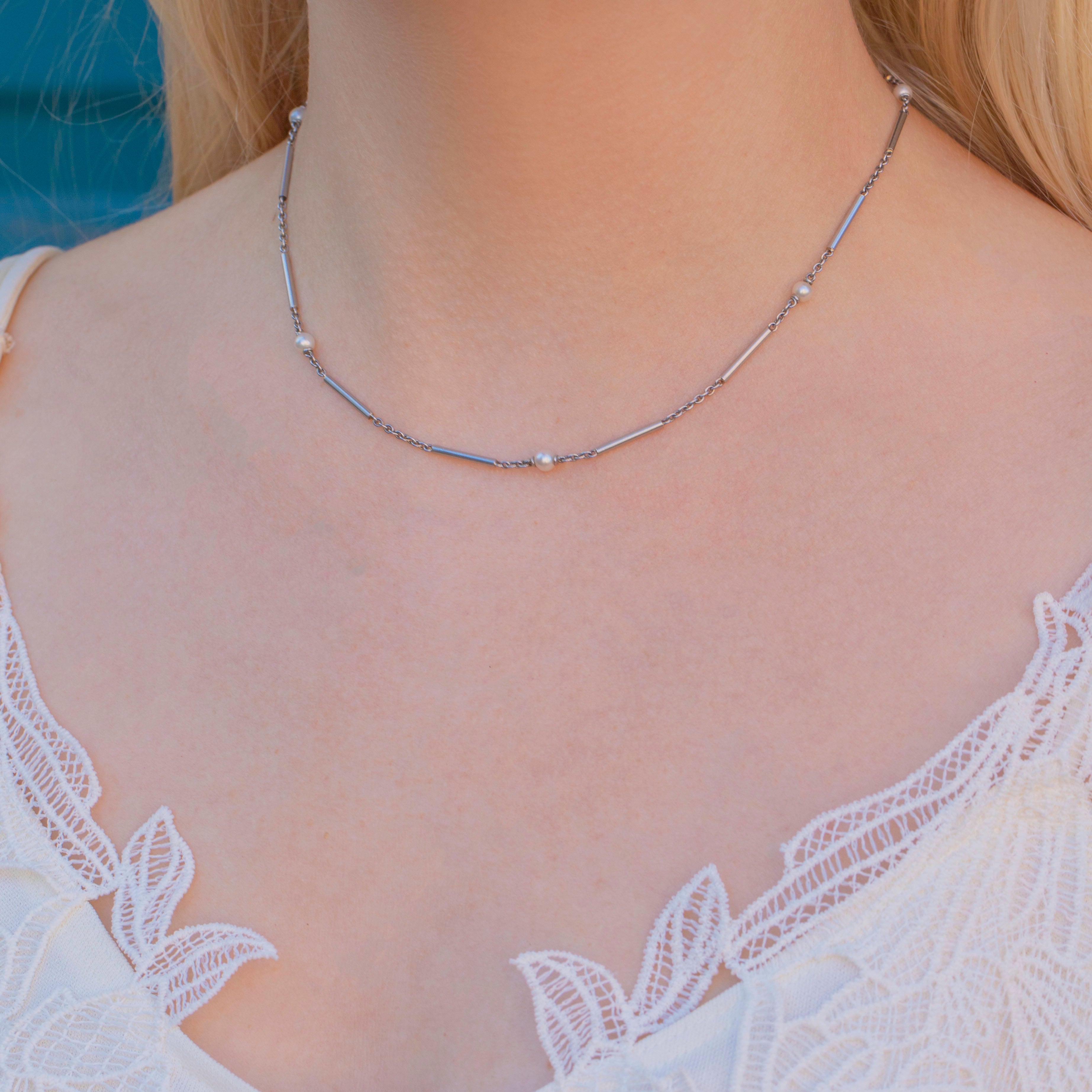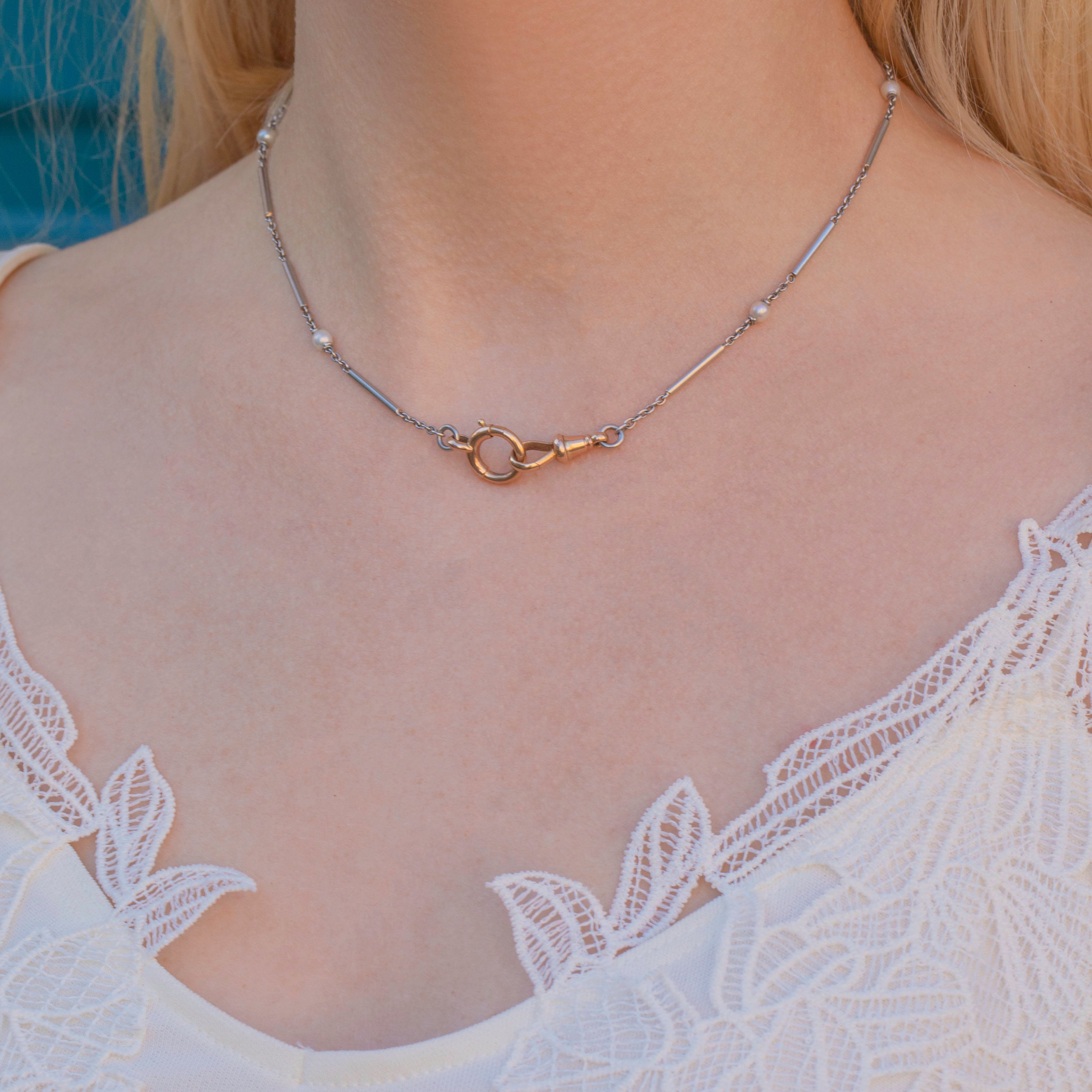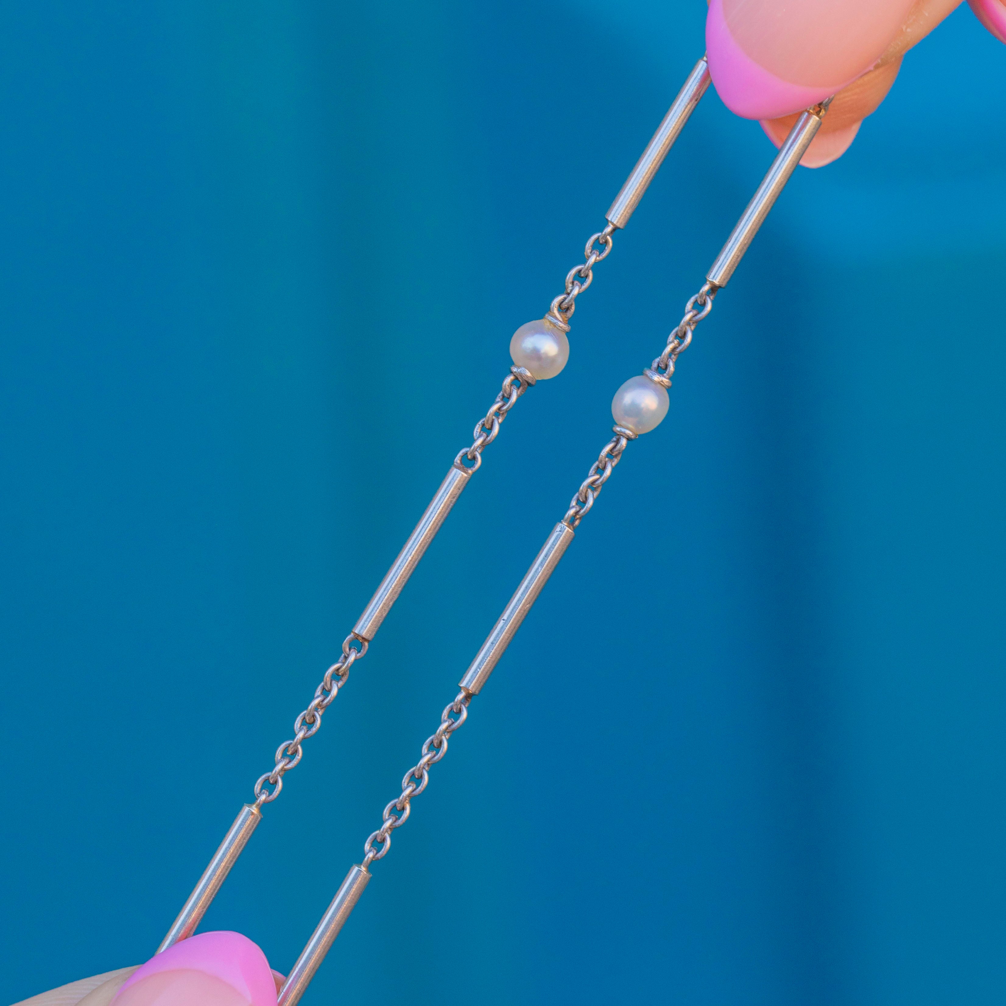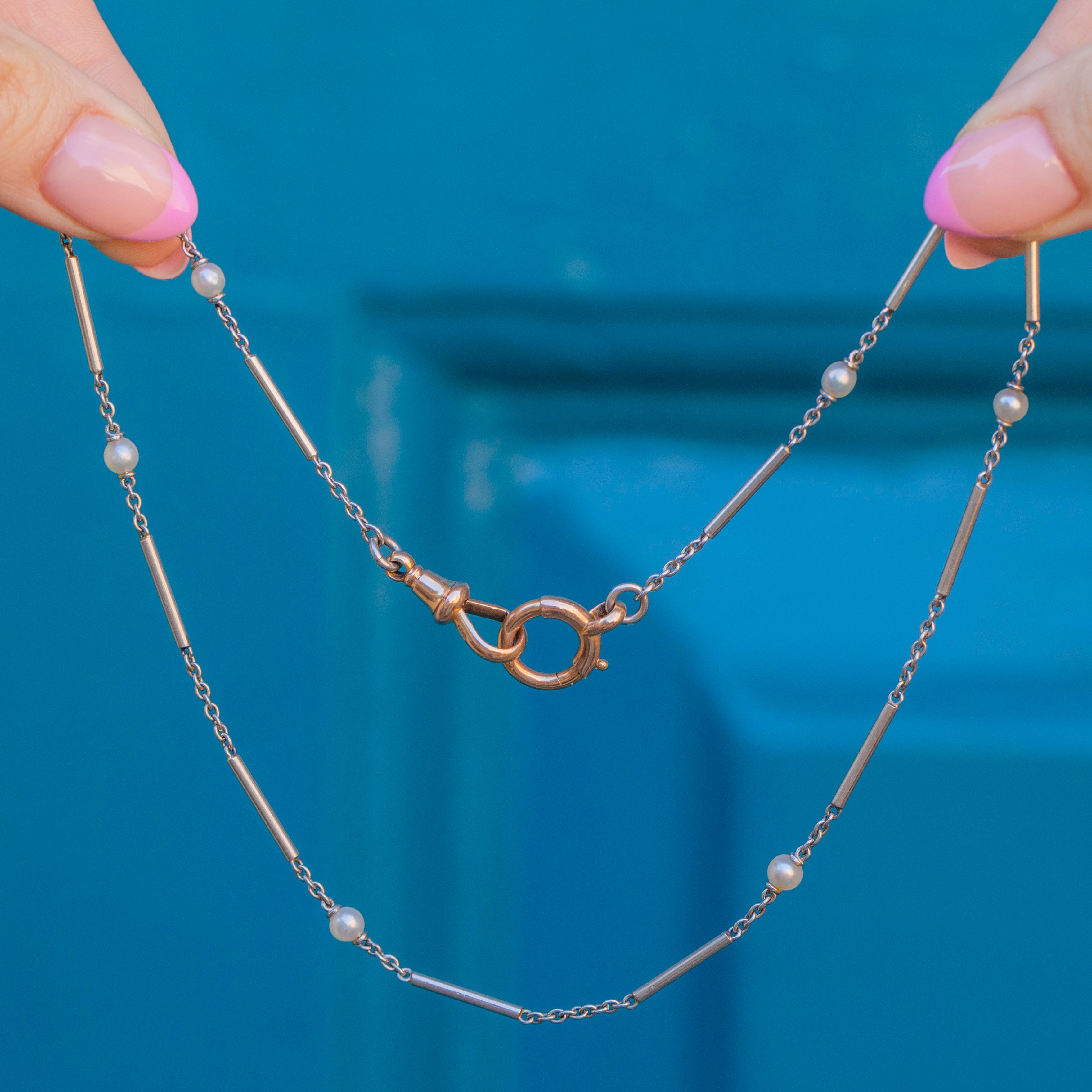 EXCELLENT. This 15" Edwardian Platinum Pearl necklace is in excellent condition. This chain has a lovely selection of Pearls present, smooth links and lovely antique Gold findings. The bolt-ring and dog-clip are in perfect working order and the necklace has lasted impeccably since the Edwardian era, making her a highly coveted piece!