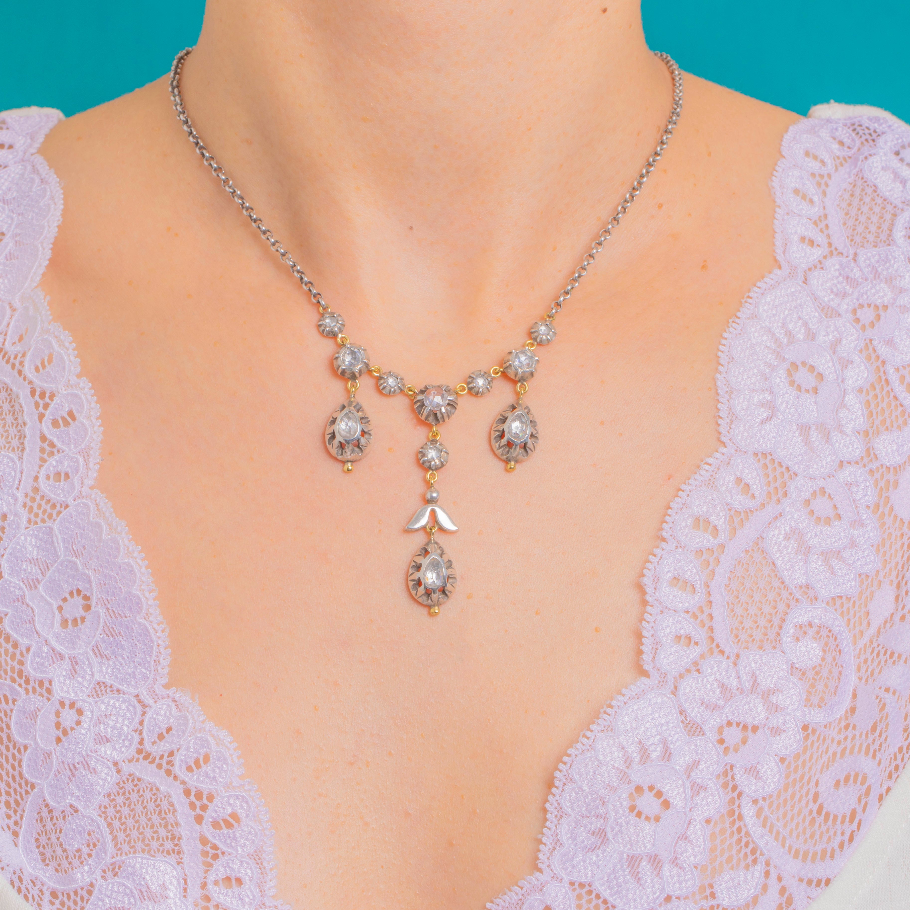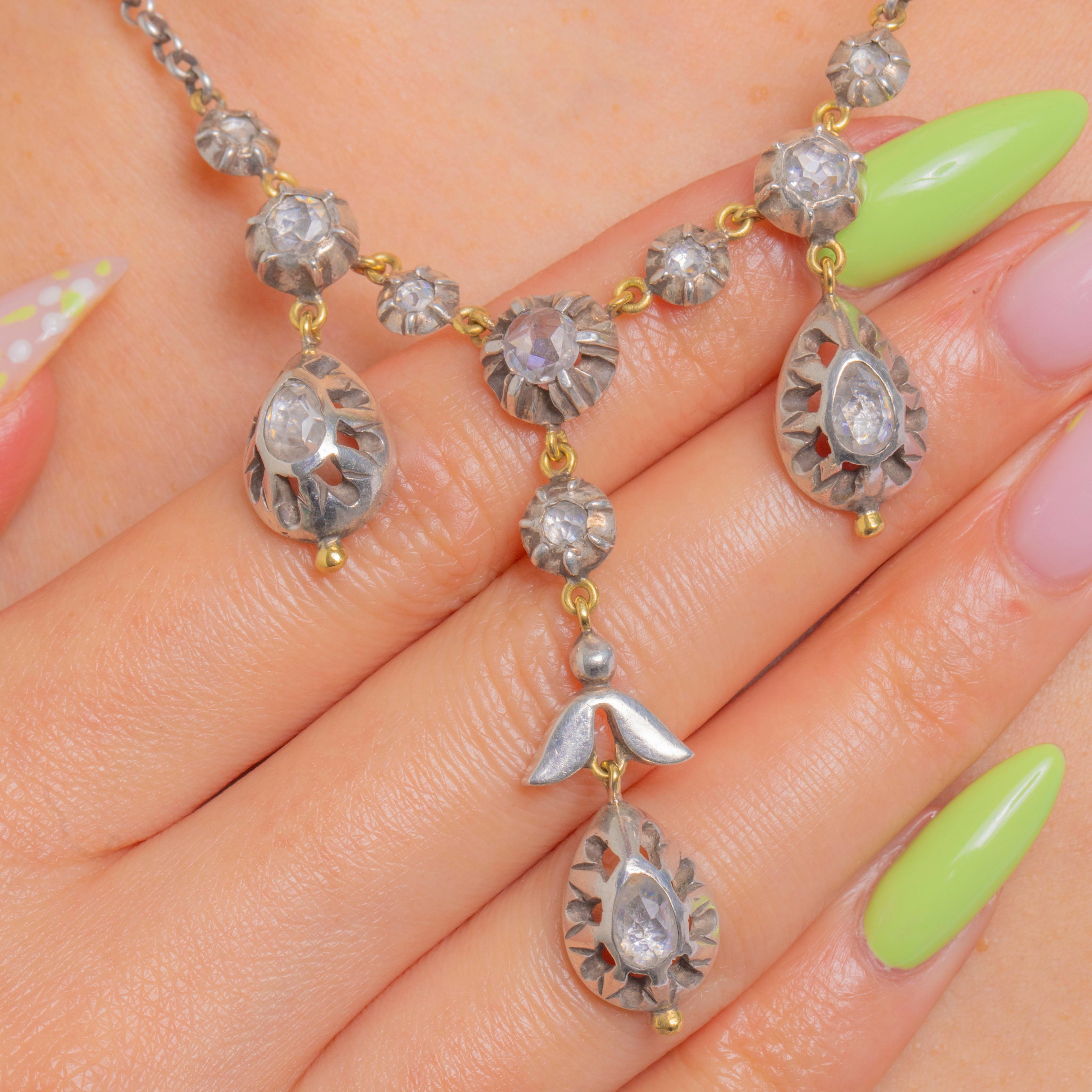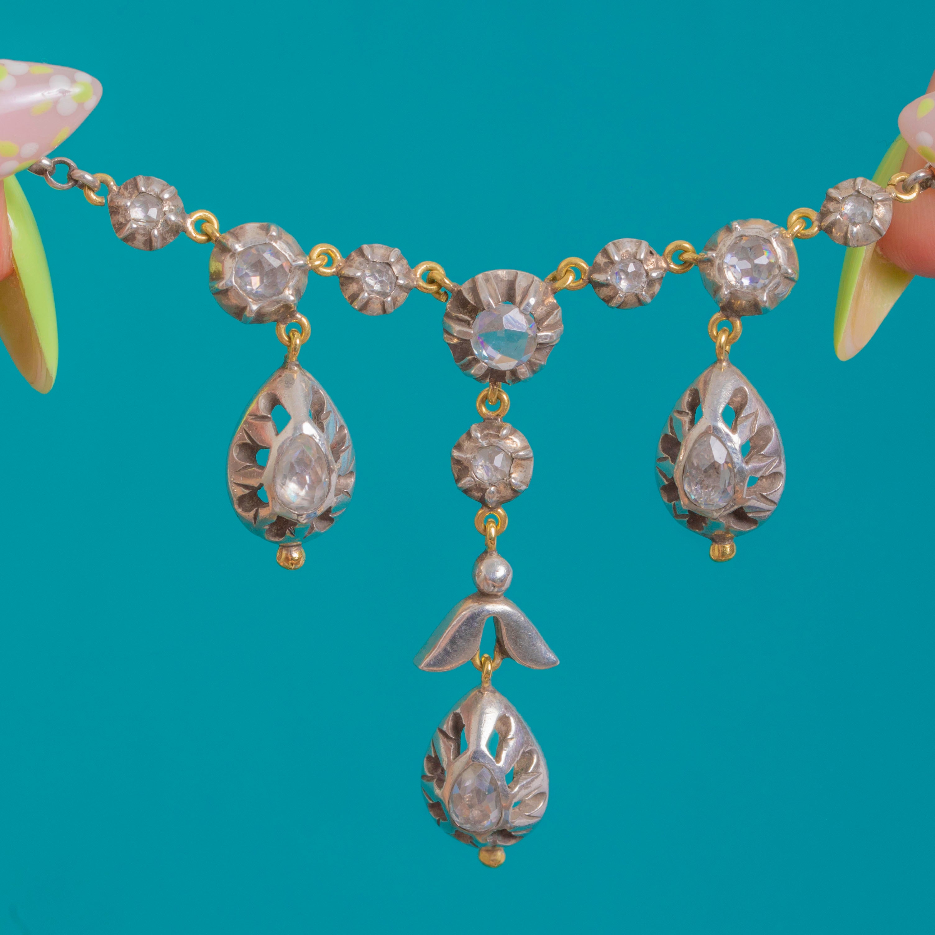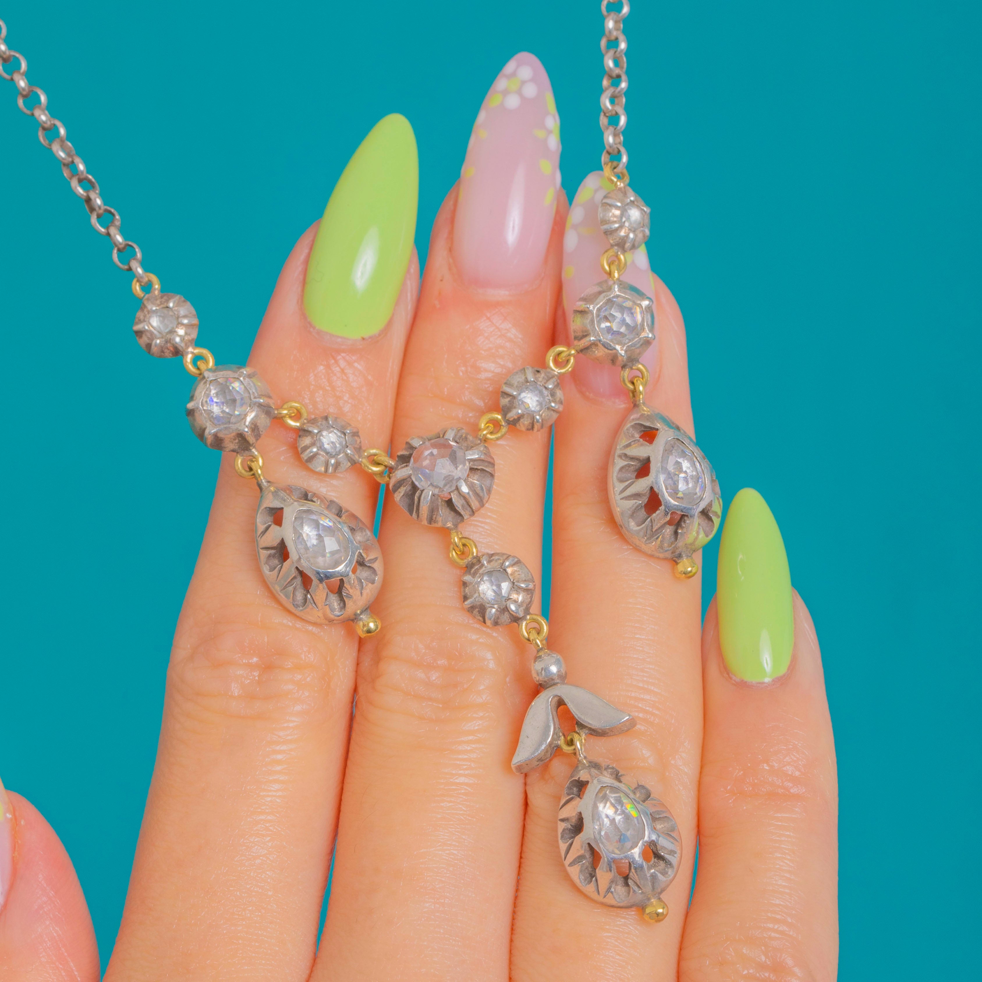 A luminous Georgian Rock Crystal lavalier in Silver, this antique treasure is as romantic as it is refined. A petite row of collet-set round crystals leads the eye to a graceful Y‑drop with three pear-shaped drops (the central delightfully tiered), all articulated so they sway and shimmer with every movement. Delicate rosette collets and pierced foliate details lend an elegant, botanical feel.