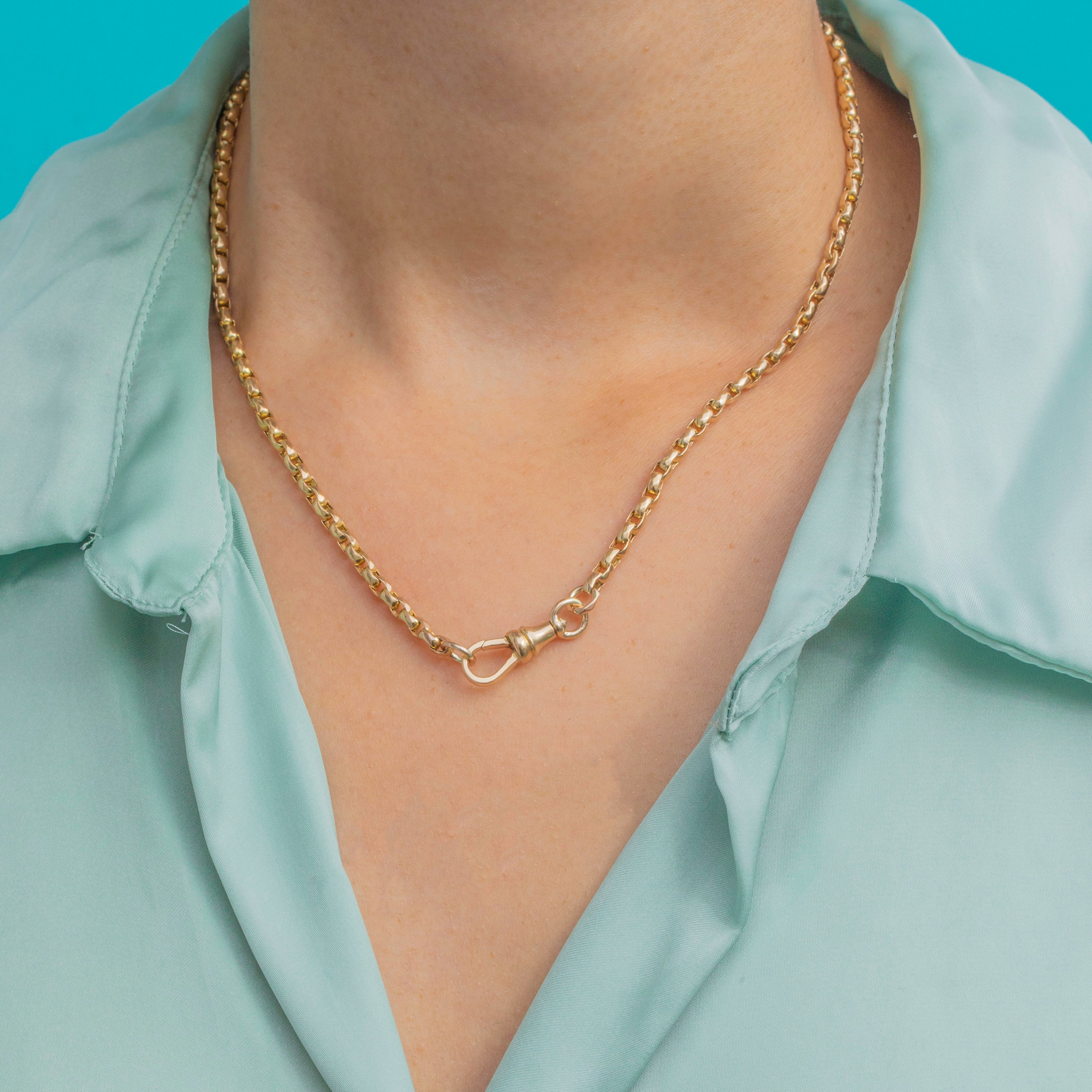 A beautiful Victorian faceted belcher chain crafted in solid 9ct Gold. Measuring 15" long, the chain is formed of 3mm wide faceted links that catch the light with every movement. It is finished with a substantial dog-clip clasp, making it both secure and versatile for pairing with pendants, lockets, or charms.