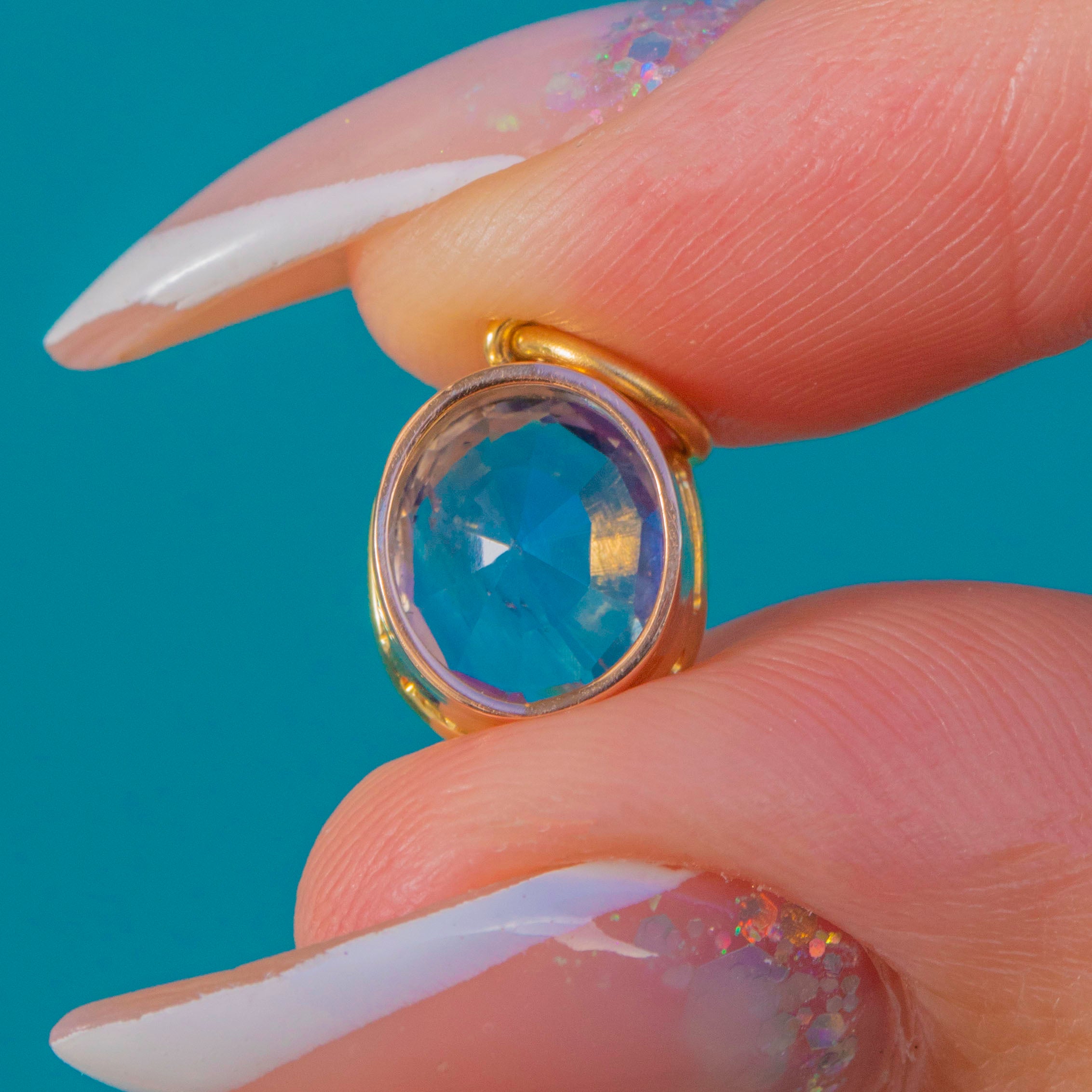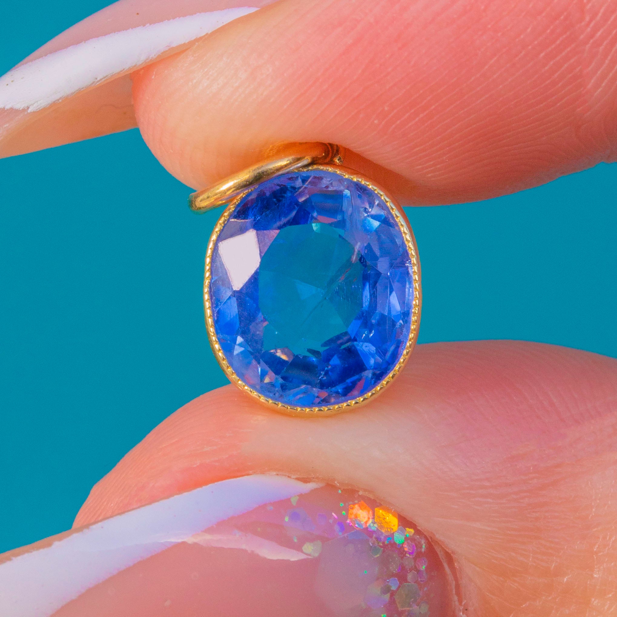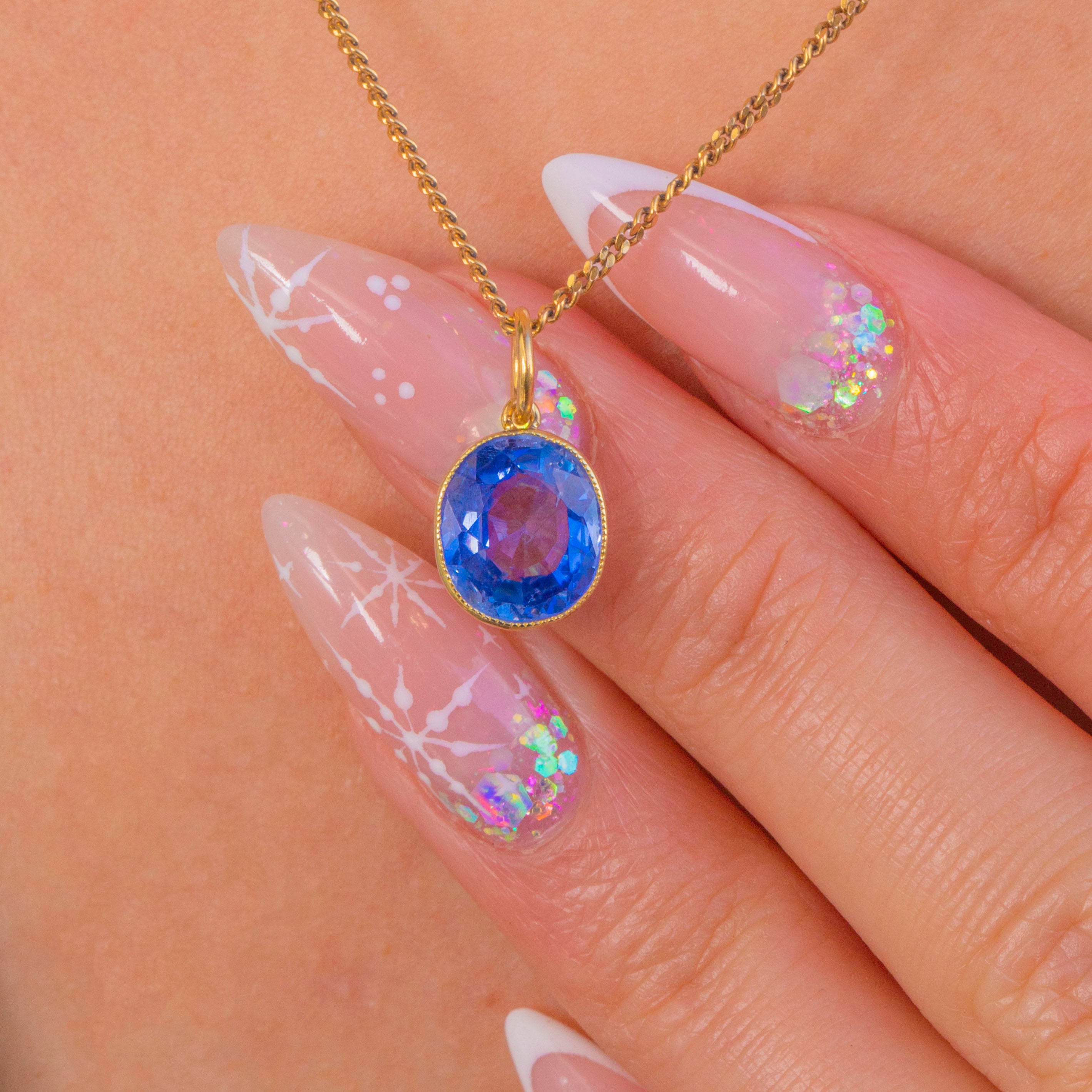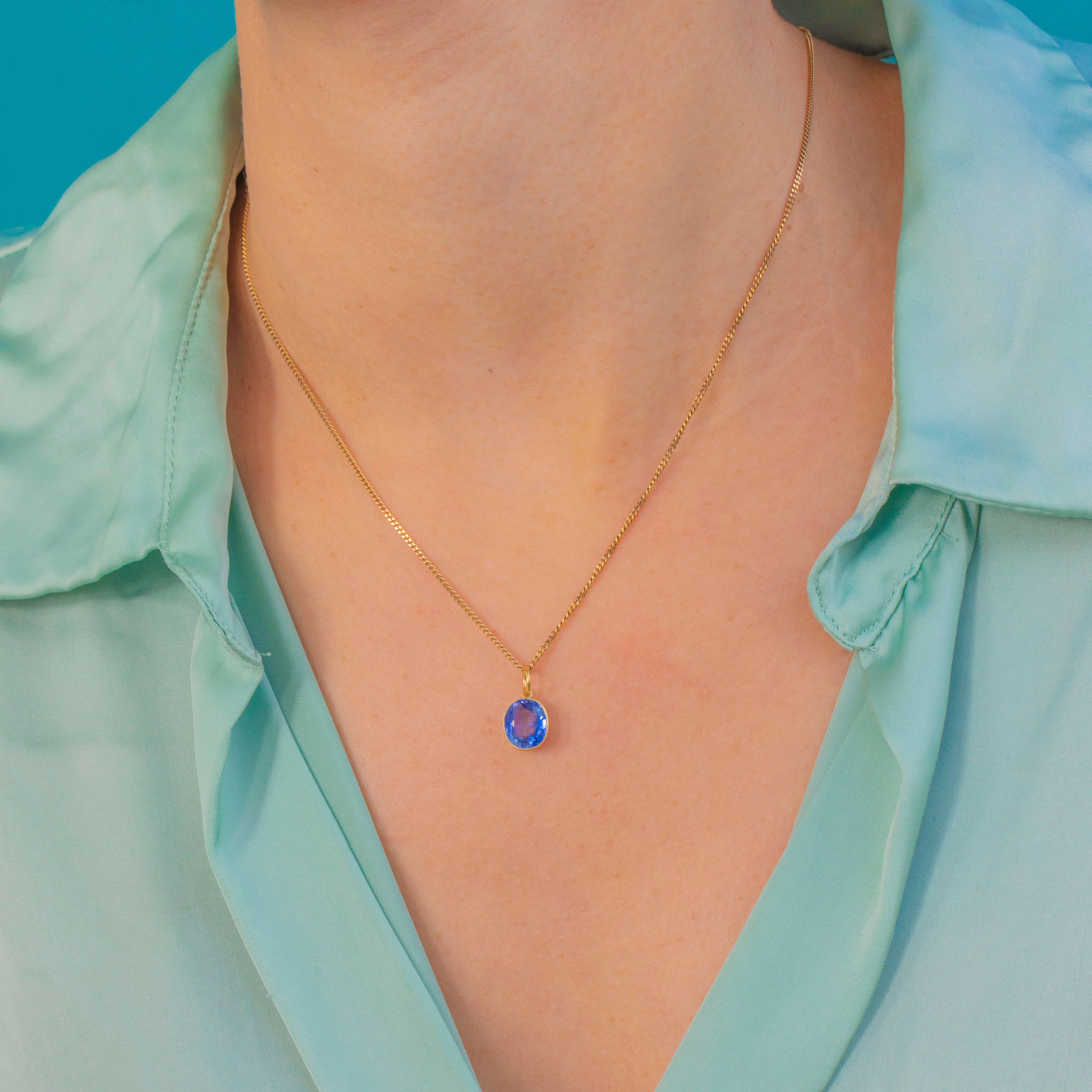 The Sapphire is secured in a 15ct Gold bezel and finished with an 18ct Gold jump ring, making it perfect for adding a luxurious pop of colour to your favourite antique chain or charm necklace.