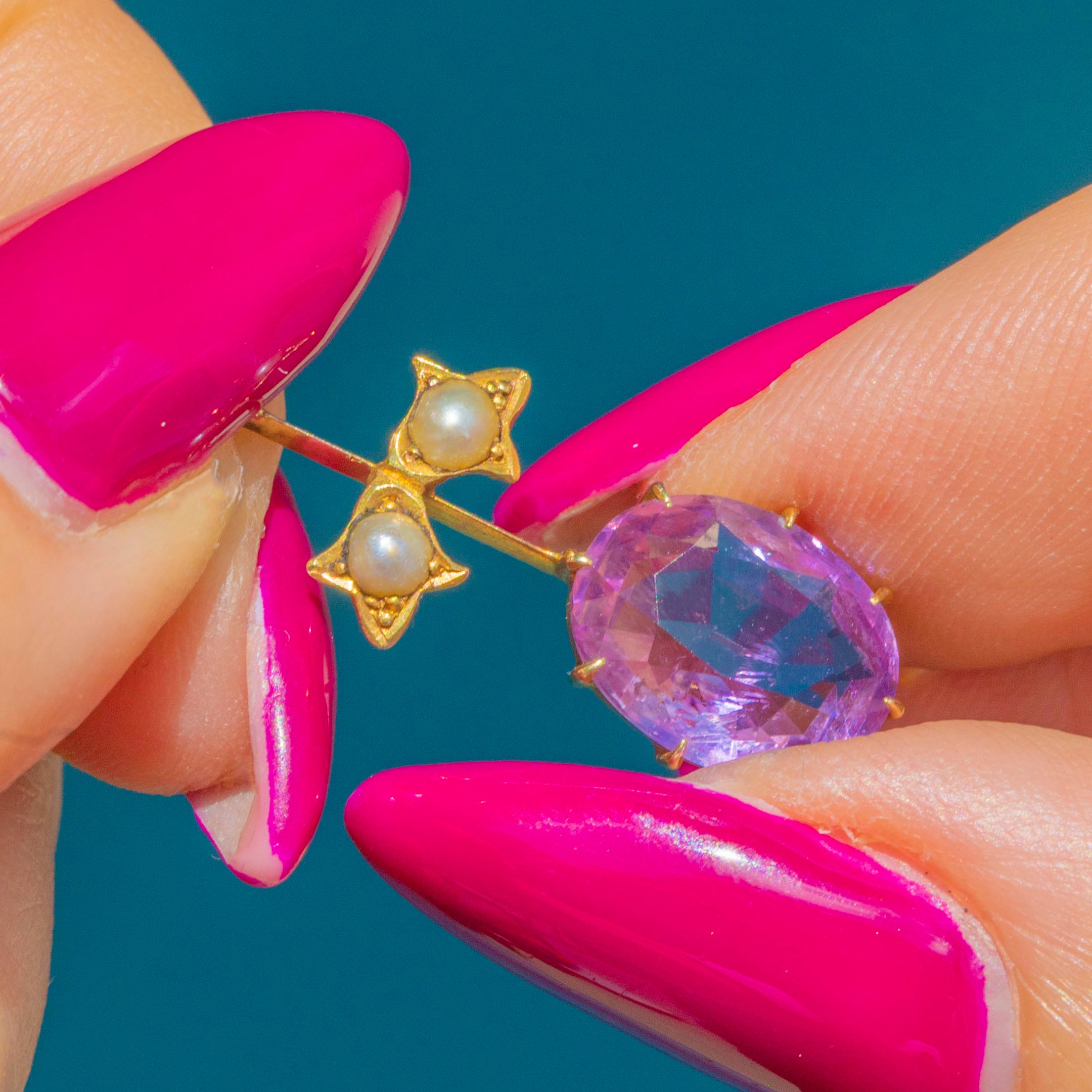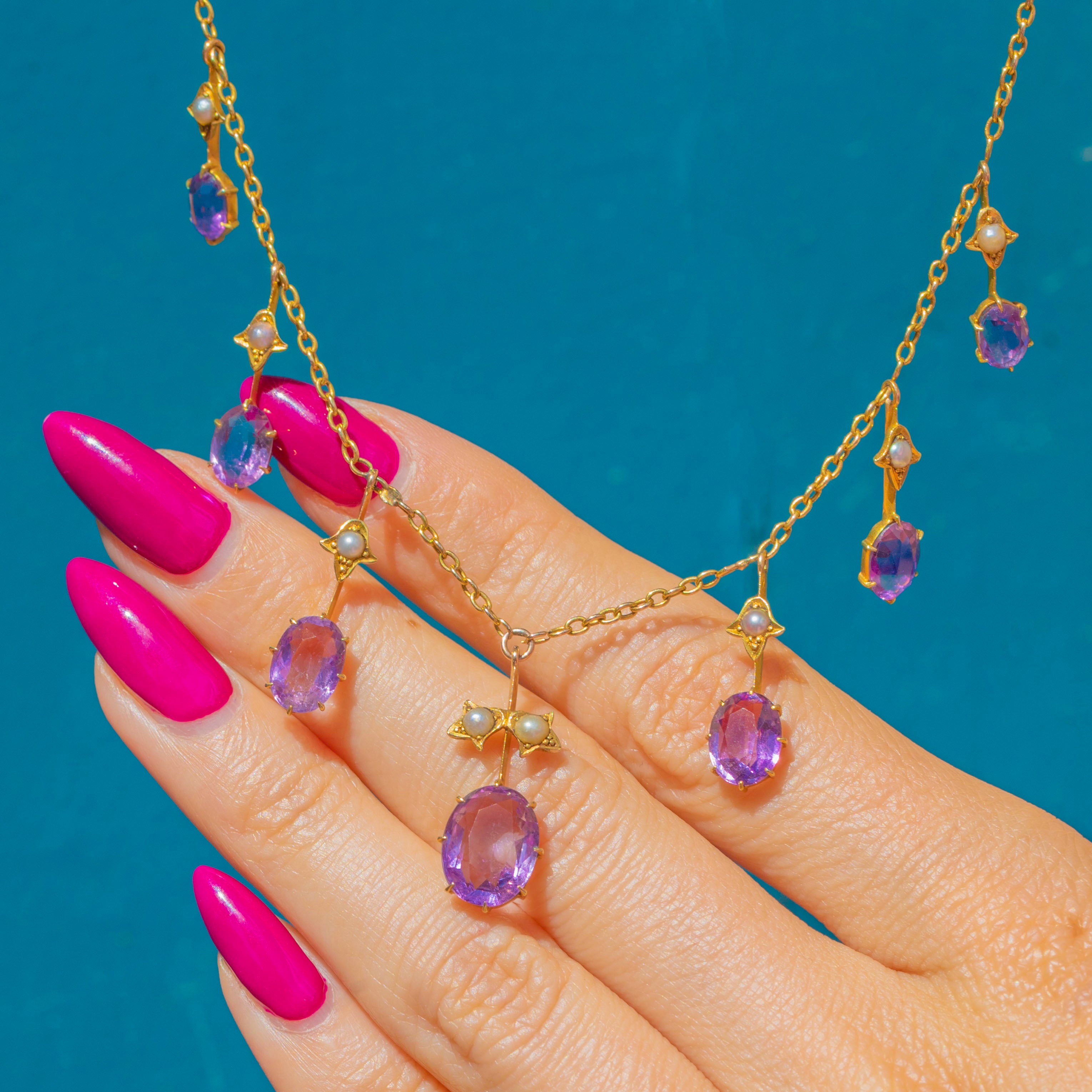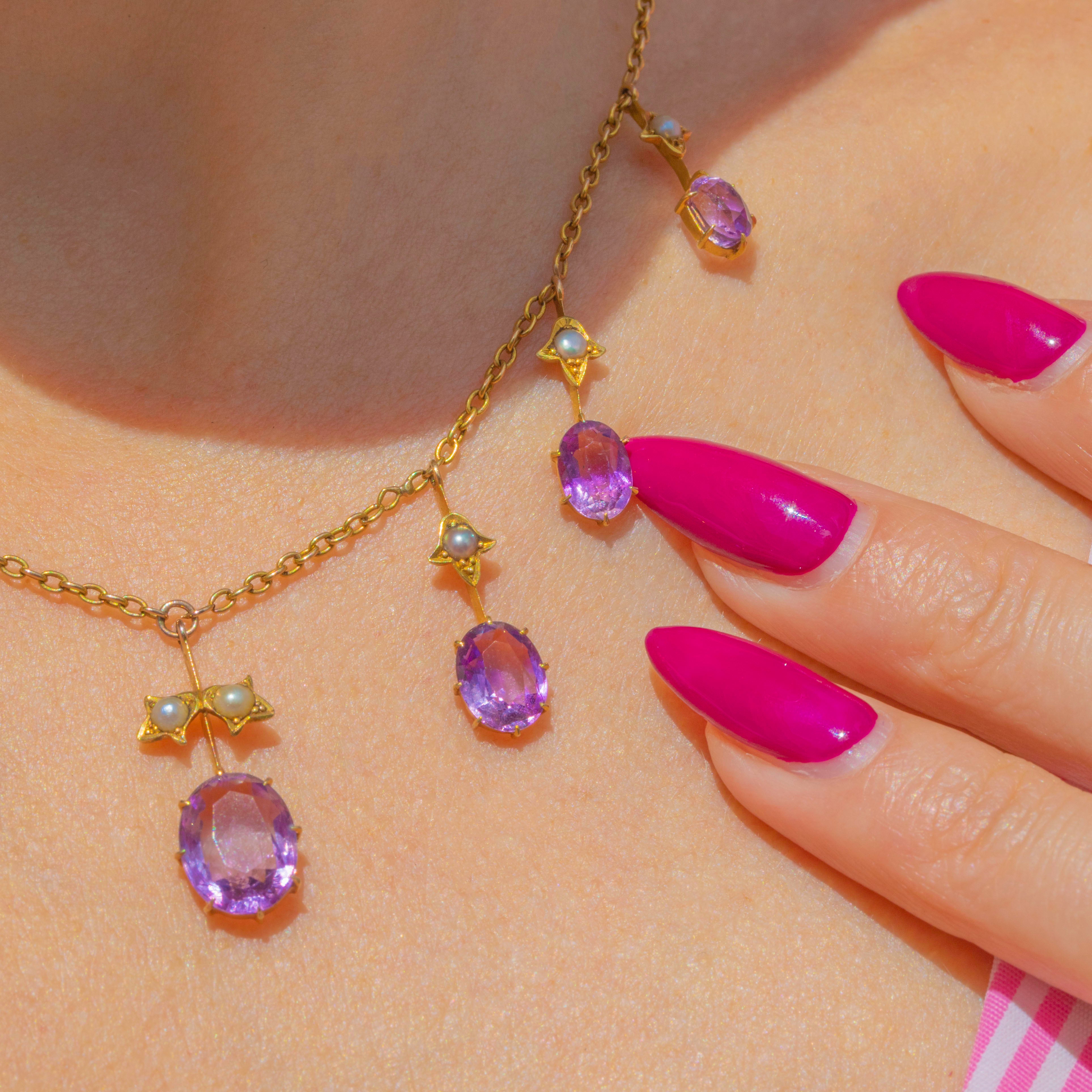 This spectacular Victorian fringe necklace glows with 4.70ct of soft “Rose de France” Amethysts and natural Seed Pearls, all set in rich 15ct Gold. The feminine pastel tones and refined fringe design are classic of the late 19th century, finished with an oversized bolt-ring clasp for that true antique look.