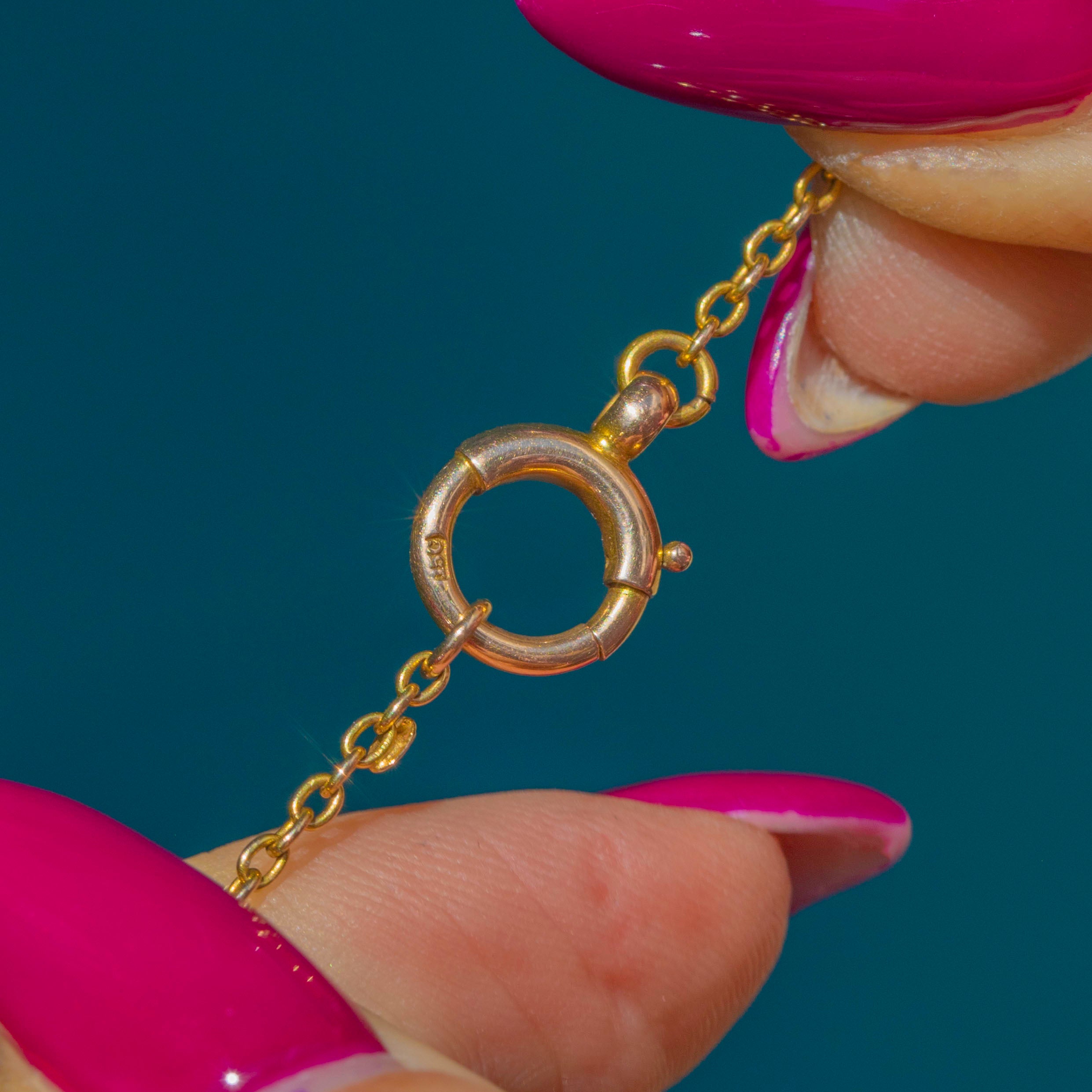 STAMPS: “15CT” tag on chain, “15CT” on bolt-ring clasp.