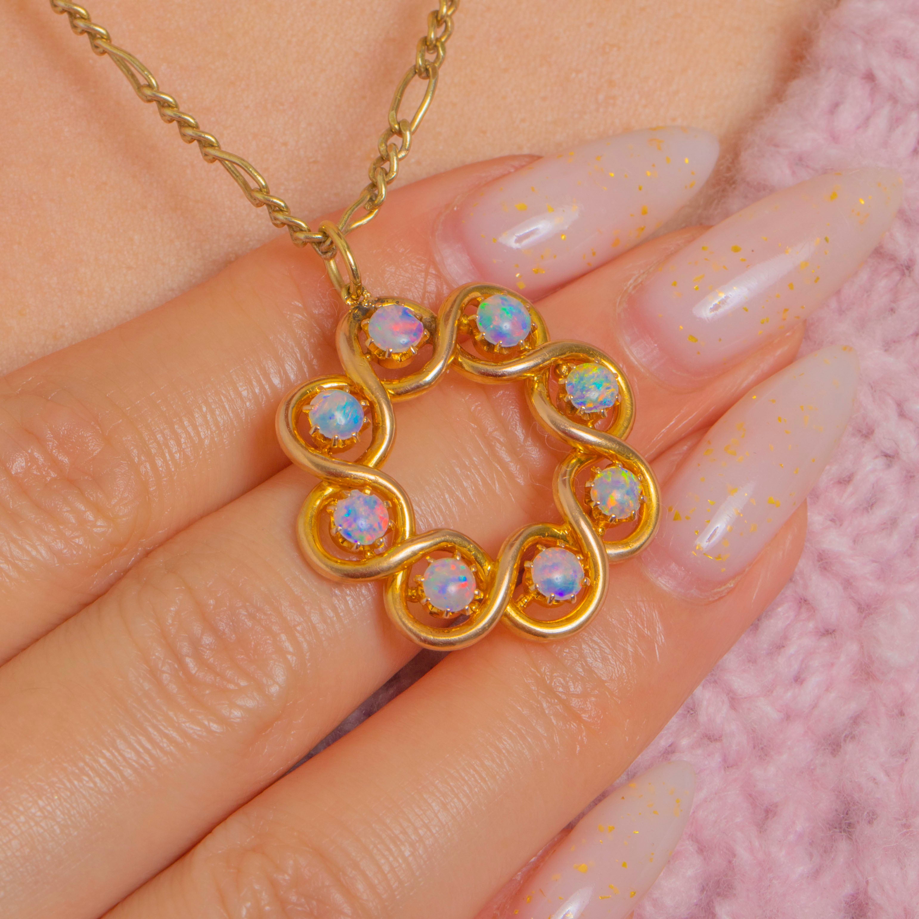 A delicate Victorian Opal roundel pendant crafted in glowing 15ct Gold. Formed as a graceful open wreath, a fluid Gold ribbon curves into eight perfectly spaced collets, each set with a round cabochon Opal that shimmers with blue, green and pink flashes.