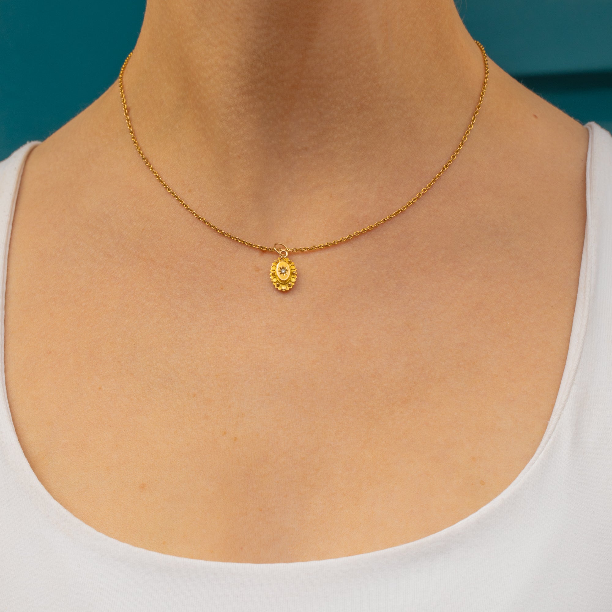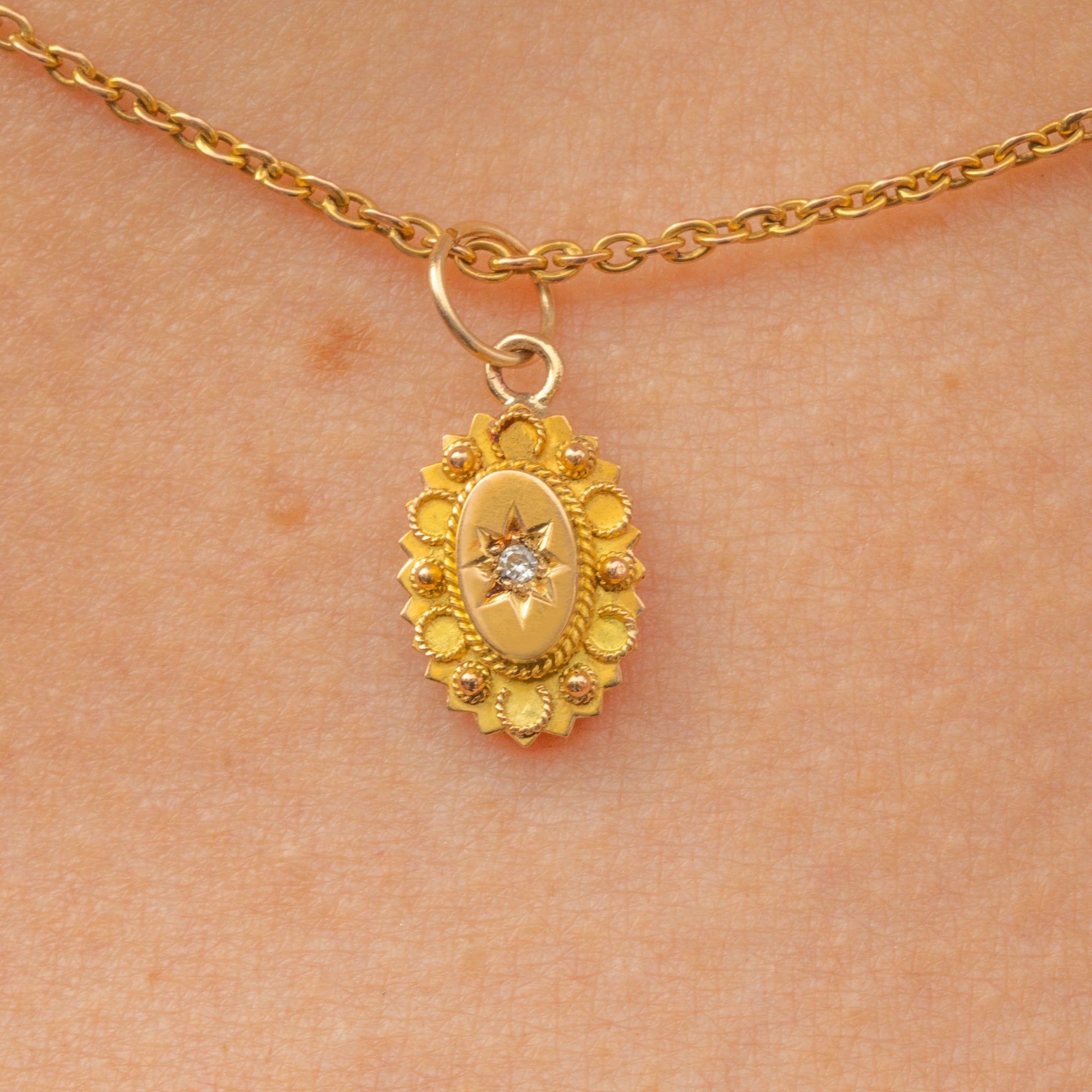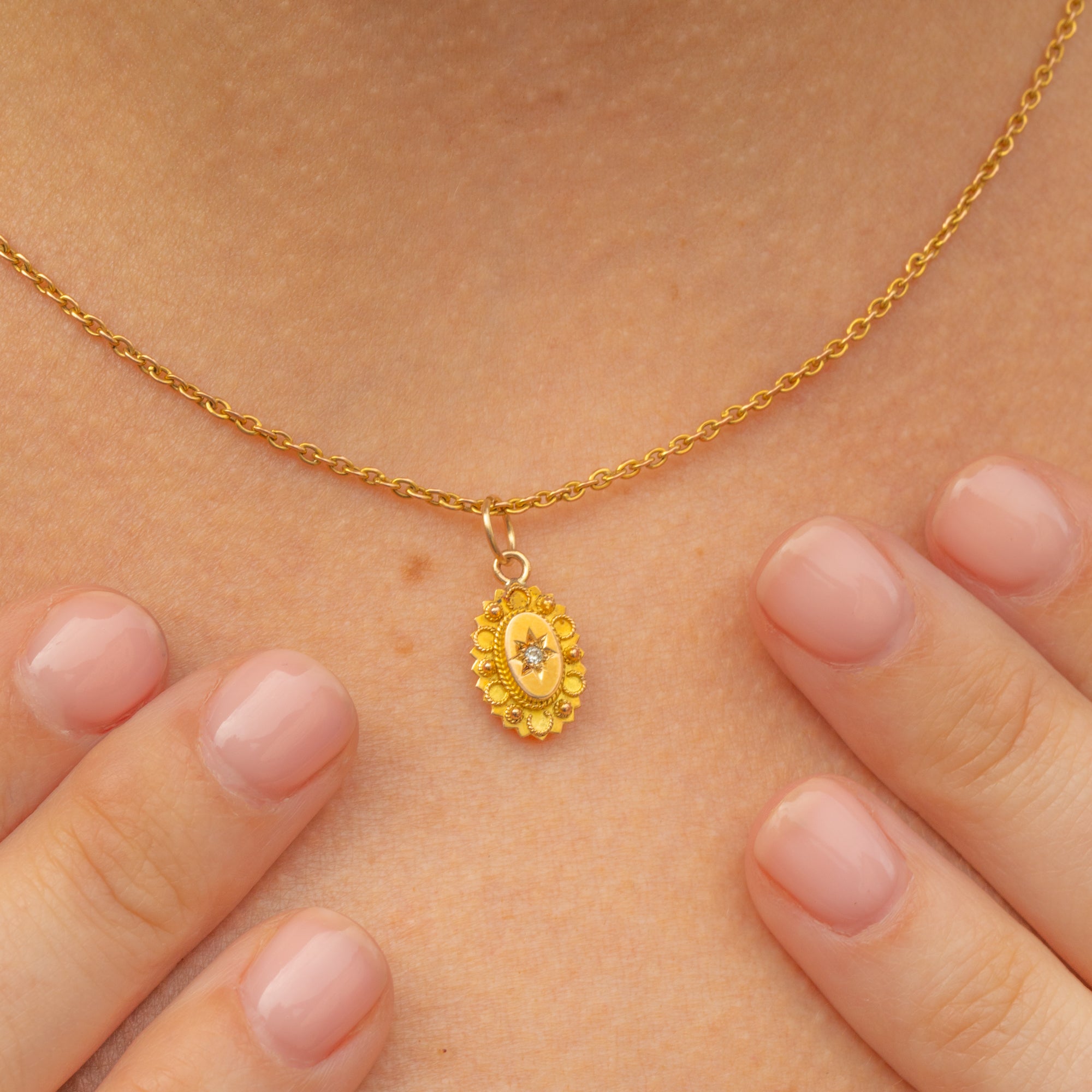 This 15ct Gold Diamond oval Etruscan charm is a lovely petite pendant to have in your jewellery box! This piece is made from solid 15ct Gold throughout, and features a star-set Diamond at the centre.