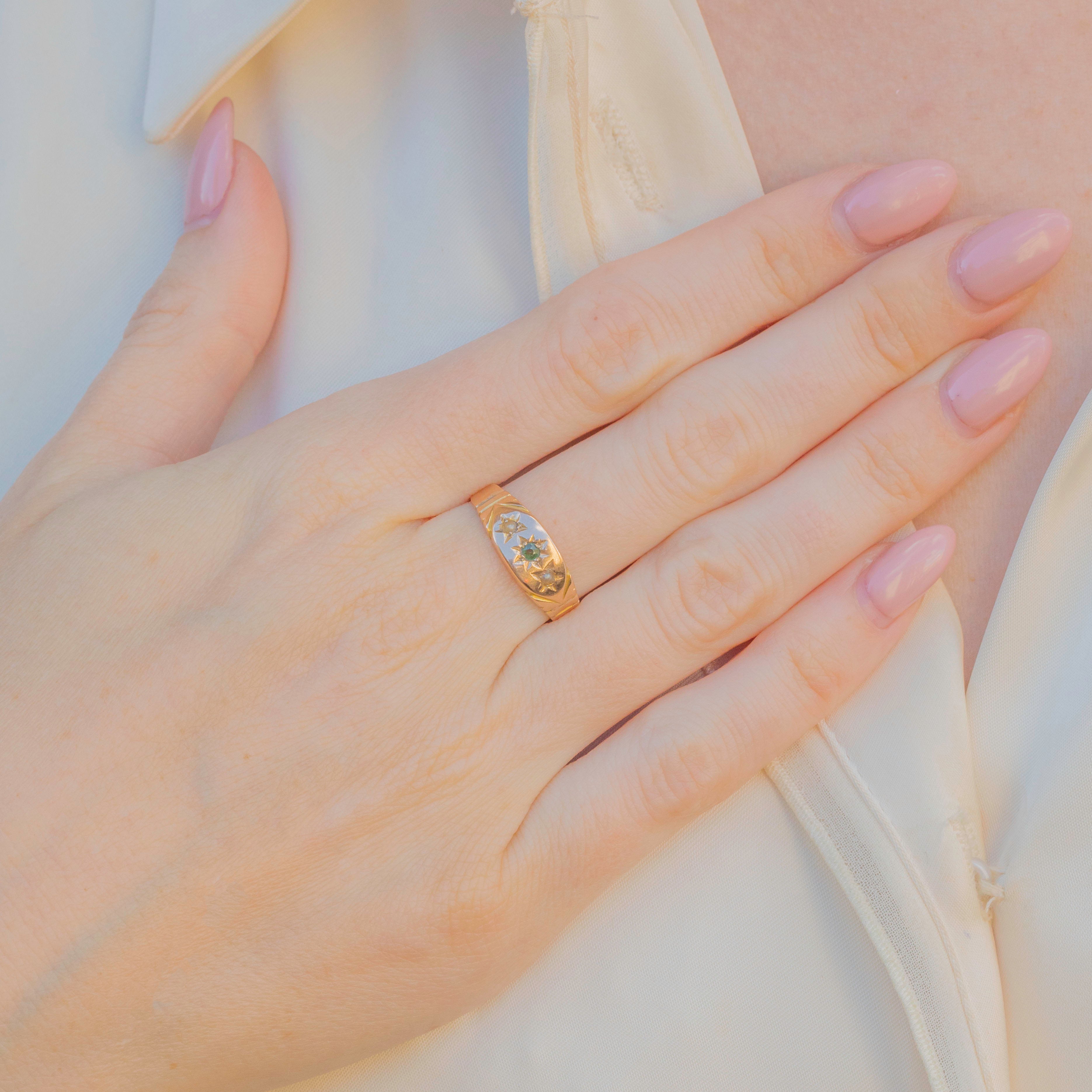 EXCELLENT. This lovely 15ct Gold Emerald and Pearl gypsy ring is in excellent condition! The gemstones are securely set and free from damage and the Gold is bright with a wonderful sheen. The band is fairly thin, but this is as intended, and has a full set of chunky antique hallamrks inside- what a treat!