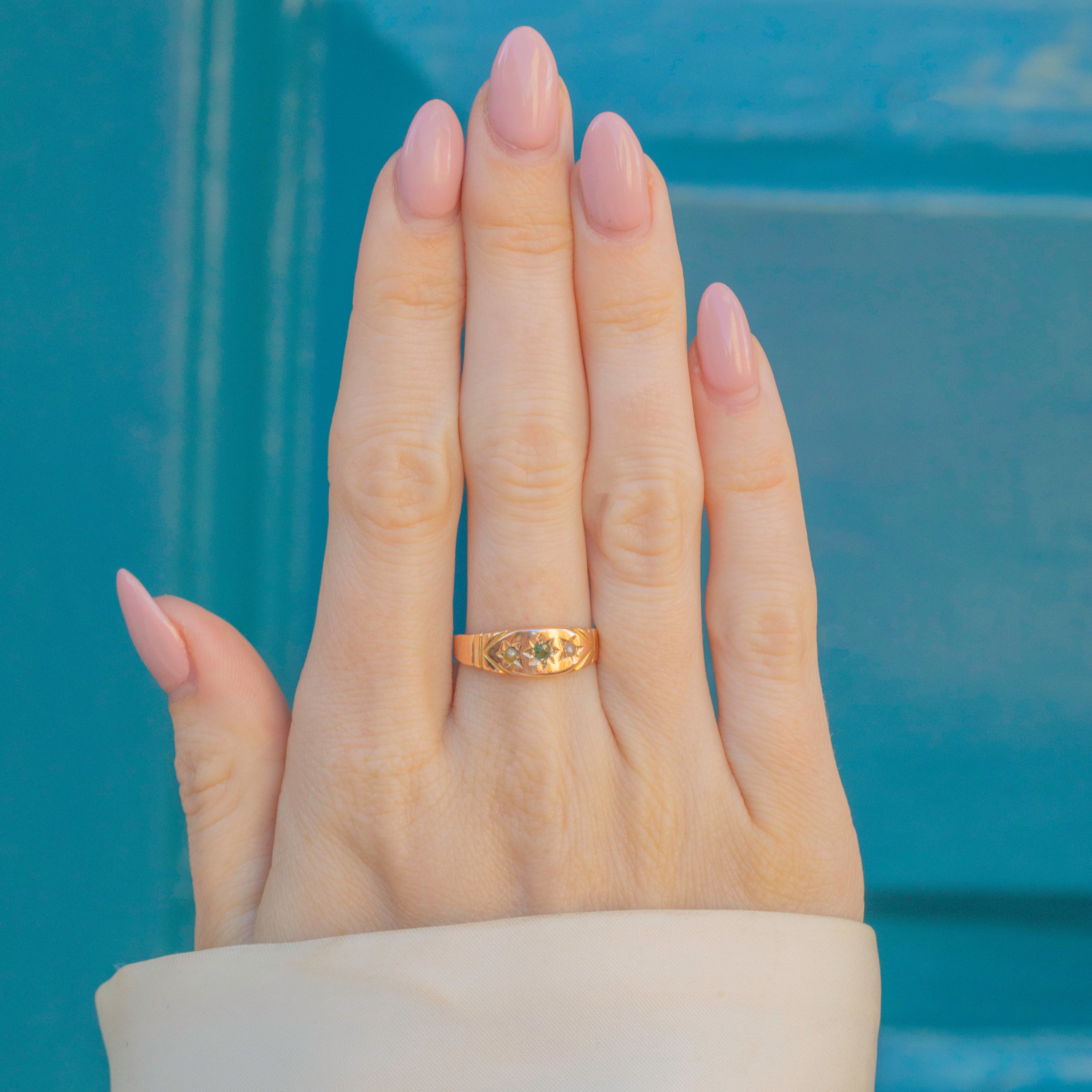 The trio of delectable gemstones sit prettily in star settings, lending this Victorian gypsy ring a celestial charm. Emeralds are rare in rings like this, making her stand out from the rest, flanked by shimmering Pearls.