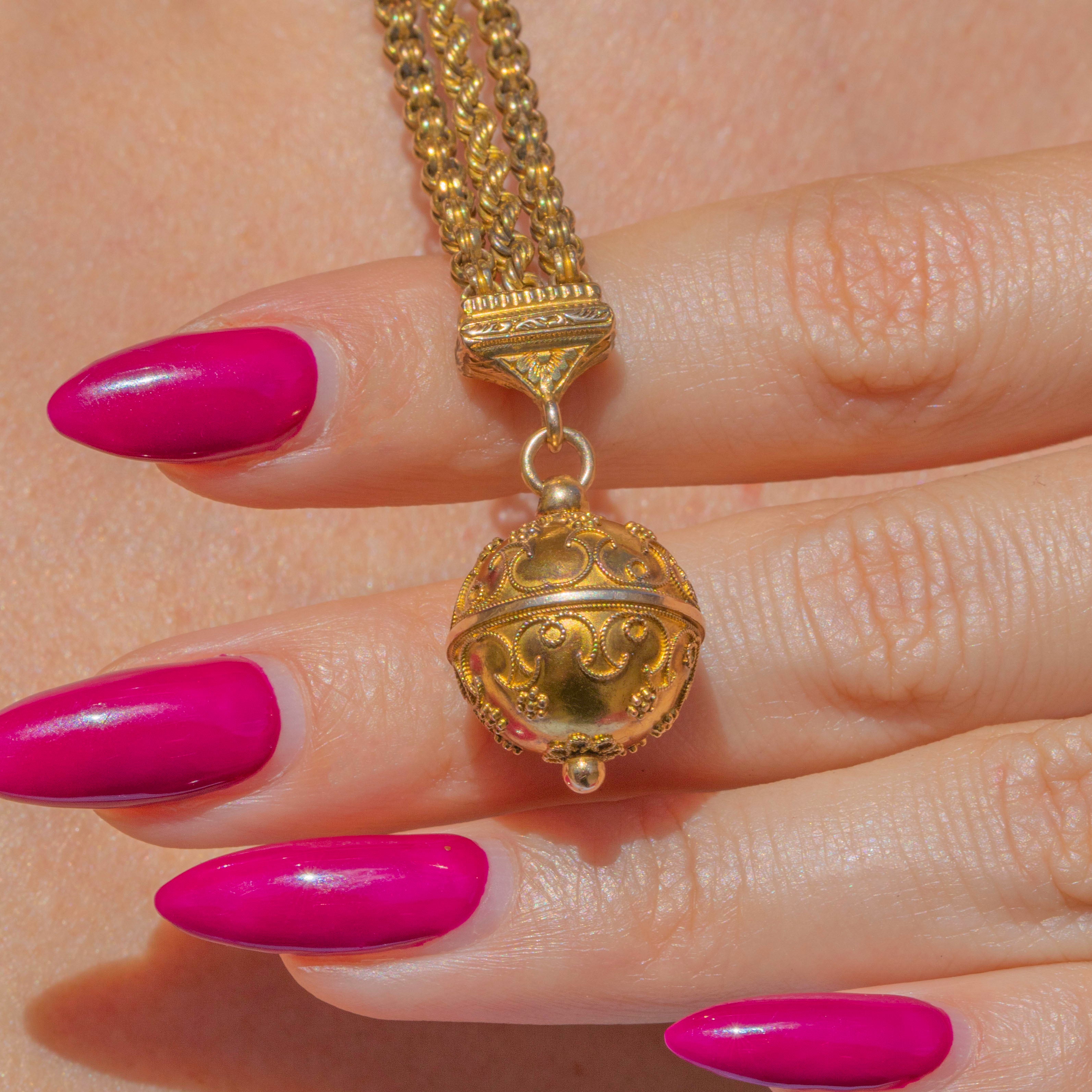 This 15ct Gold drop pendant exudes Victorian allure, featuring a large orb charm with detailed baroque-style engravings. It's a true celebration of Victorian craftsmanship!