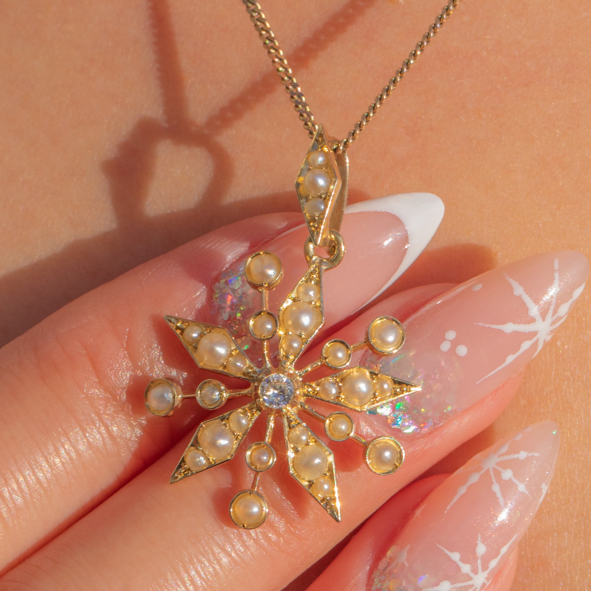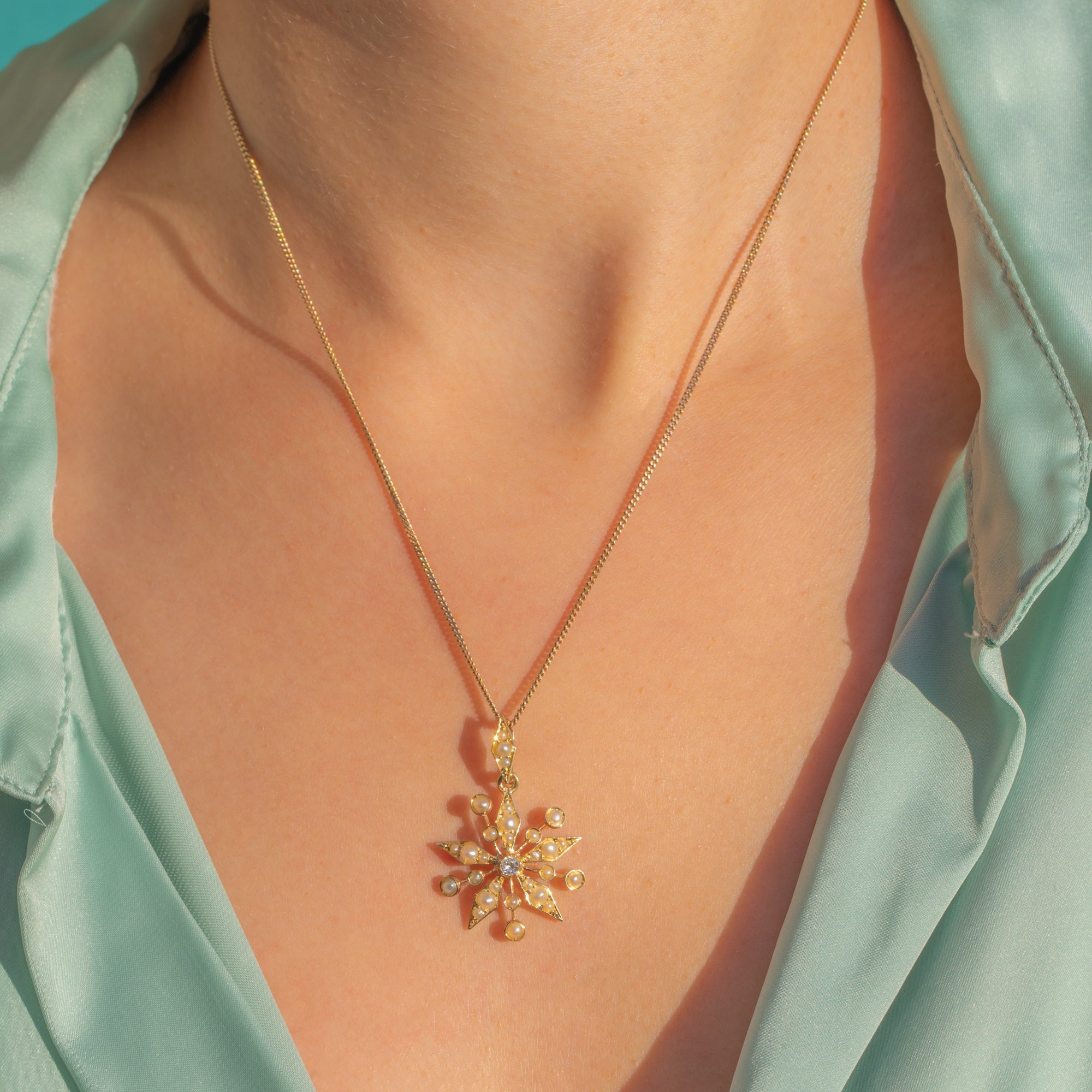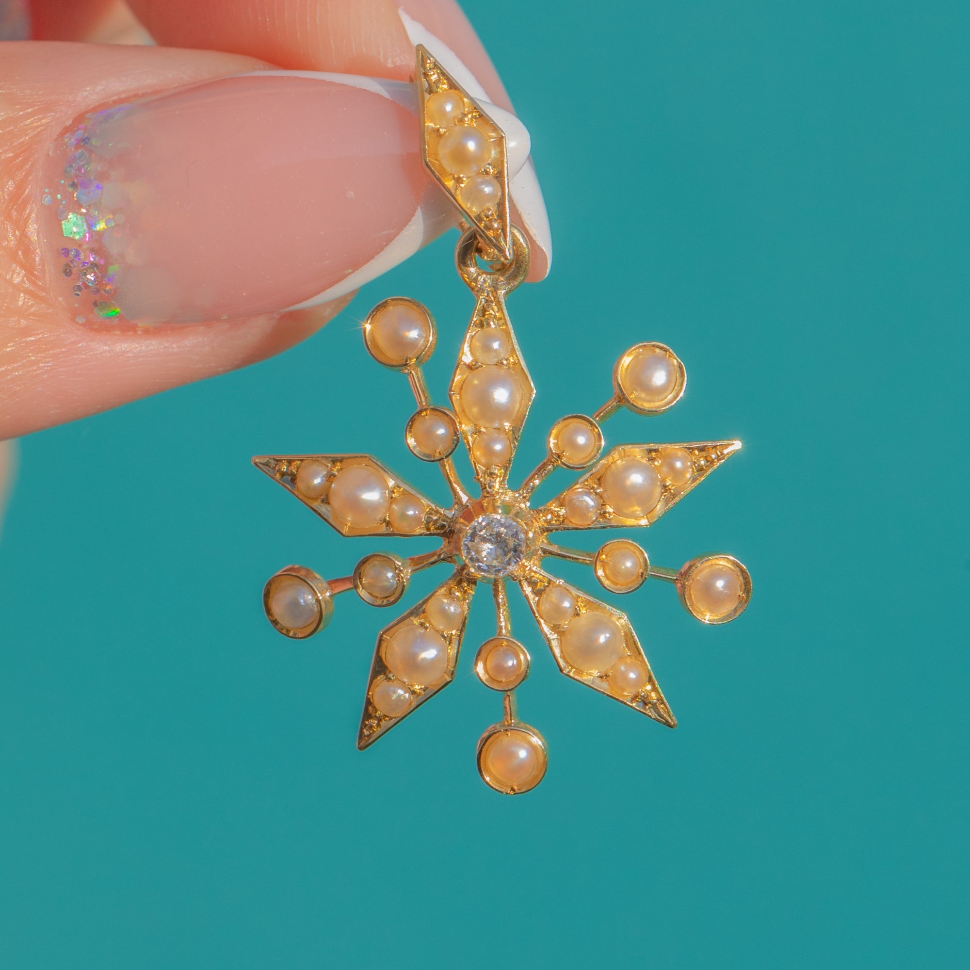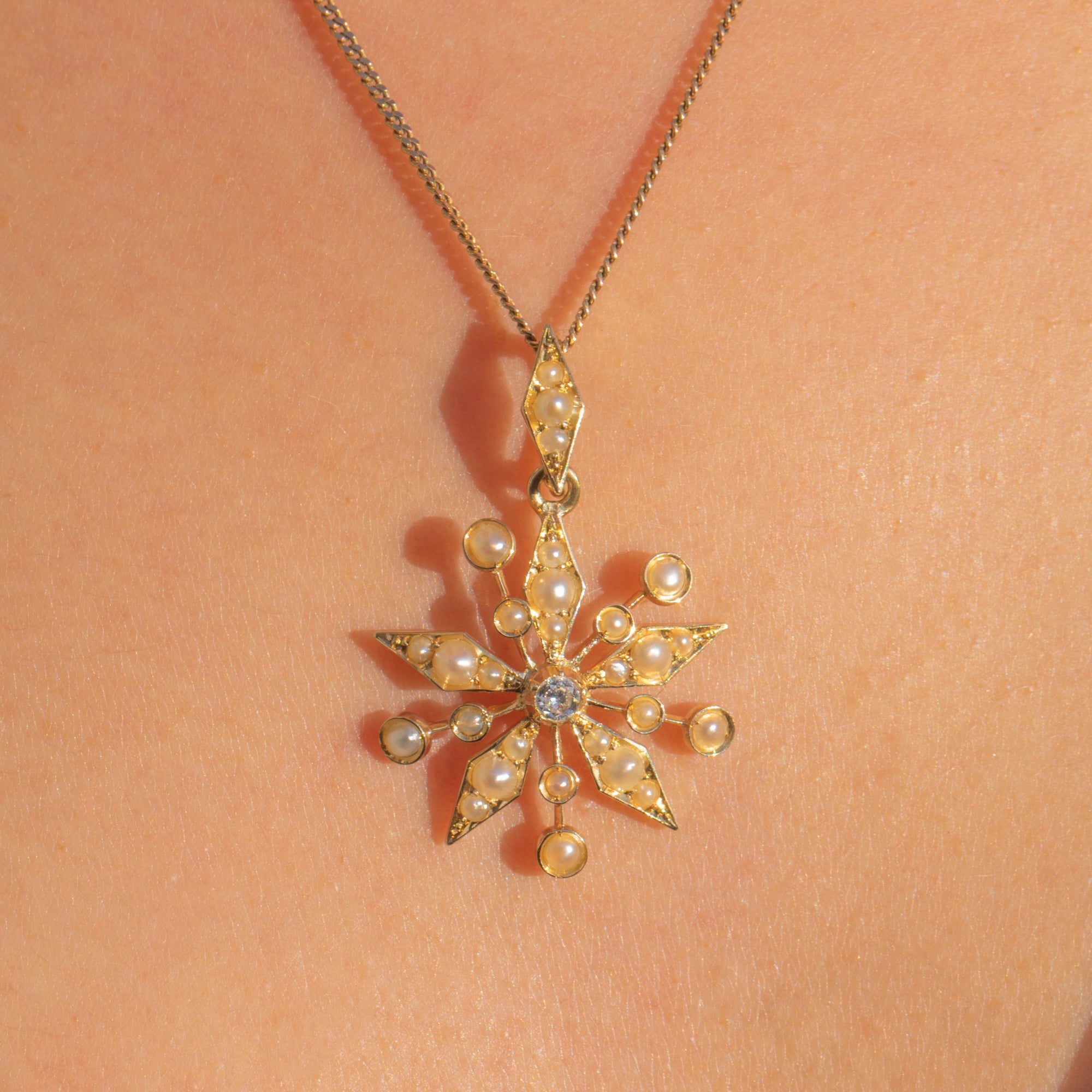 This exquisite Victorian snowflake pendant is crafted in rich 15ct Gold and set with luminous natural Pearls surrounding a sparkling 0.10ct Diamond. The crisp, radiating star design has wonderful presence on the neckline, with each petal and bead-like arm catching the light beautifully as you move.