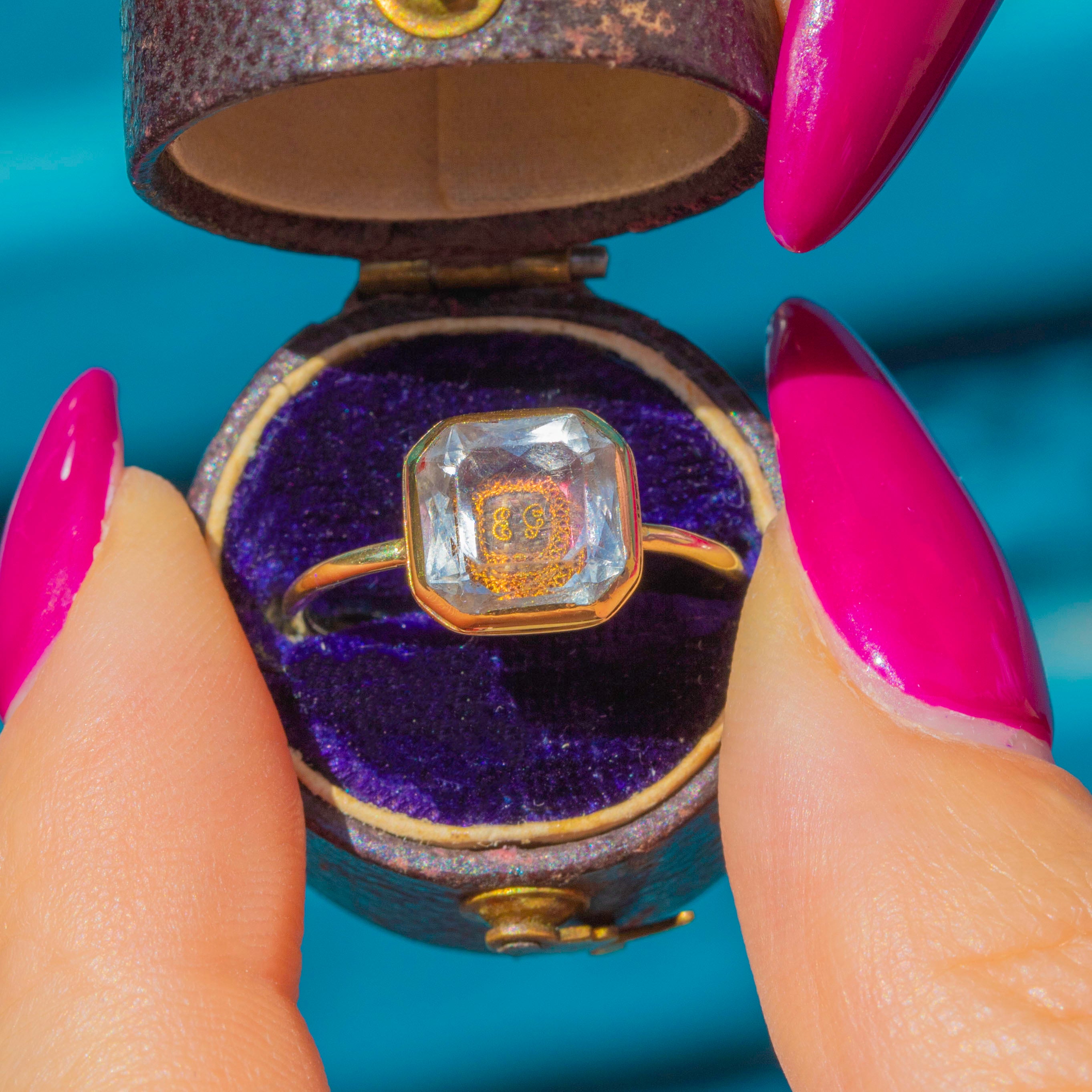 VERY GOOD: We think this piece was once a stick pin, and has been given a new lease of life as a much more wearable ring! The Rock Crystal is crisp and has only a few little scuffs on its edges. The Gold wire cypher has remained in good shape, and the pink foil still pops, although it has become slightly less vibrant over the years. The ring band is smooth, circular and glides onto the finger with ease, with the domed back setting of the Rock Crystal making her comfortable to wear.