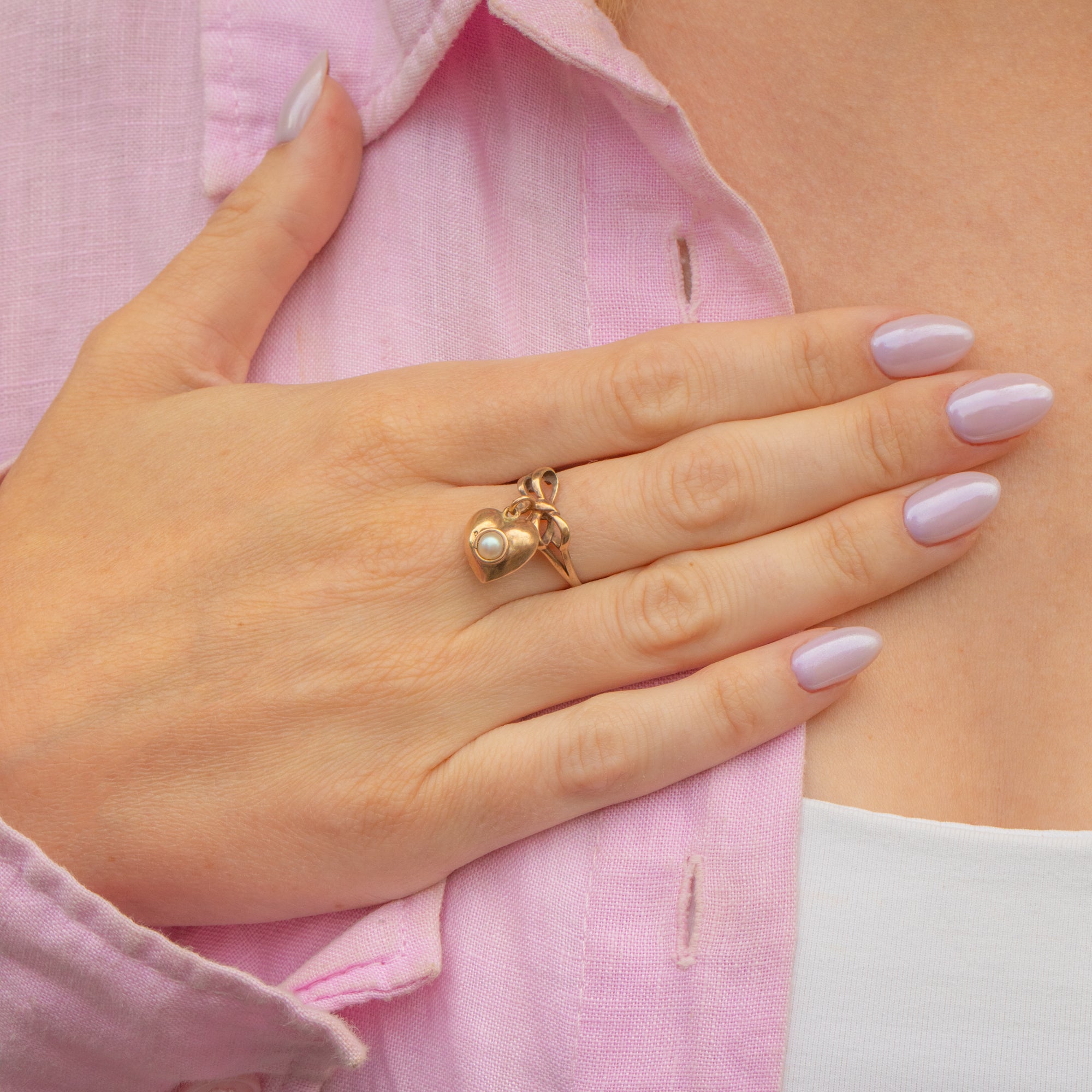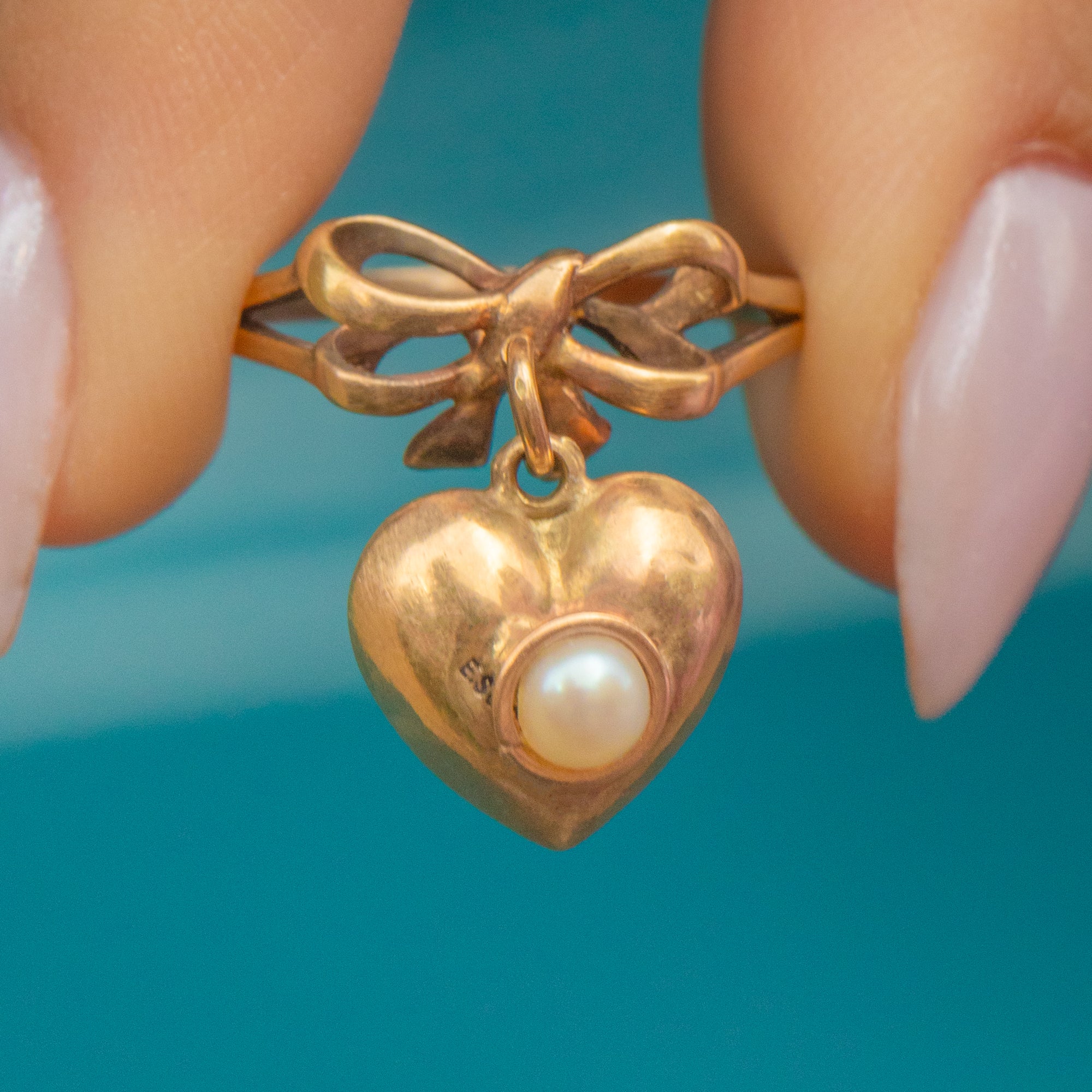 VERY GOOD. This mid-century vintage 15ct Gold ring is in great condition! Her band is delicate but well-formed, and the charm sits securely beneath the ring. The Pearls are securely set within the charm, and though there are minor signs of wear, this goes unnoticed during wear. The Gold is buttery with lovely reflective qualities and the puffy heart charm is free from dings or dents. This vintage Pearl ring is a treat!