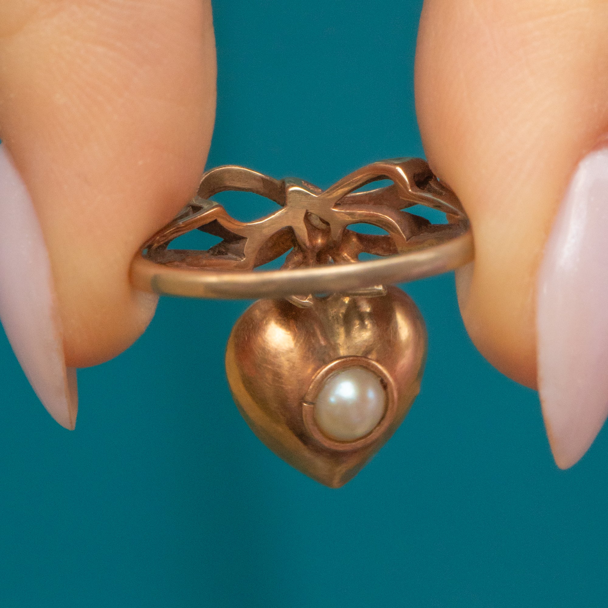 Crafted from sumptuous 15ct Yellow Gold, her elegant design wraps gracefully around your finger with the delicate bow design resting centrally. Featuring a heart charm, ribbon face, and a majestic Pearl on either side, this vintage ring exudes style and is a real eye-catching piece!