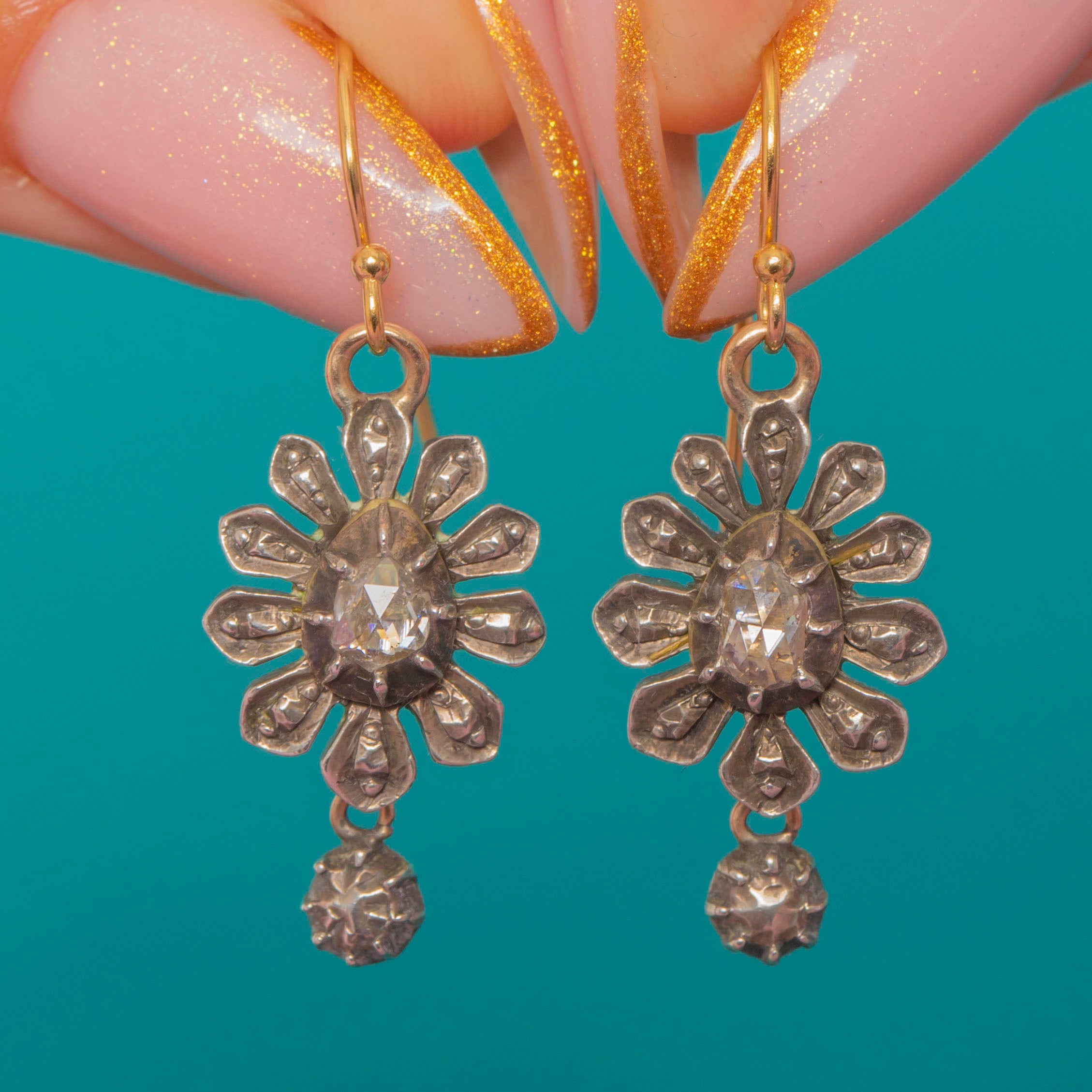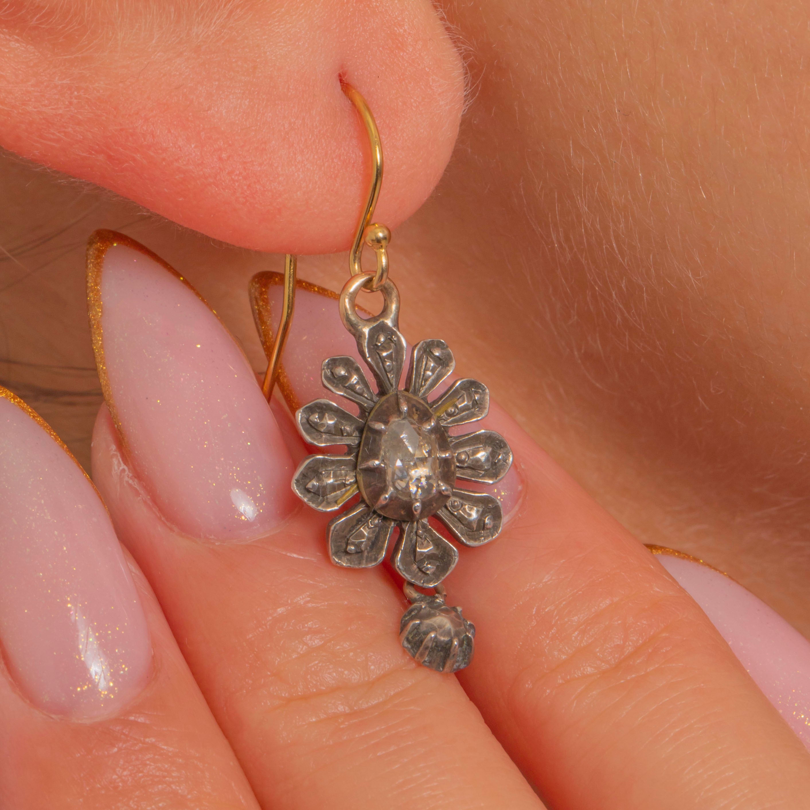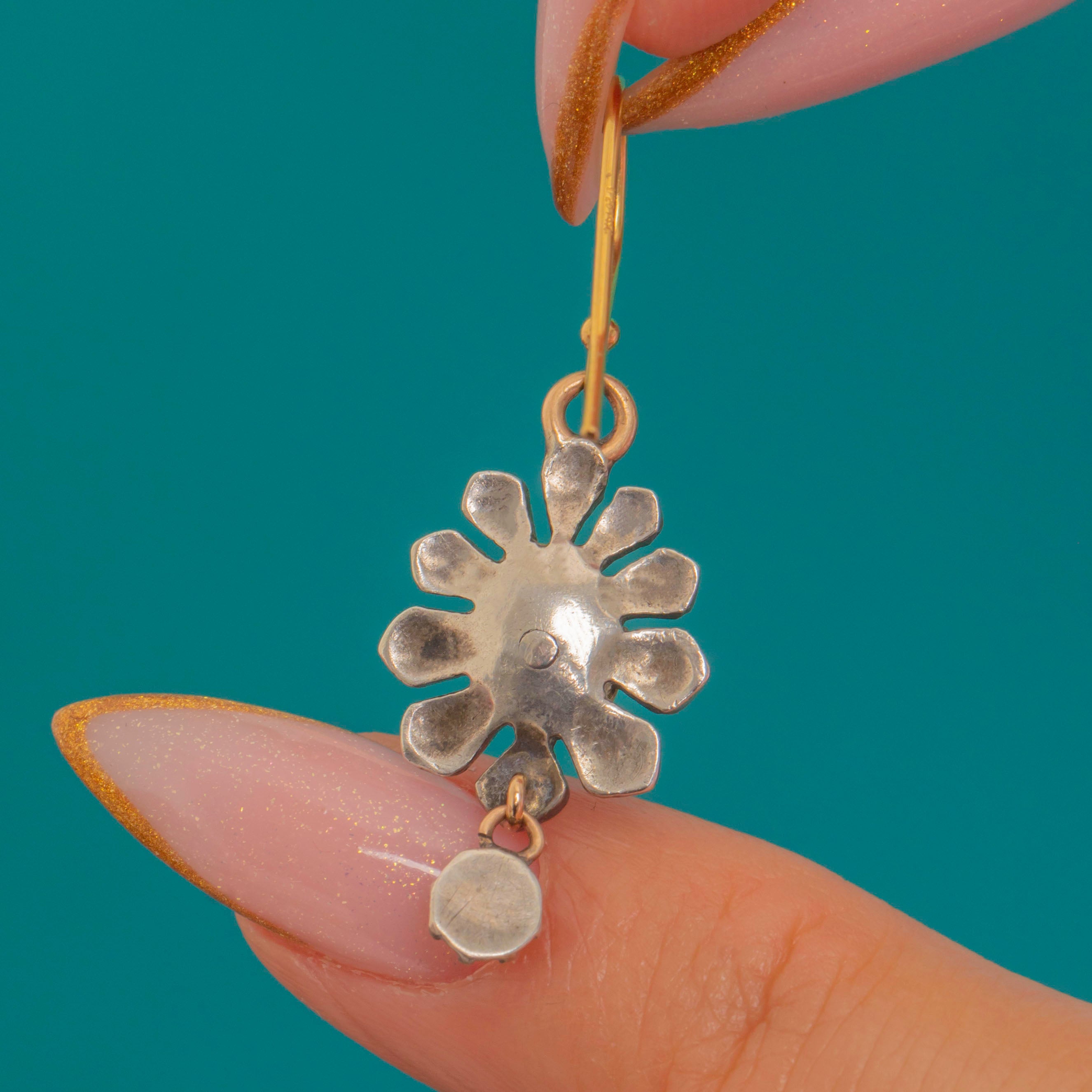 Suspended from 15ct Gold French hooks, these earrings blend two precious metals in the classic 19th-century manner, balancing luxury with wearability. The hand-cut Diamonds total approximately 0.35ct combined and radiate a soft, candlelight glow — a signature of the Victorian era’s romantic designs.