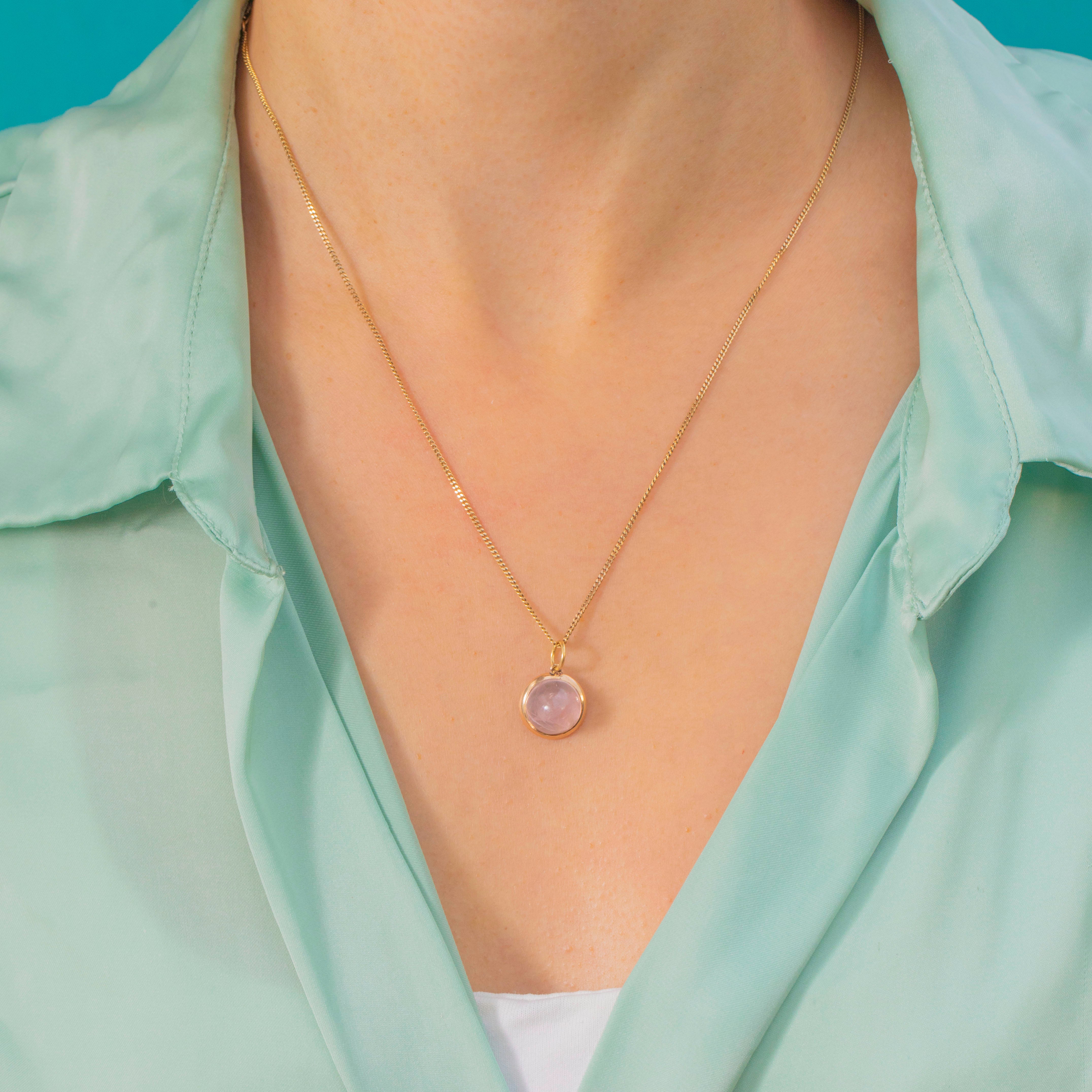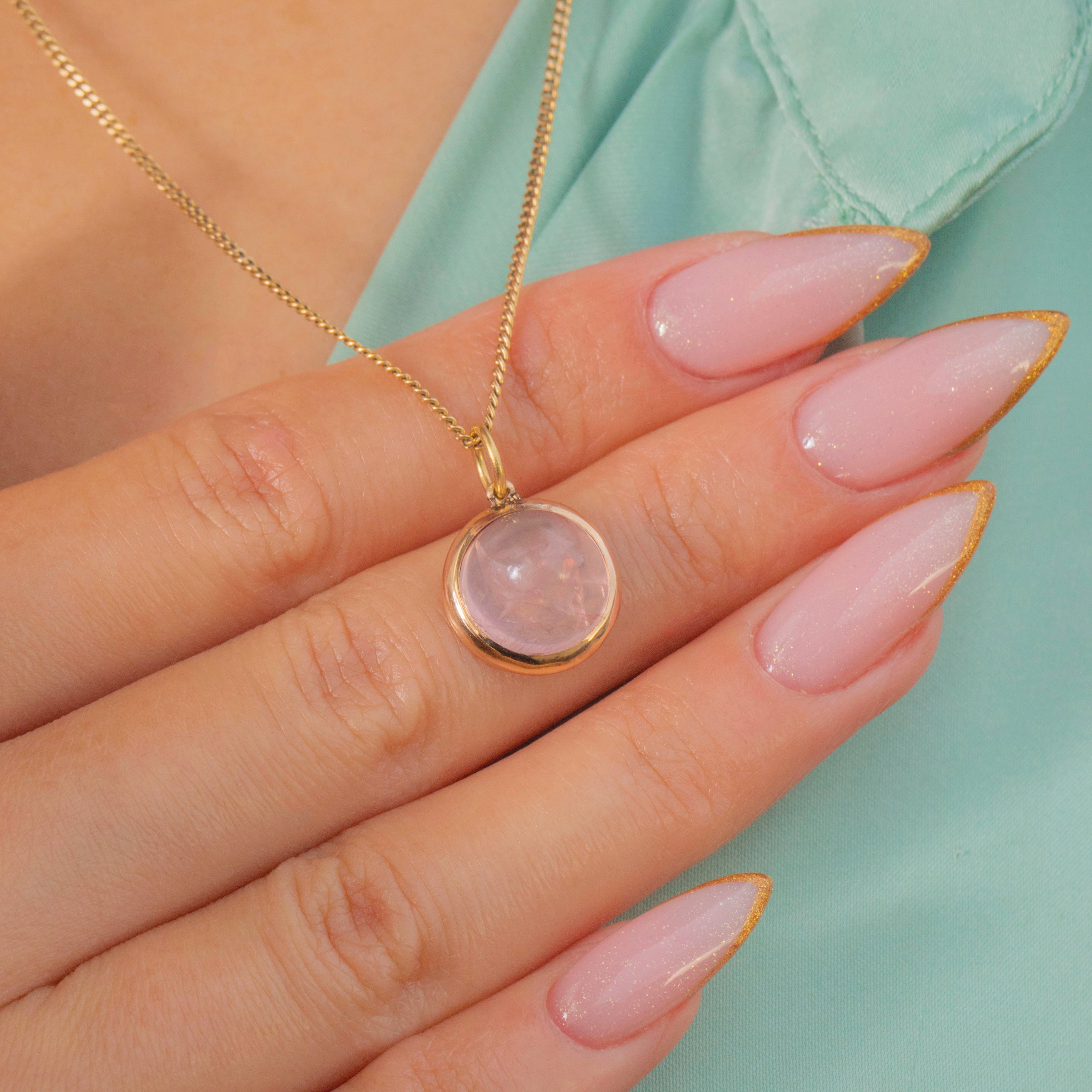 EXCELLENT: The Rose Quartz is smooth and glossy with no chips or cracks, displaying beautiful natural inclusions within. The 15ct Gold bezel is bright and well-polished, and the jump ring is securely soldered.