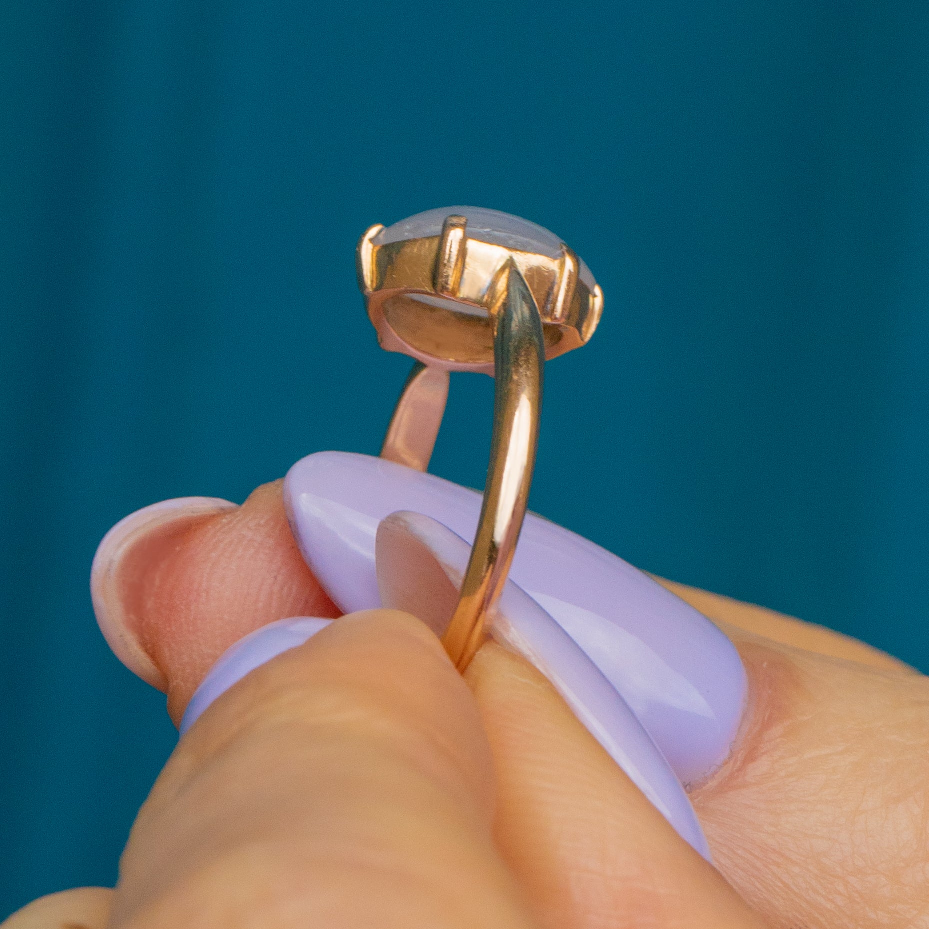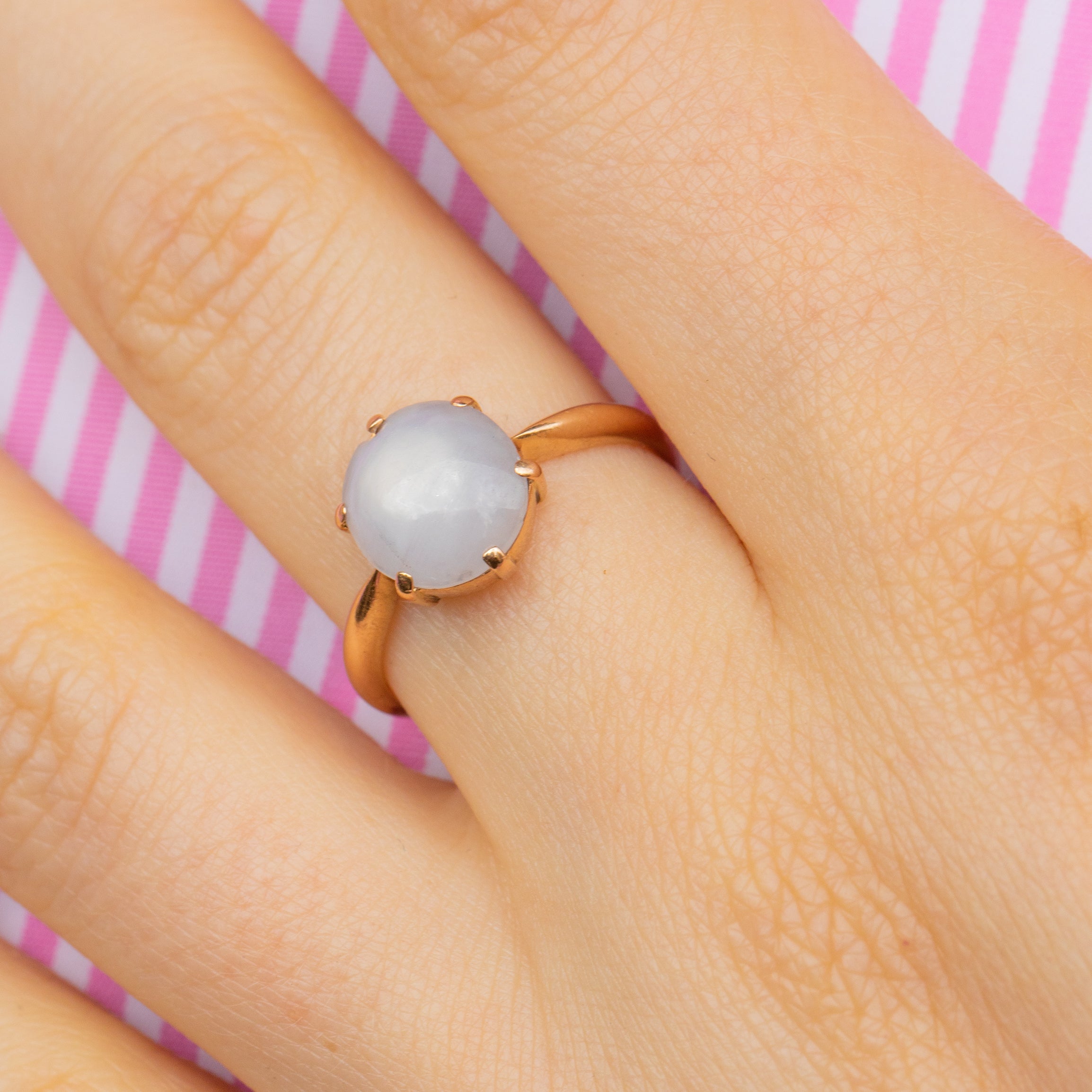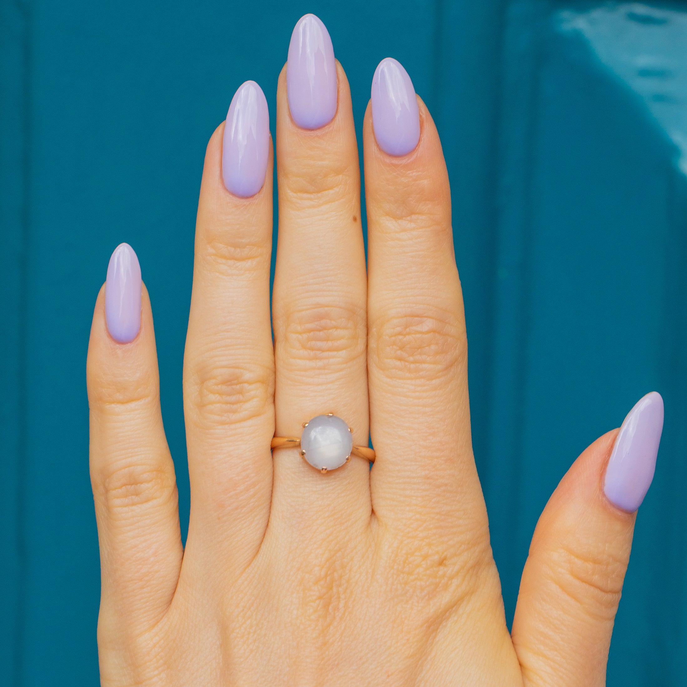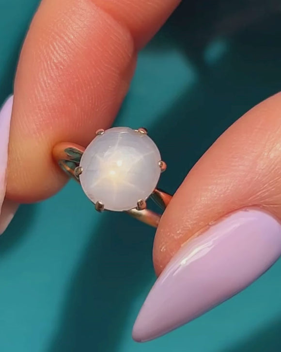 This 15ct Gold star Sapphire solitaire ring is super plump! With a stunning pastel centre boasting a 3.60ct pretty lilac-hued Sapphire, this Victorian ring exudes elegance.