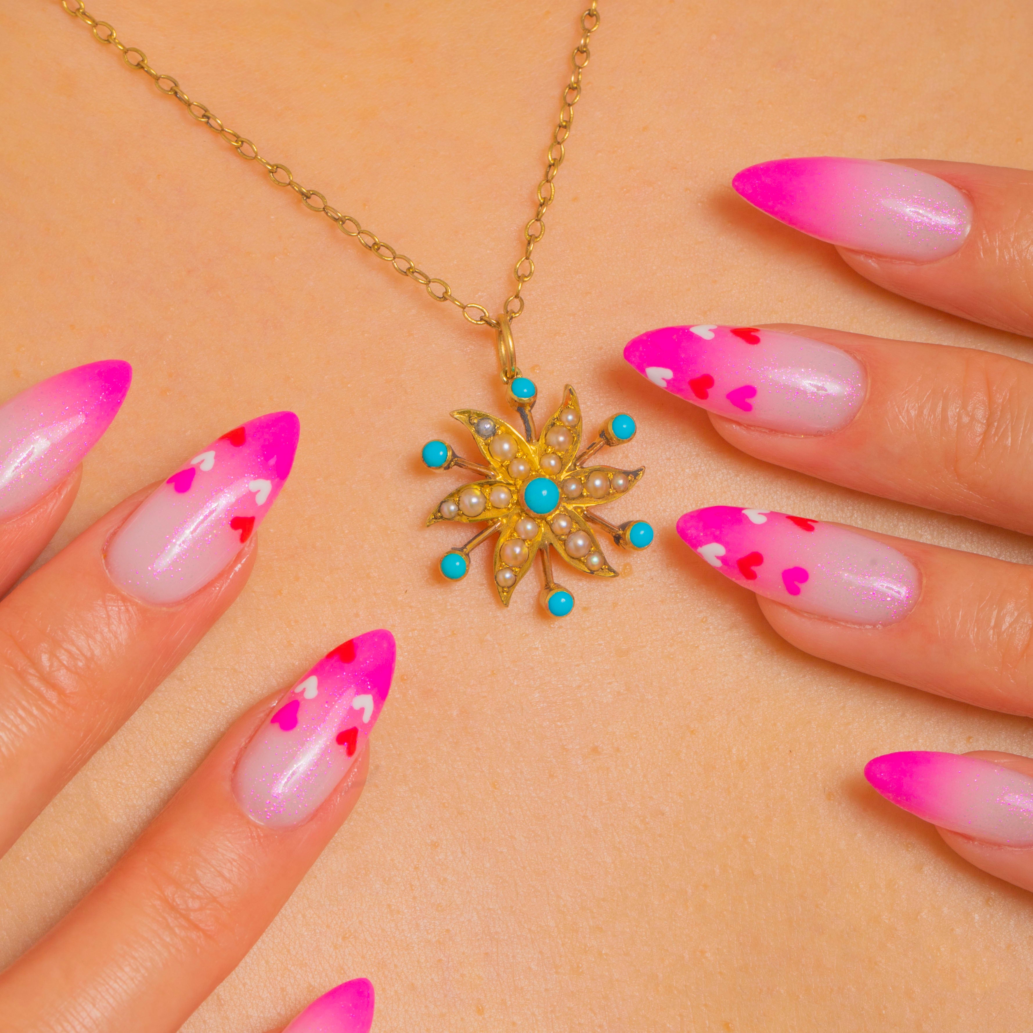 A luminous Victorian flower pendant crafted in rich 15ct Gold, centred on a vivid round Turquoise cabochon. From the heart of the piece, delicate petal-like rays unfold, each softly cupped and set with natural Seed Pearls to create a romantic, starburst bloom.