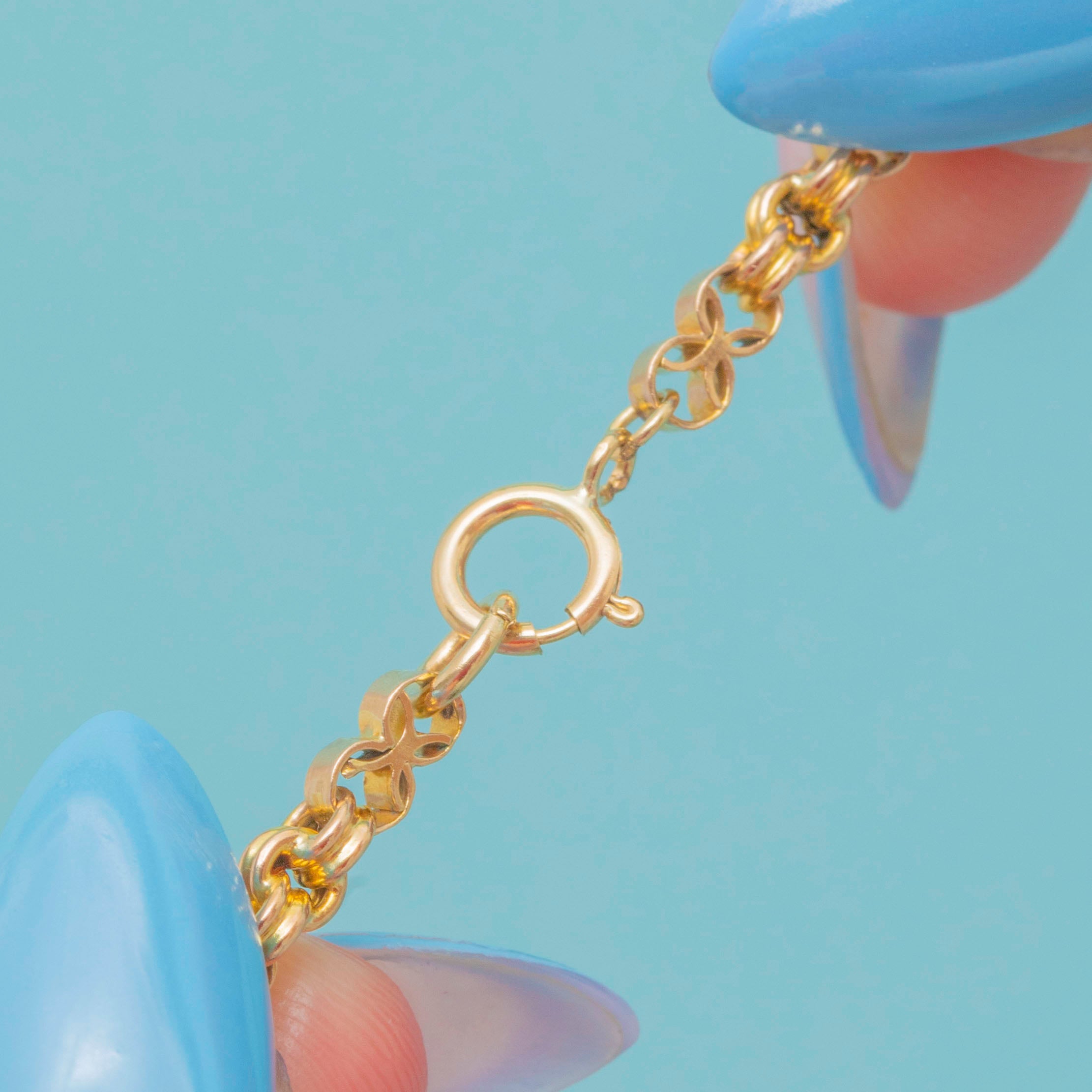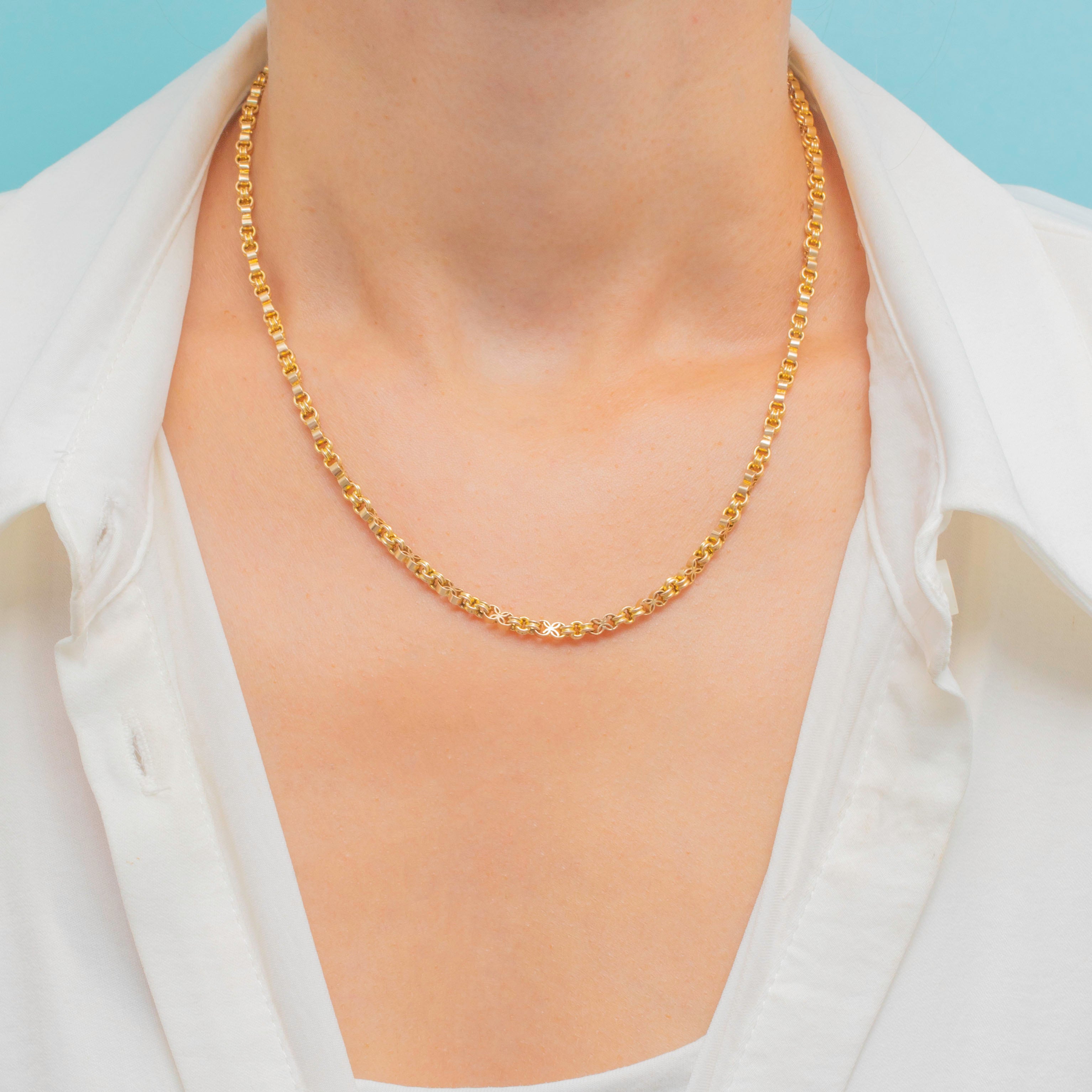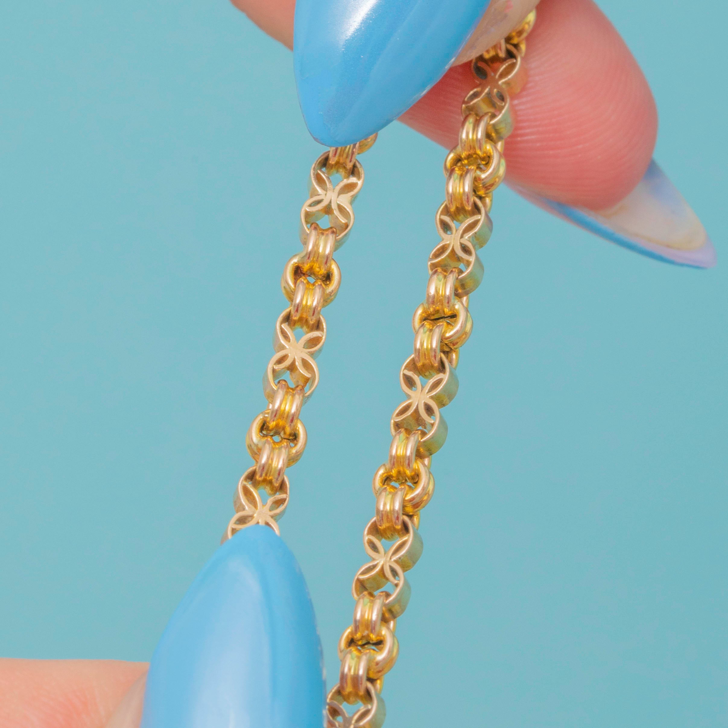 The Gold has retained its original warm yellow hue, with the lightly faceted belcher links and fancy connecting links sending Golden shimmers cascading across your décolletage as they catch the light. Complete with a secure and easy to use bolt-ring clasp, it is the perfect versatile antique piece for your collection.