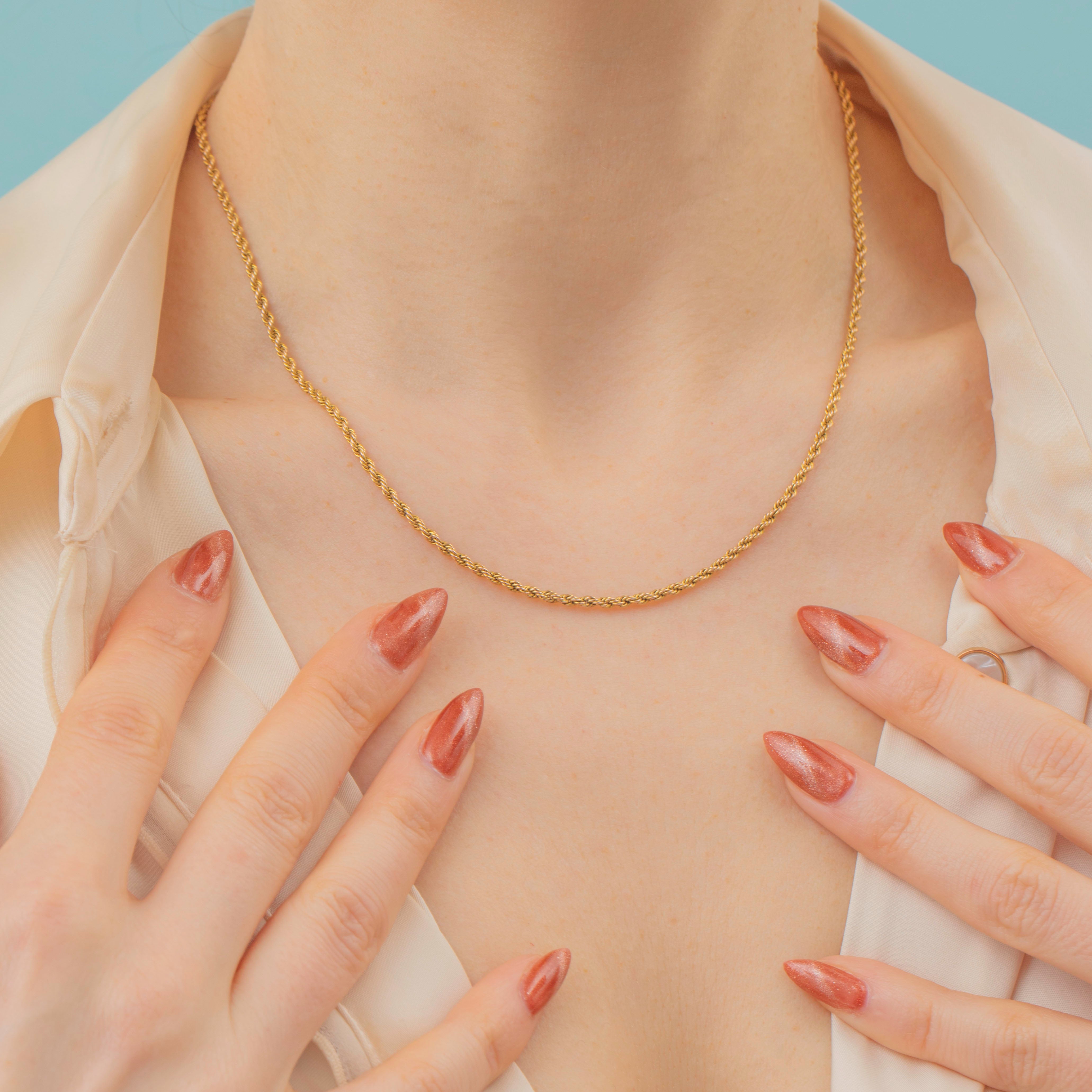 How pretty is this 16.5" antique 9ct Gold twisted rope chain?! Comprised of fine strands of buttery 9ct Gold, woven together to form her twisted design, and the 16.5" length sits snugly around your neck.