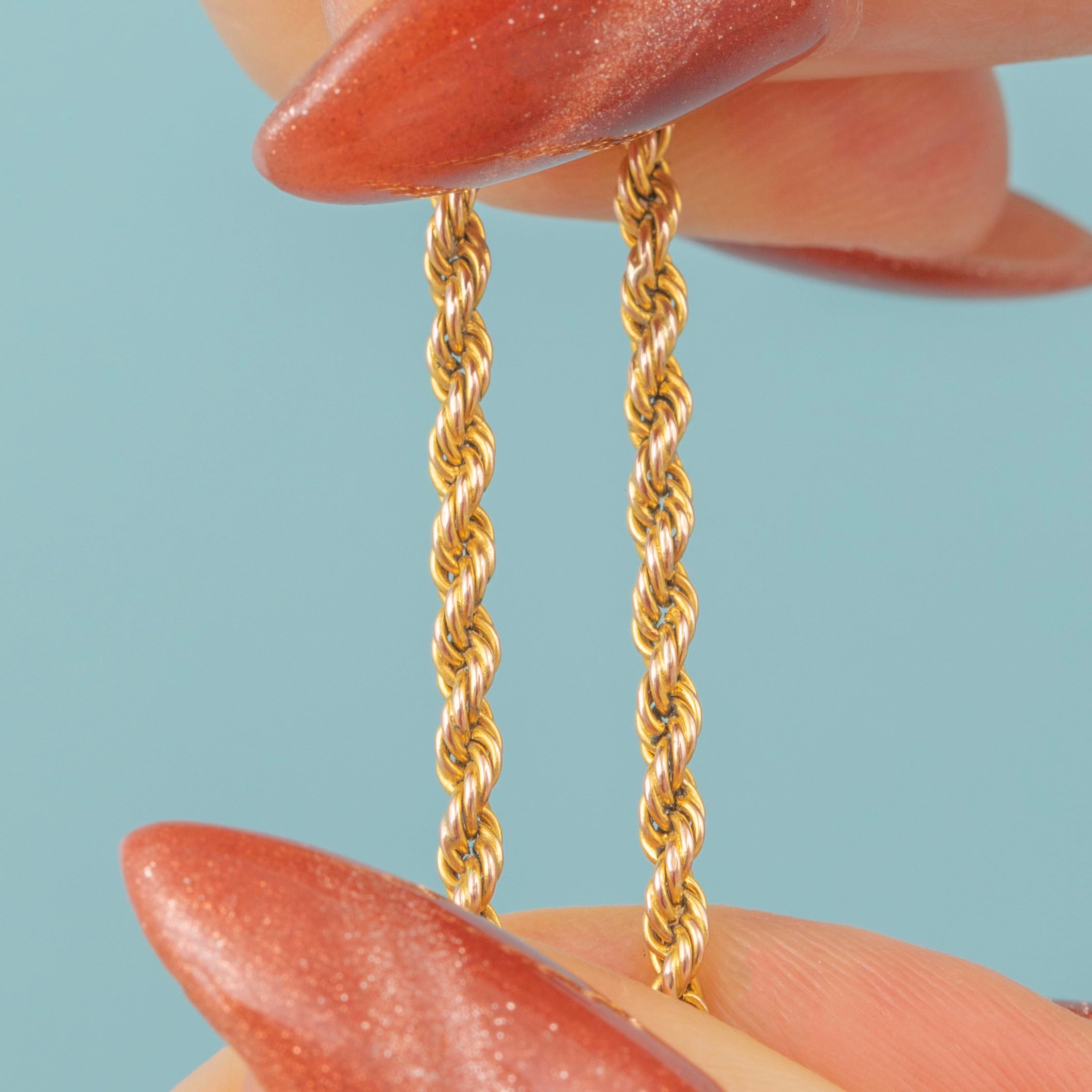 EXCELLENT. This 16.5" antique 9ct Gold twisted rope chain is in wonderful condition throughout. The links are tightly woven throughout, with no surface wear to note. Her 9ct Gold has a lovely saturated hue and gleams when worn. The barrel clasp is in perfect working order, so you can wear this Victorian Gold chain with the utmost confidence; it'll make the perfect addition to your antique jewellery collection!