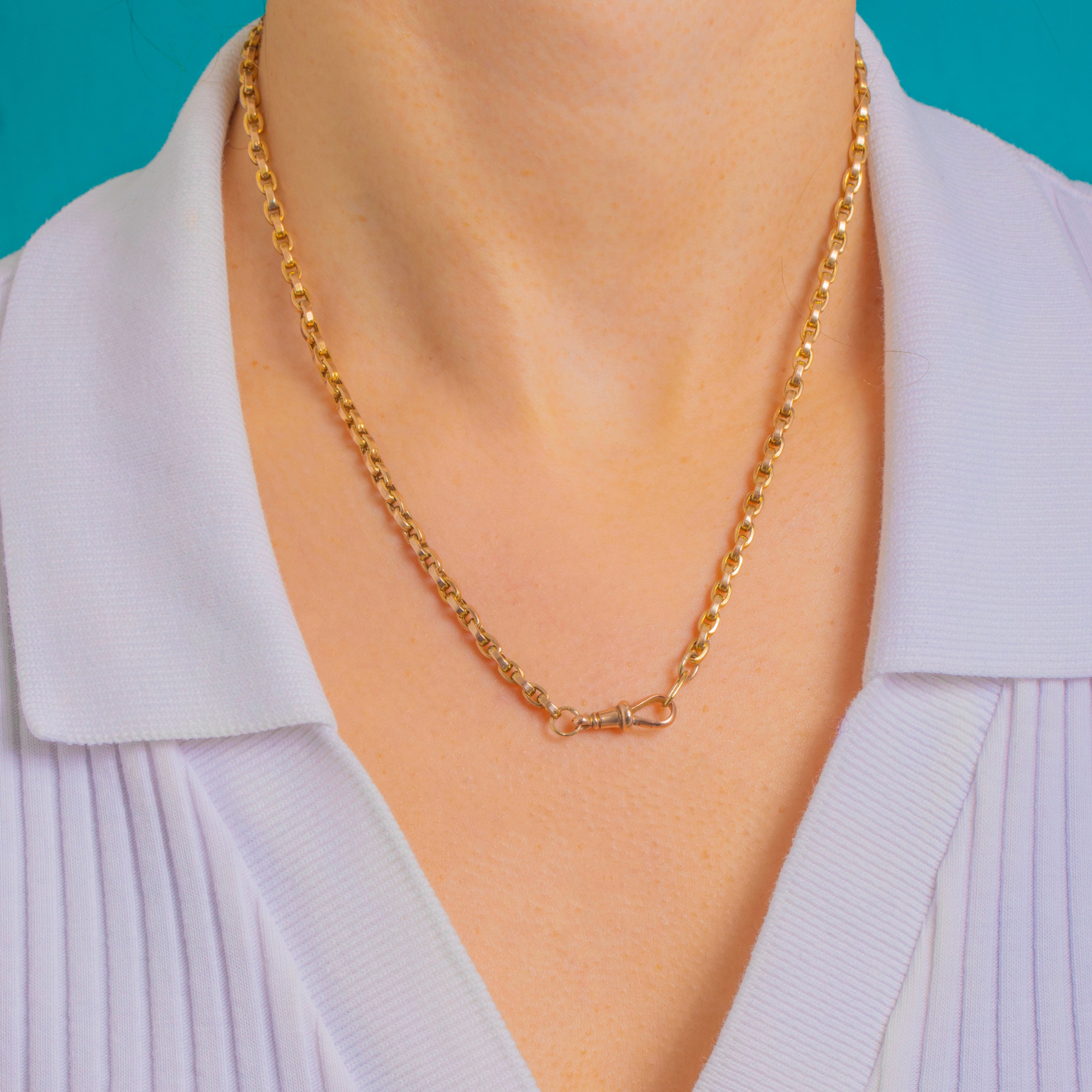 Understated and effortlessly chic, this Victorian 9ct Gold belcher chain is a timeless staple. Its uniform, rounded links catch the light with a soft glow, while the classic dog-clip fastening brings endless styling opportunities.