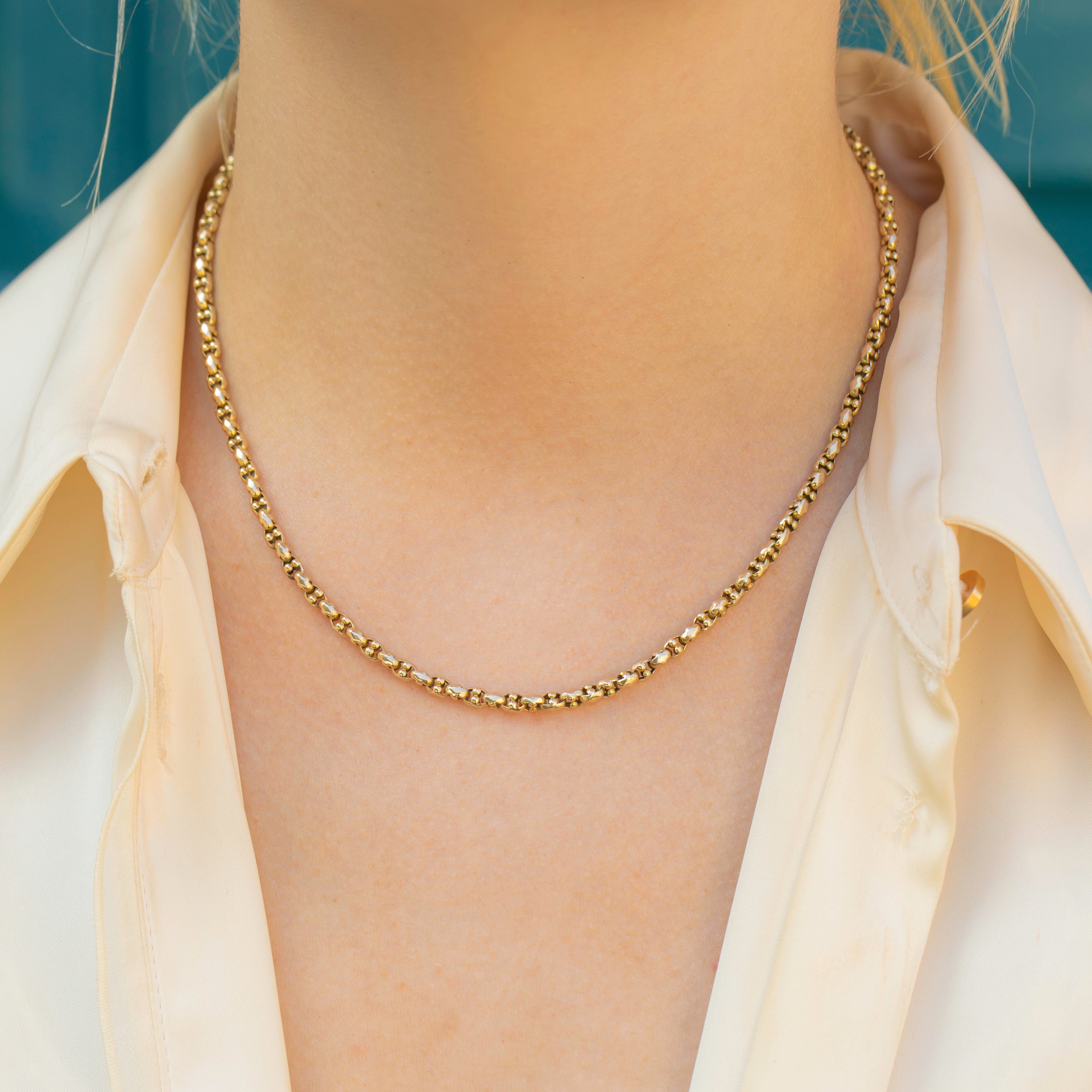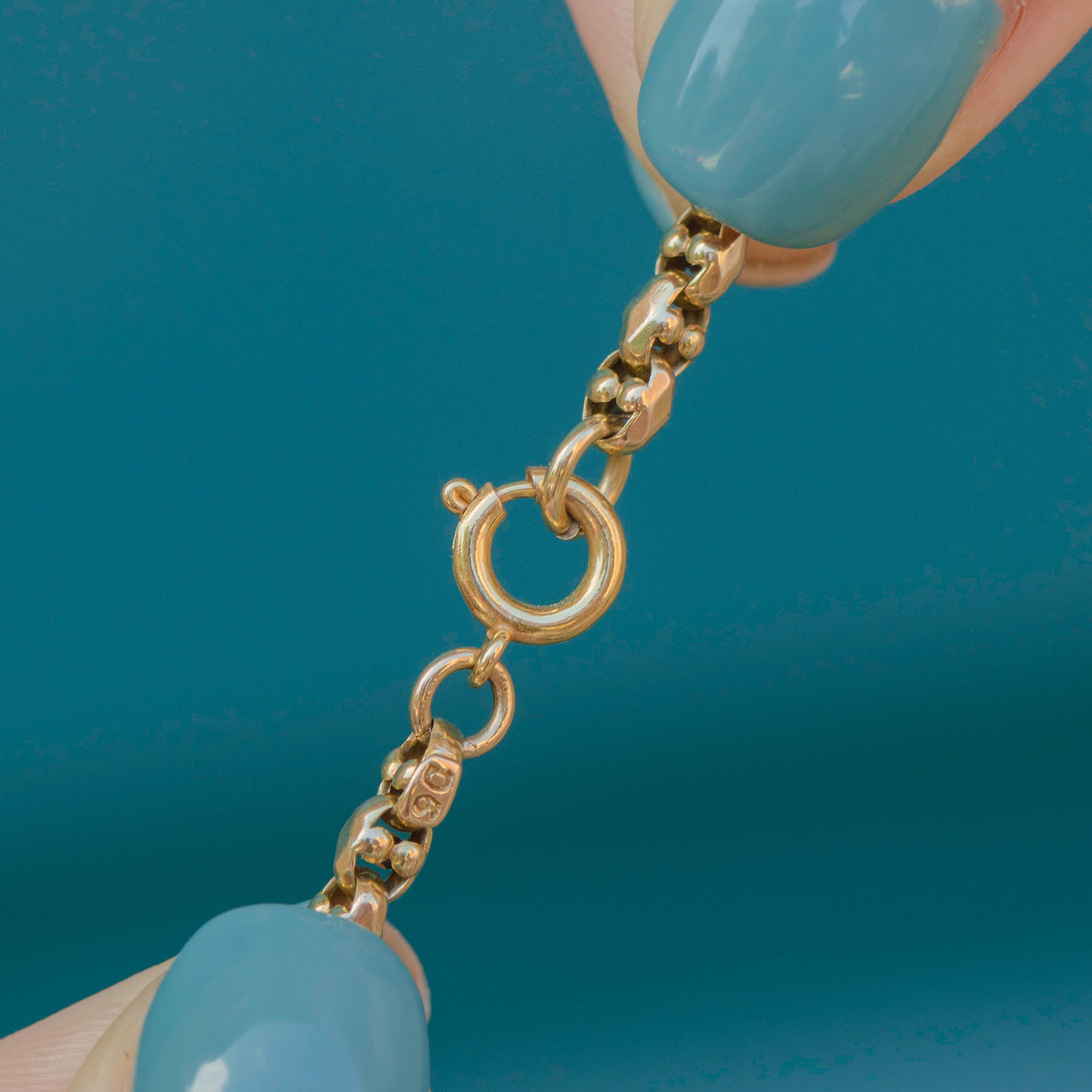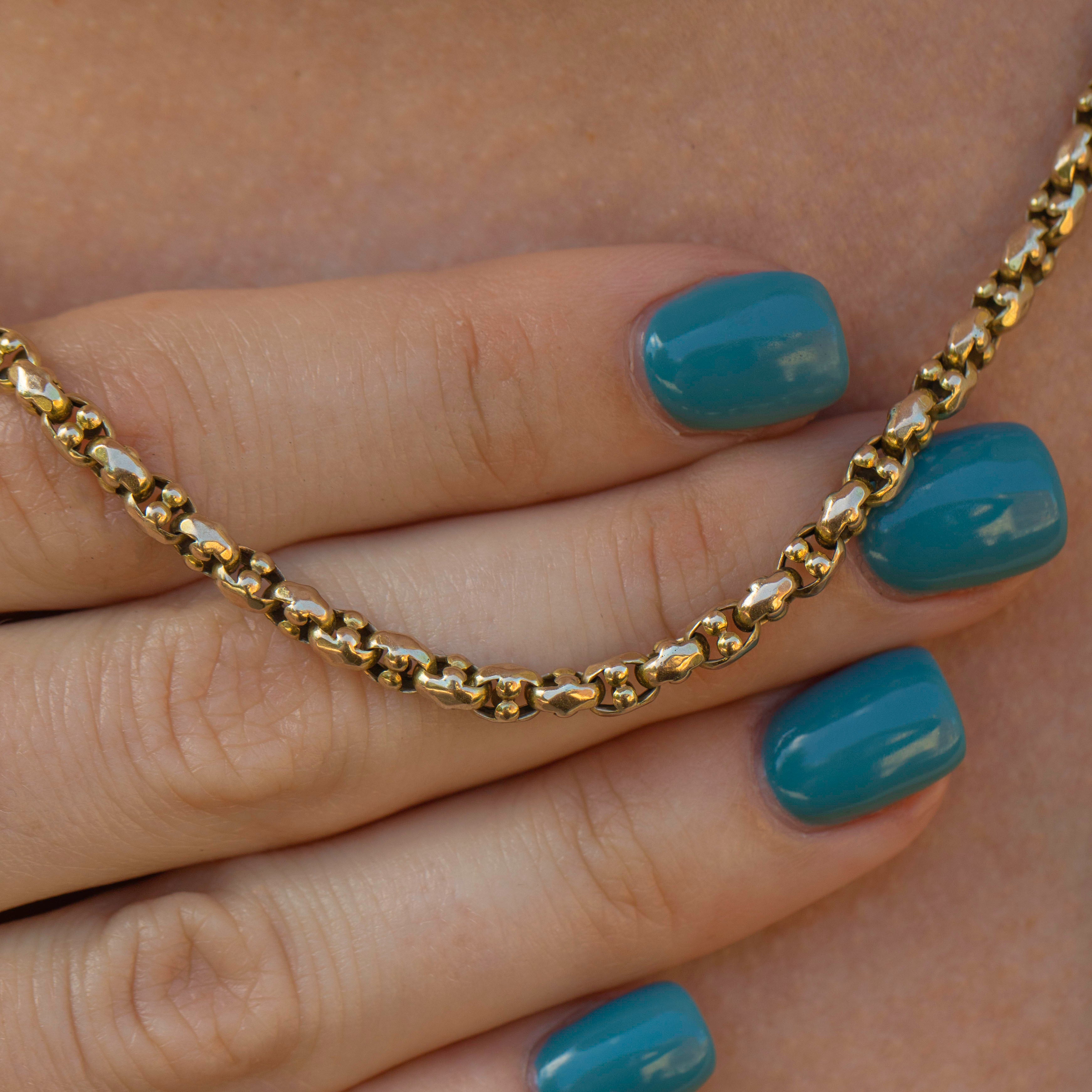 At 16" long and fastened with a bolt-ring, this antique belcher chain is a versatile piece and will sit comfortably and securely across your collarbones. Everyone needs a classic Victorian Gold chain in their antique jewellery collection, and this unique and chunky delight would make a fantastic choice!