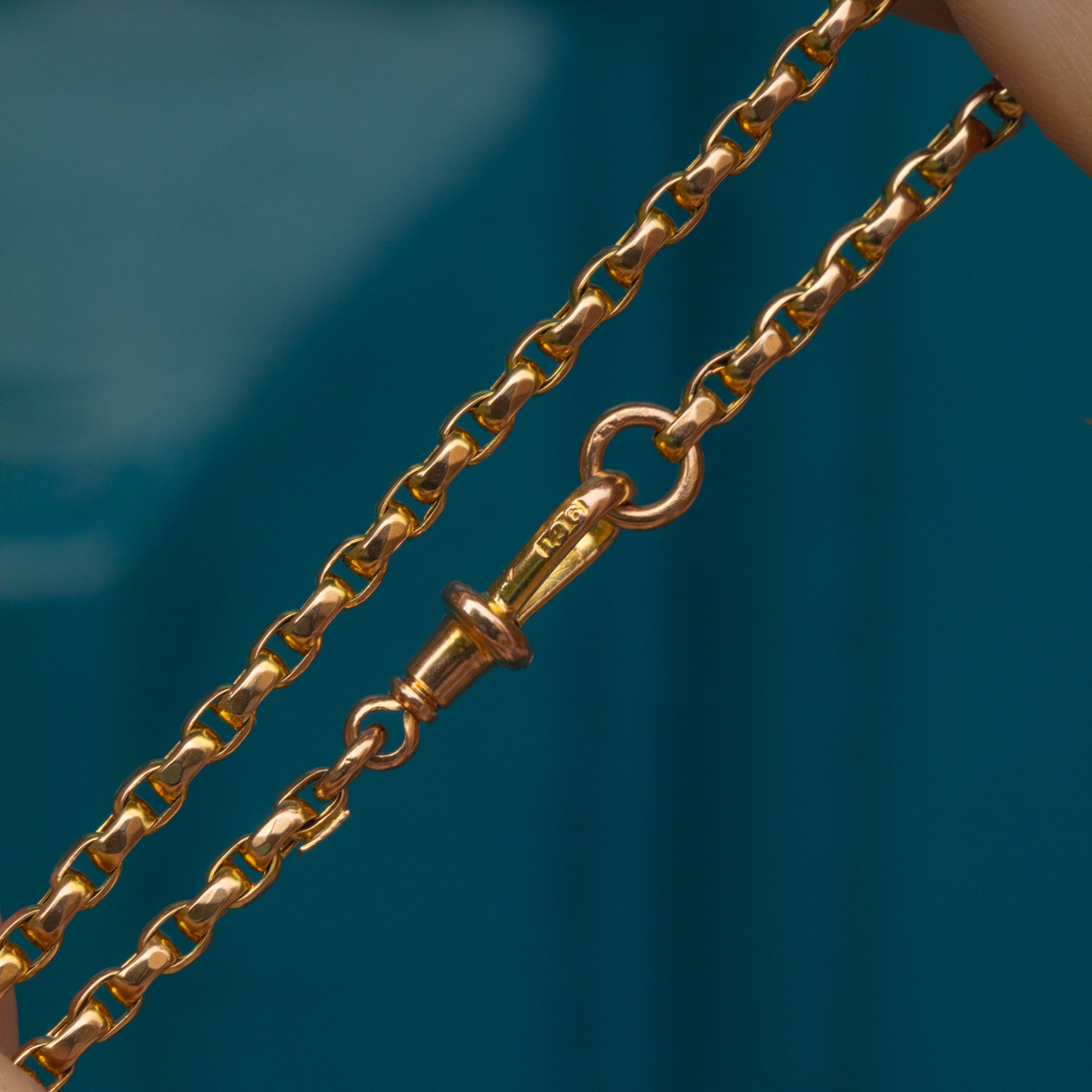 EXCELLENT. This 16" antique 9ct Gold belcher chain is in excellent condition. This gorgeous chain is the perfect everyday essential for your collection, complete with smooth and secure links, as well as a dog-clip for secure wear. There are clear antique stamps on the dog-clip, making this a collectible piece of antique jewellery!