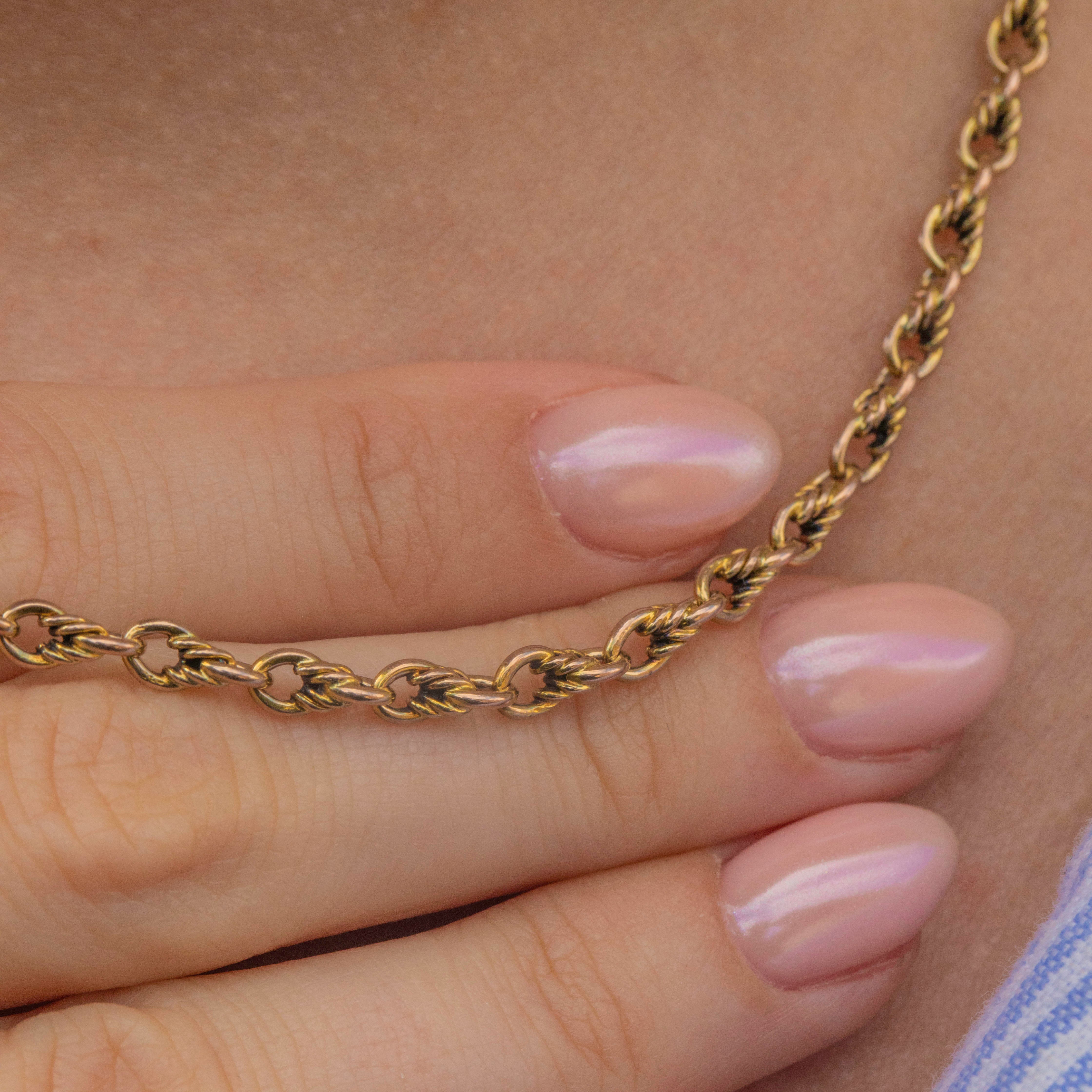 This exquisite antique 9ct Gold lover's knot link chain is crafted from almost 13 grams of solid Gold! Boasting 16 inches of intricately formed lover's knot links, this antique chain is a fine example of the superb craftsmanship of the Victorian era.