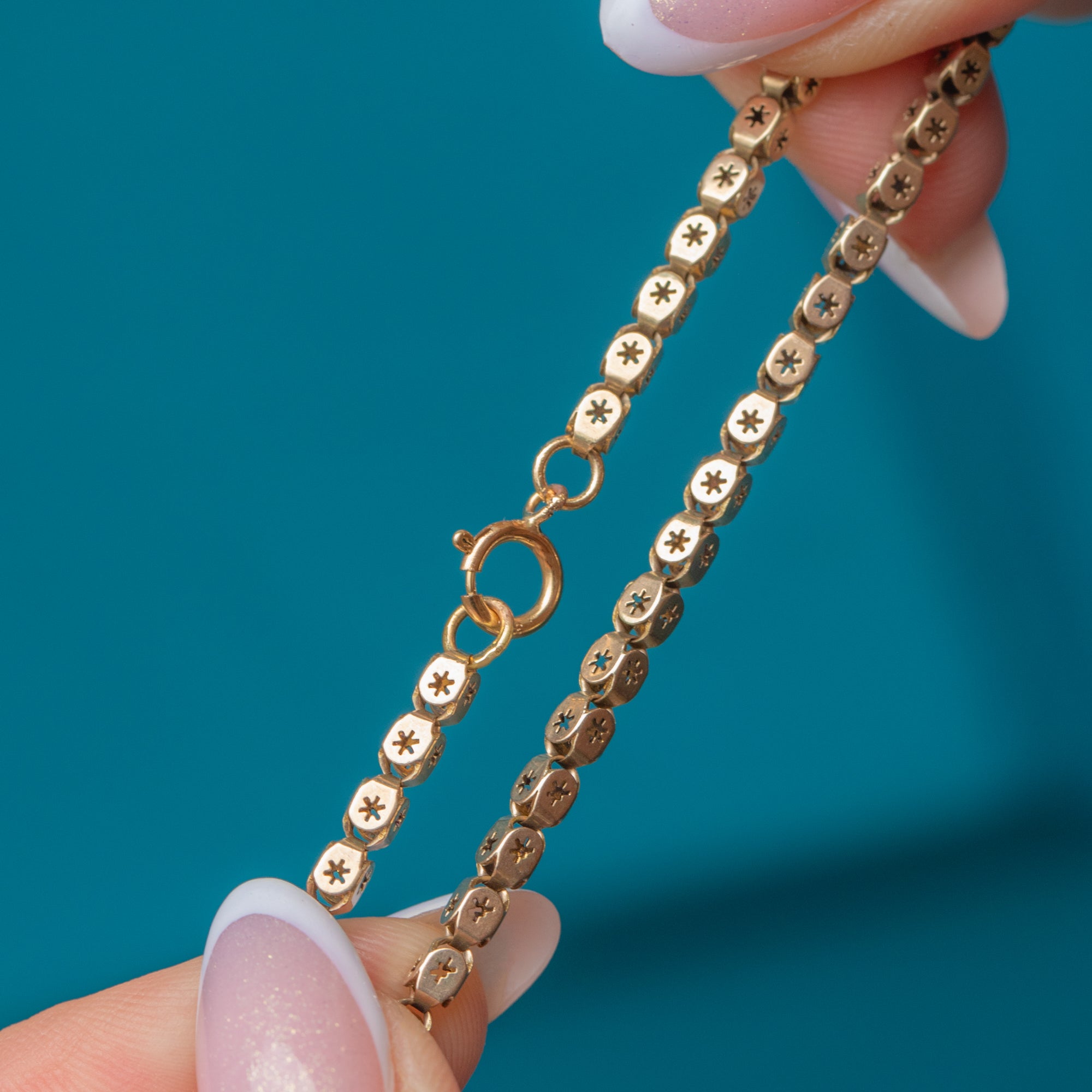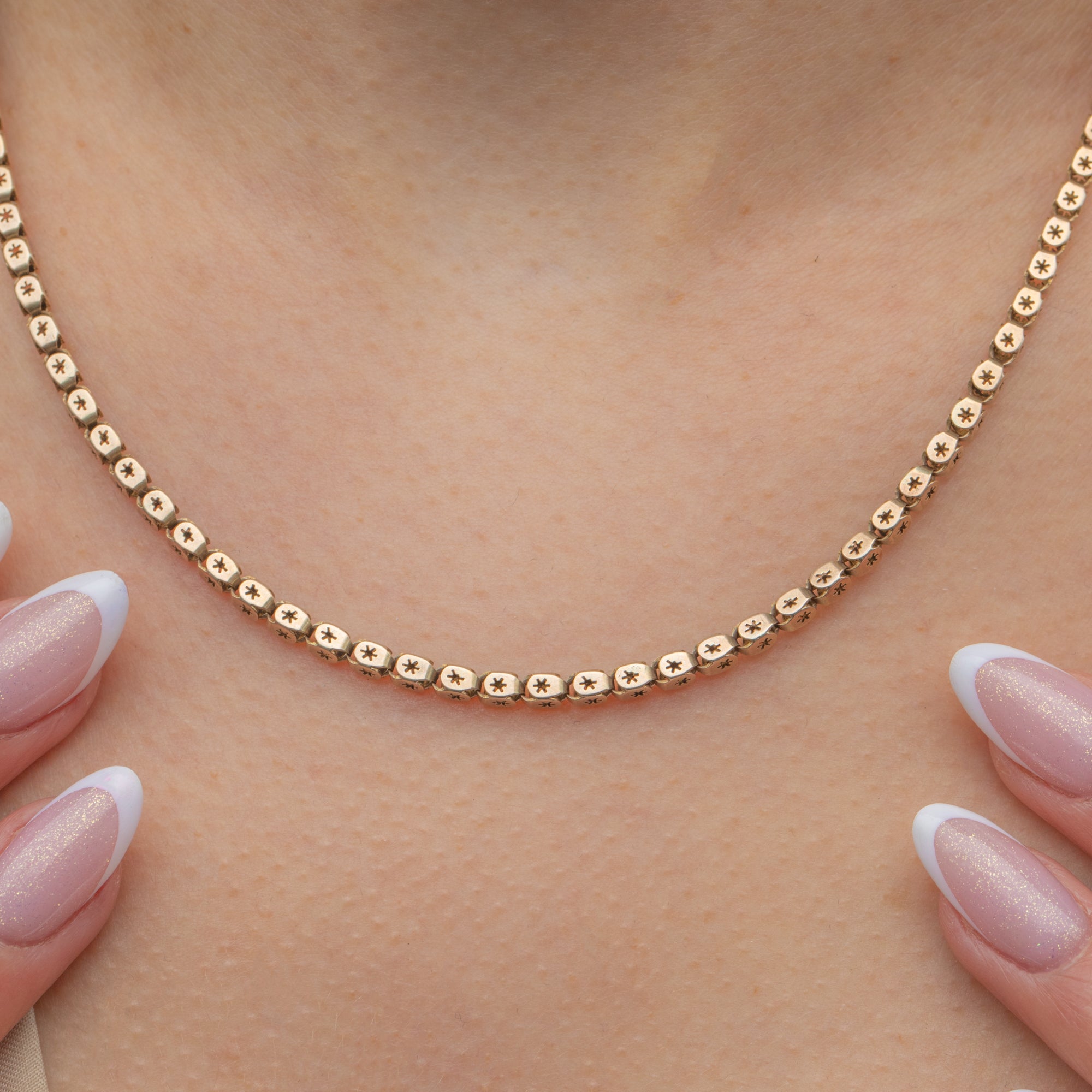 This luxurious antique 9ct Gold pierced star link chain will instantly add a touch of celestial charm to your neckline! Crafted from luscious 9ct Gold, the 16-inch length is made up of smooth box links, boasting a meticulously hand-pierced star on each side.