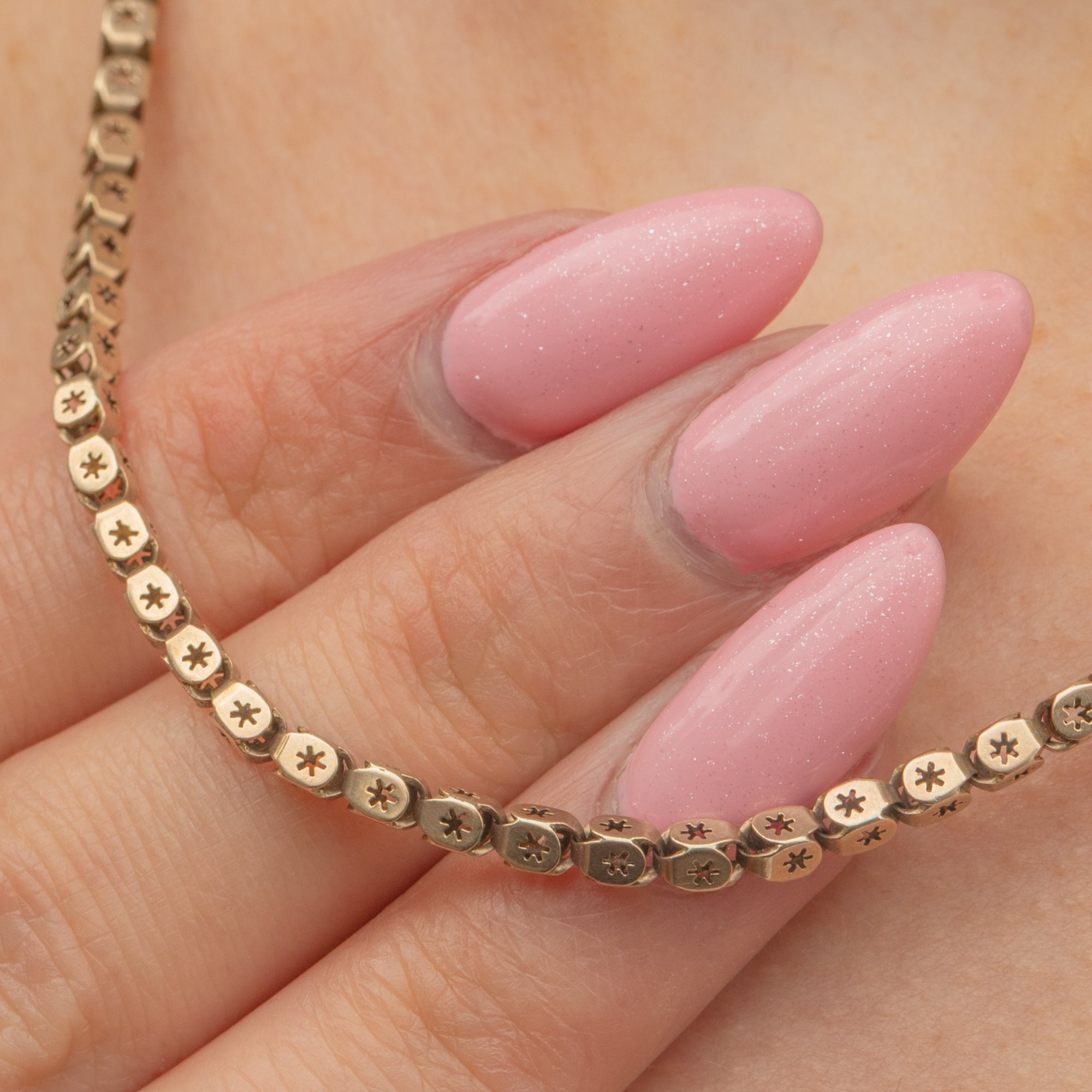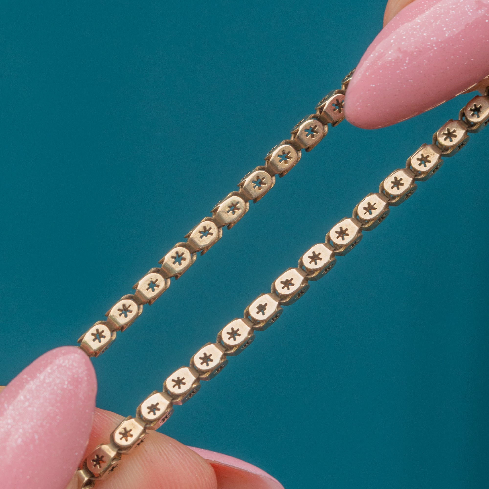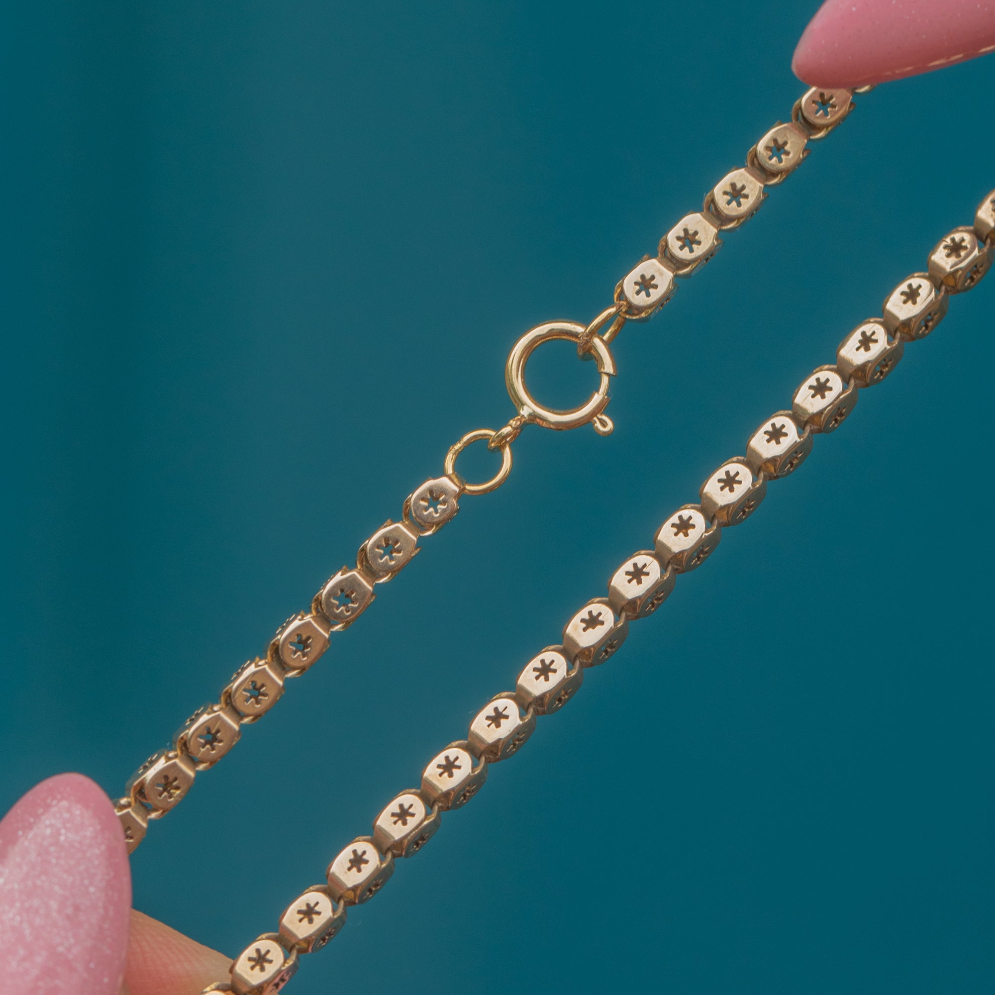 EXCELLENT: This antique 9ct Gold pierced star link chain is in excellent condition. The Gold is bright and buttery, and each link is securely connected with no dings or scuffs to note. The later added bolt ring is in perfect working condition, allowing you to wear this Victorian Gold chain with utmost confidence!