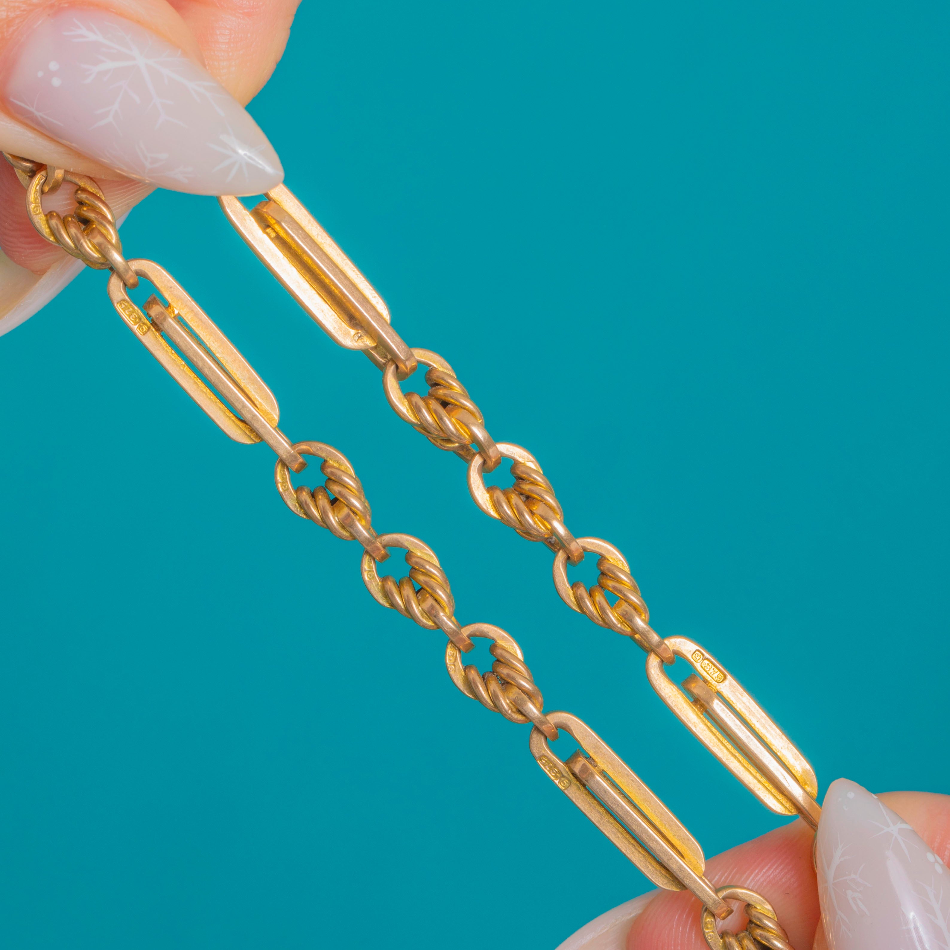 A classic of the Victorian era, this 9ct Gold fancy “knot & fetter” Albert chain brings bold, tailored elegance to the neckline. Alternating elongated fetter links with twisted knot figure‑8 links, the fully articulated chain has a beautiful warm patina and that satisfyingly silky drape only antique Gold delivers.