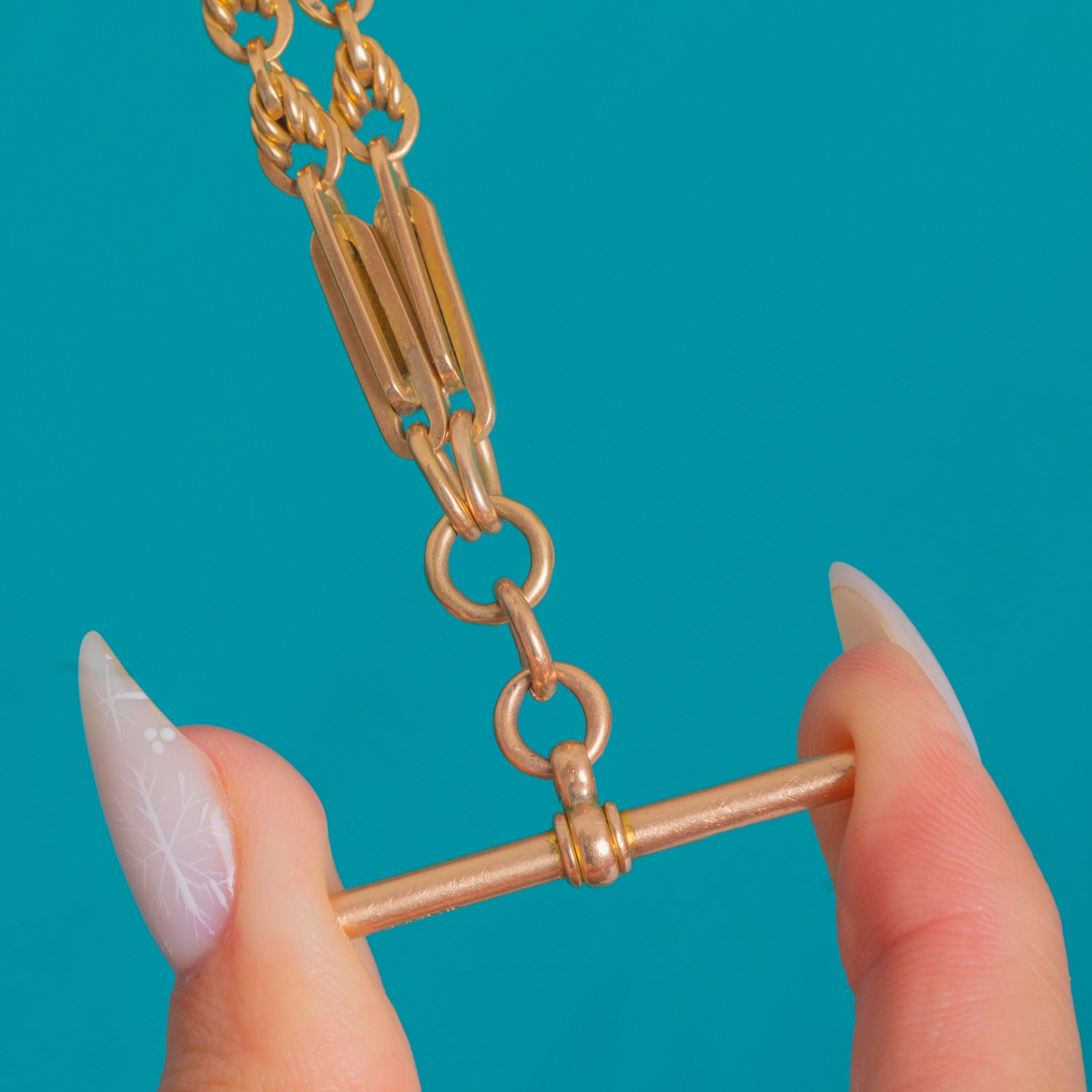 EXCELLENT: Light, even surface wear to the Gold consistent with age, with a rich antique patina and crisp links. The bolt‑ring, dog‑clip and T‑bar are secure and operate smoothly. No visible dents, repairs or distortions; this piece has been very well cared for.