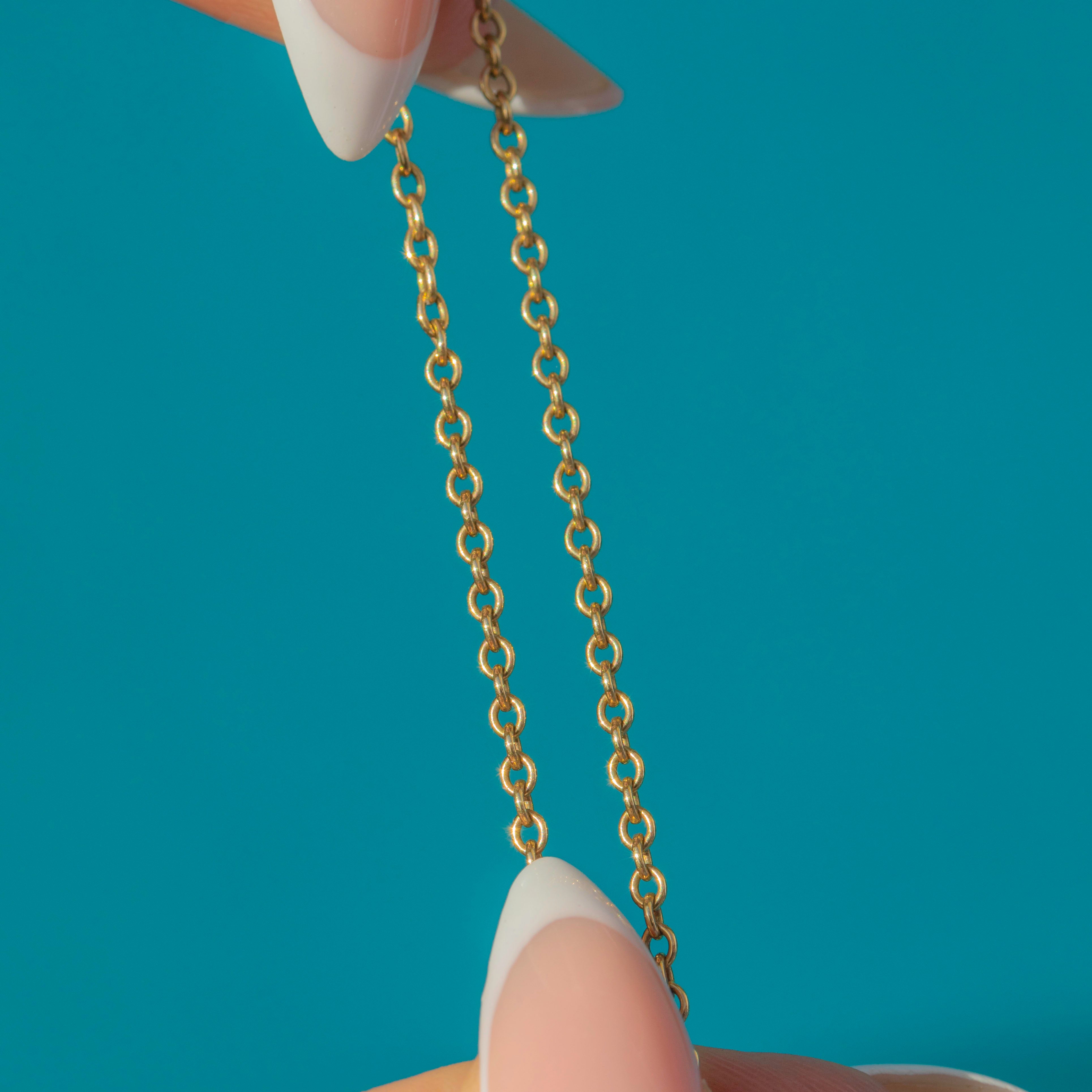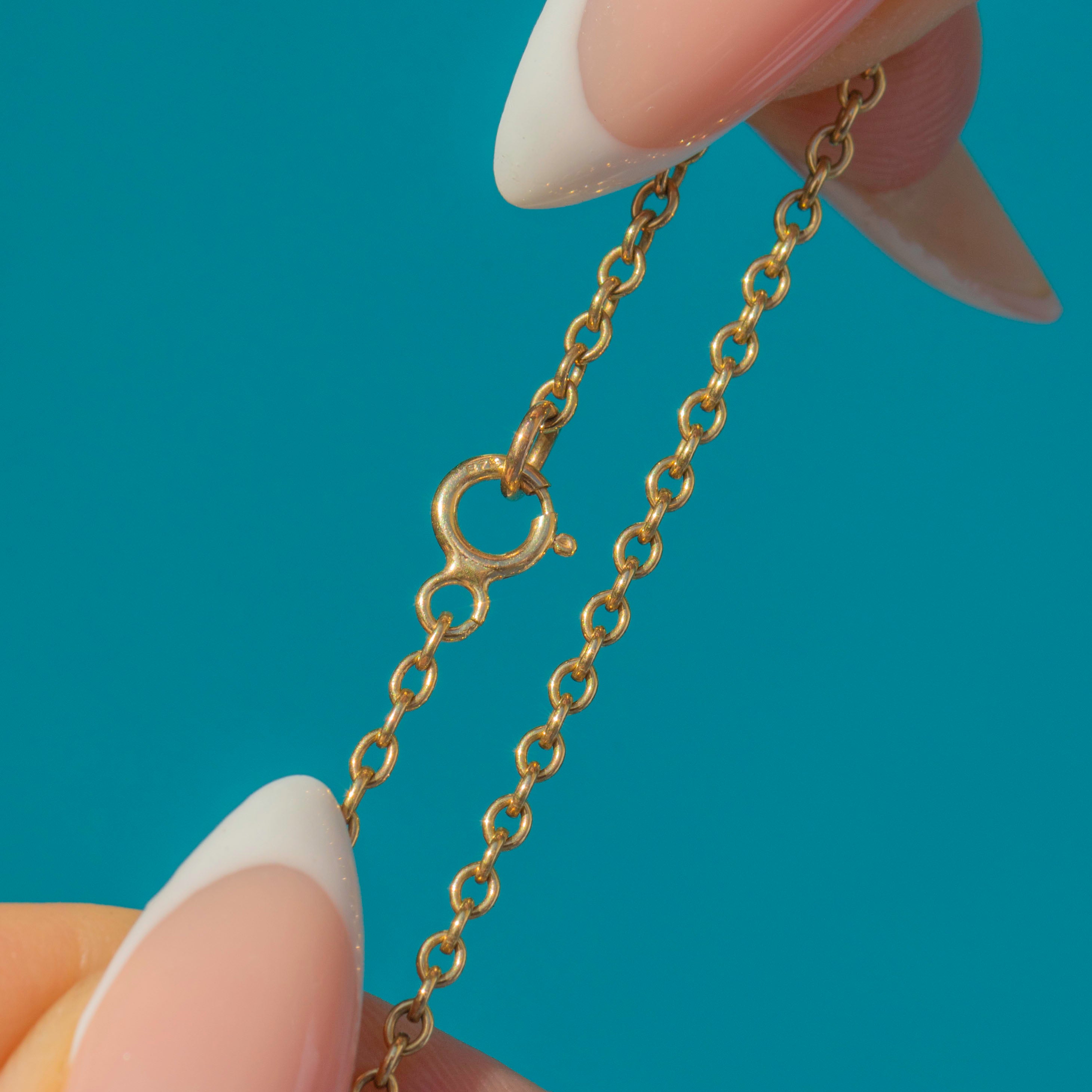 A classic mid-century trace-link chain in warm 9ct Gold. At 16" it sits neatly at the collarbone—perfect for pendants or layering—with smooth, round links that catch the light just enough without competing with your charms.