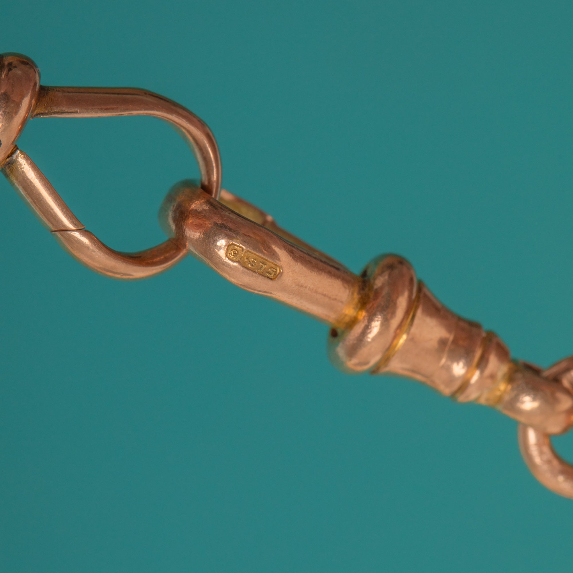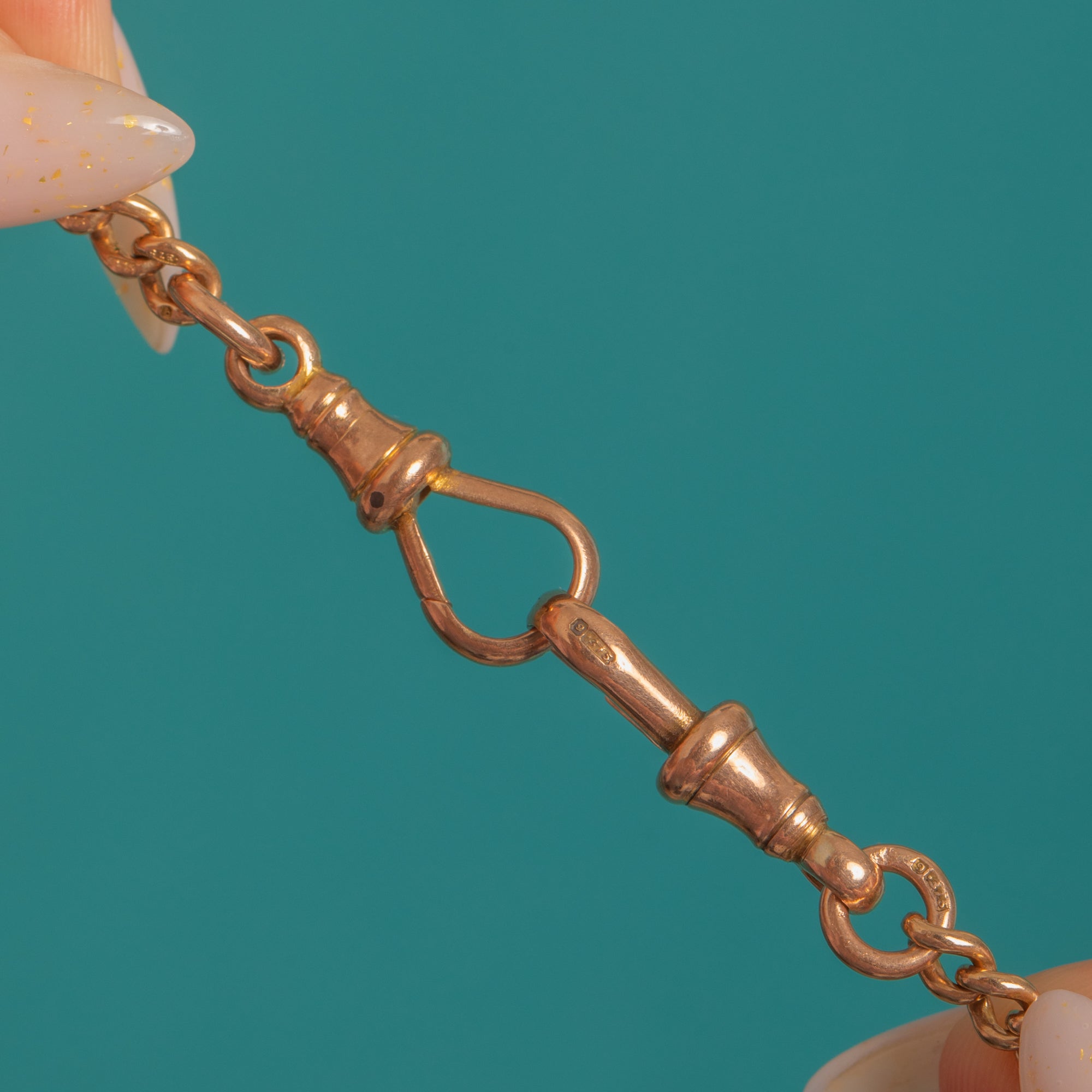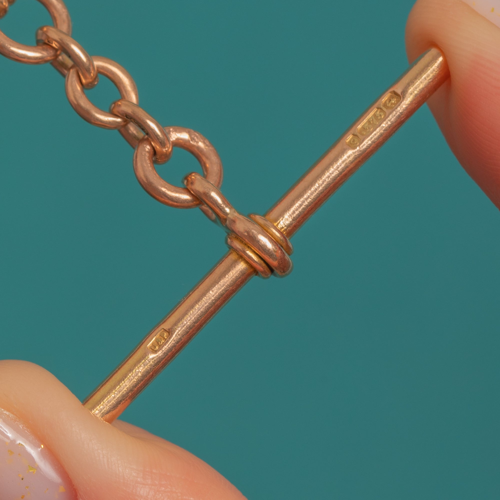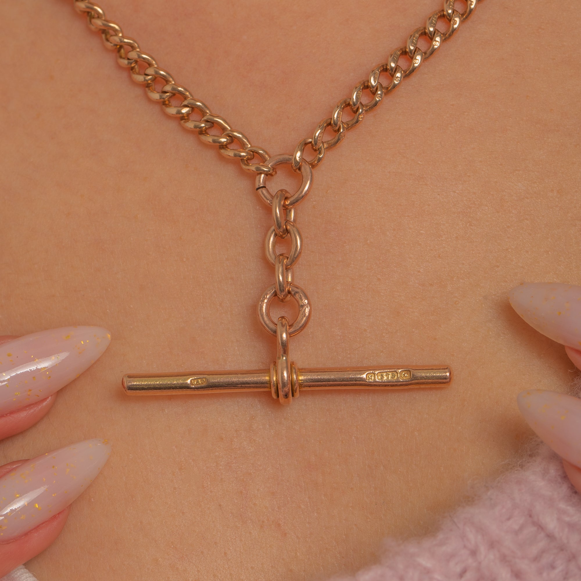 Immensely satisfying in both look and feel, this Victorian 9ct Gold Albert chain pairs polished curb links with a stationary T-bar drop and twin dog-clips for that timeless watch-chain allure. The Gold has a warm, rosy-yellow hue and the chain carries a reassuring heft, offering a luxurious drape and a robust, unisex presence.