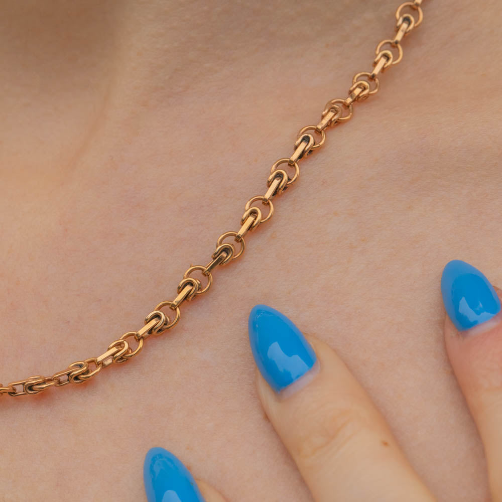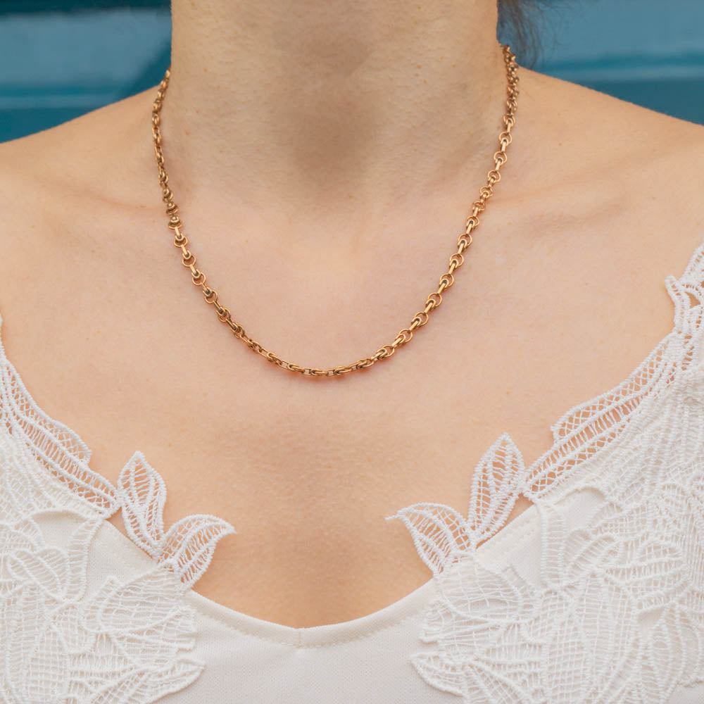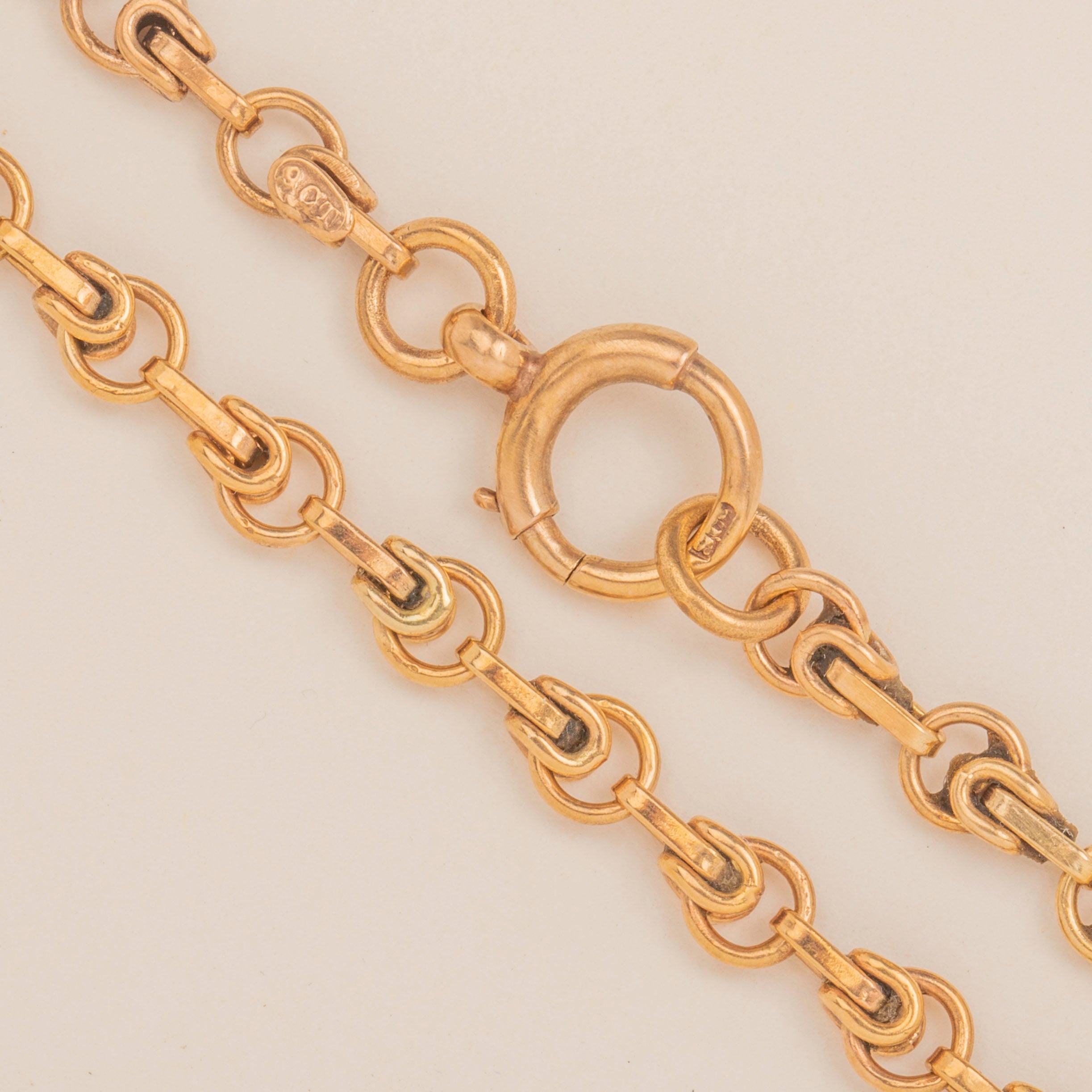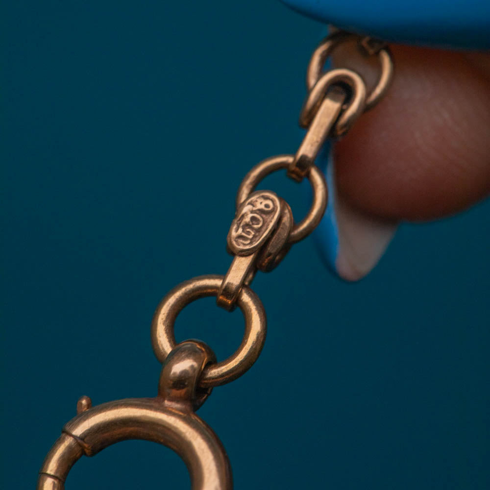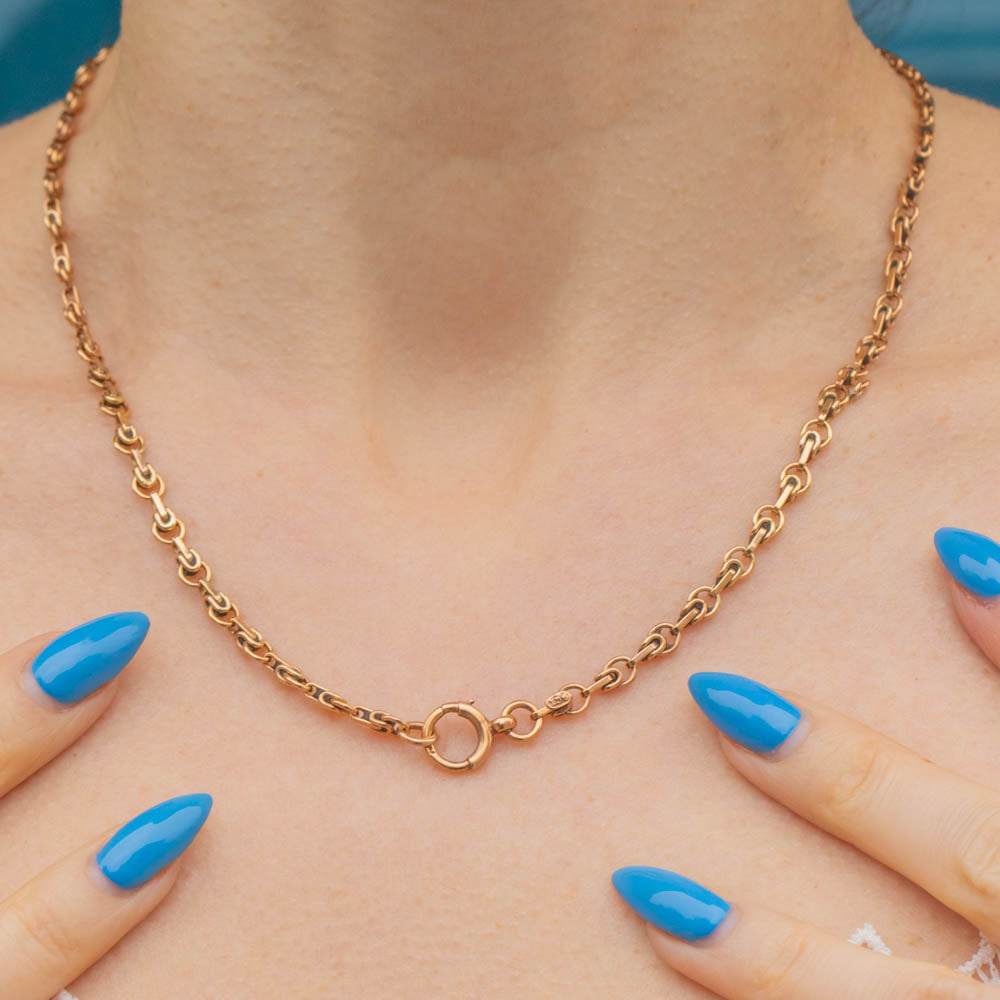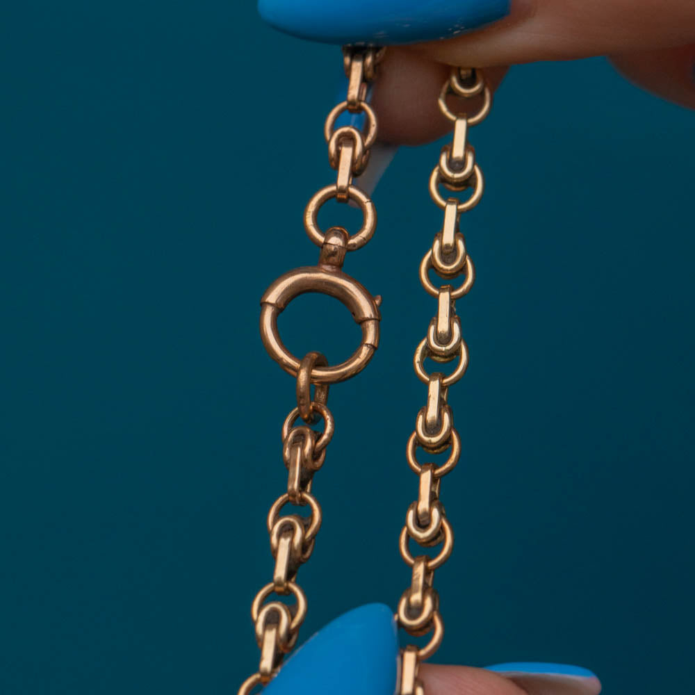 Crafted from buttery, warm 9ct Gold, this chain features a unique link pattern and is simply radiant, with bundles of Victorian character. Complete with an authentic Gold bolt ring, this chain will look gorgeous with a complimentary antique pendant or worn on its own!