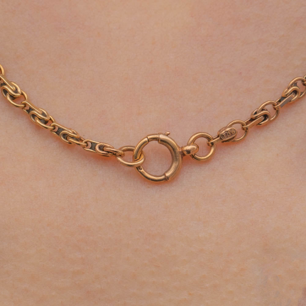 EXCELLENT. This 17.5" antique 9ct Gold fancy chain is in excellent condition. Her faceted links are uniform and secure, and her bolt-ring is in perfect working order, allowing for a confident wear. With little else to note, she is in wonderful condition.