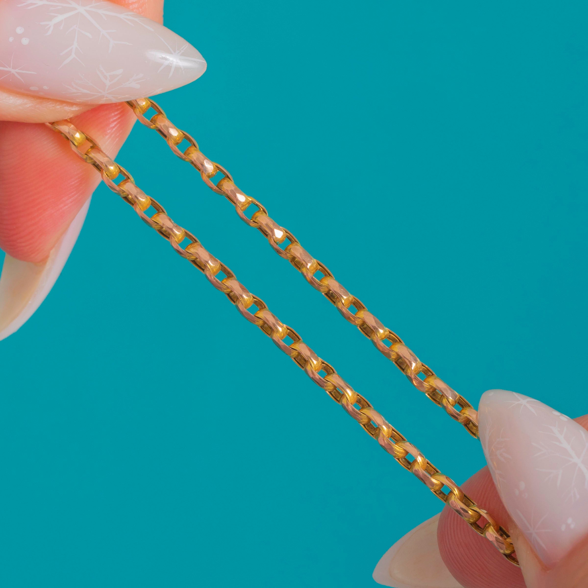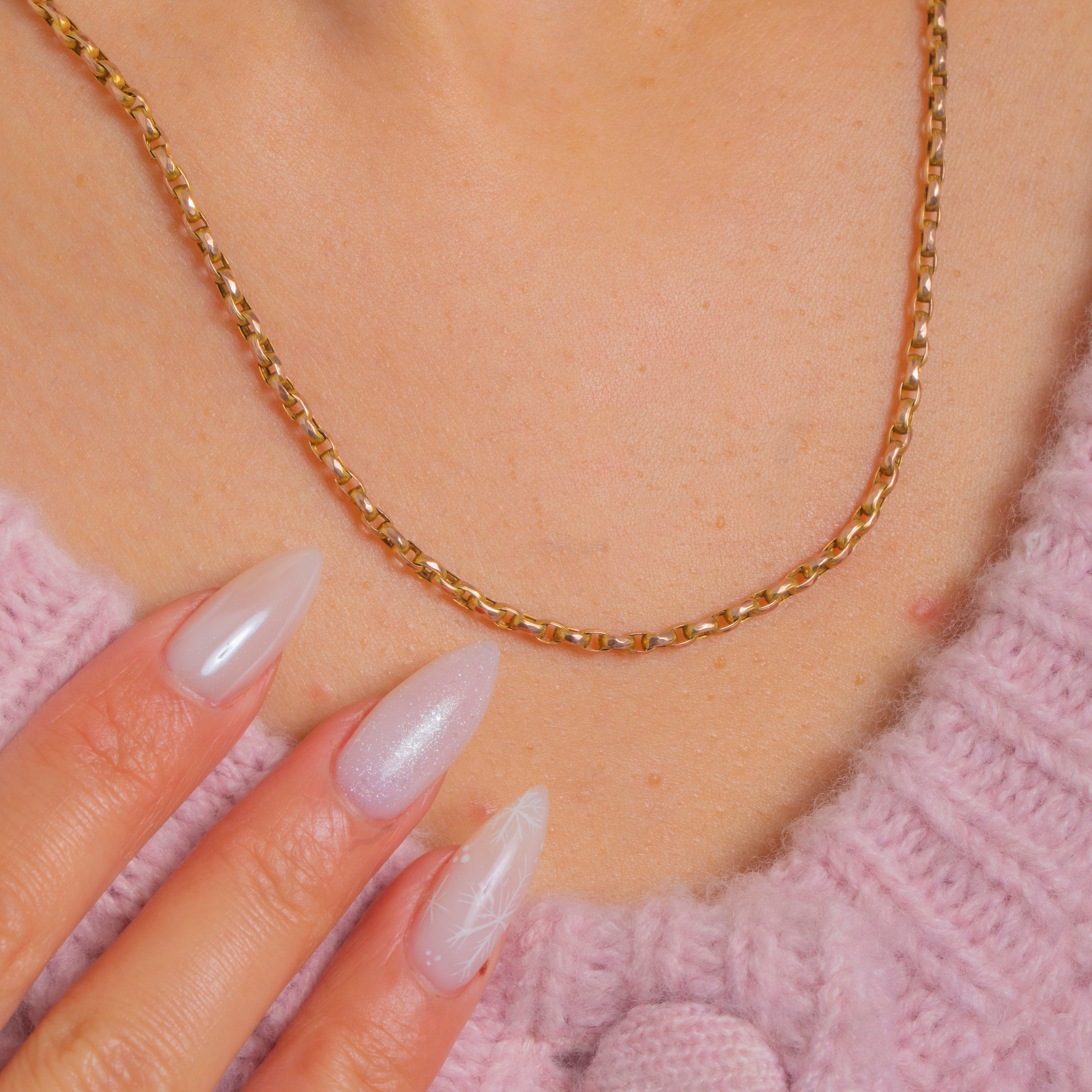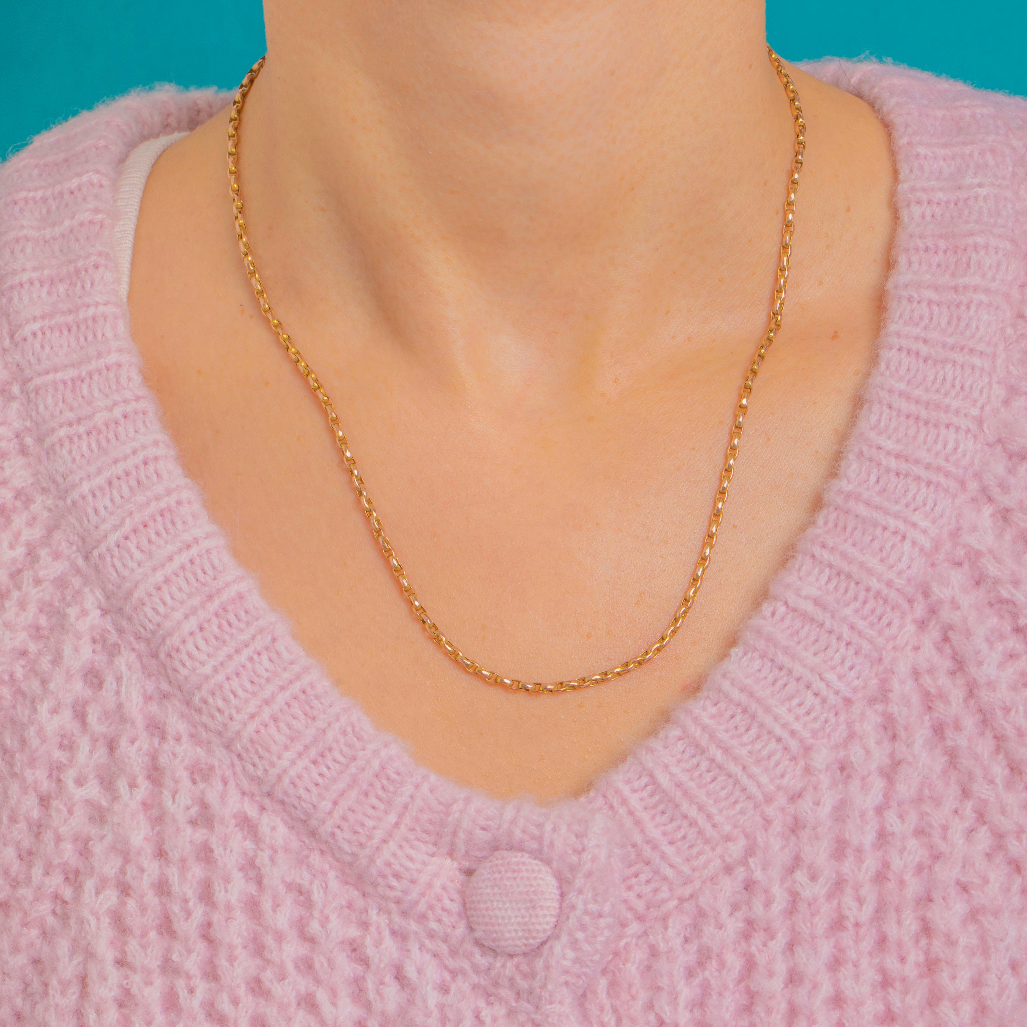 Understated yet irresistibly sparkly, this Victorian 9ct Gold pendant chain showcases uniform elongated links with crisp faceted edges that catch the light beautifully. The rich yellow hue shows subtle rosy undertones in places—so characteristic of antique 9ct Gold—giving the chain a refined, softly two-tone glow.