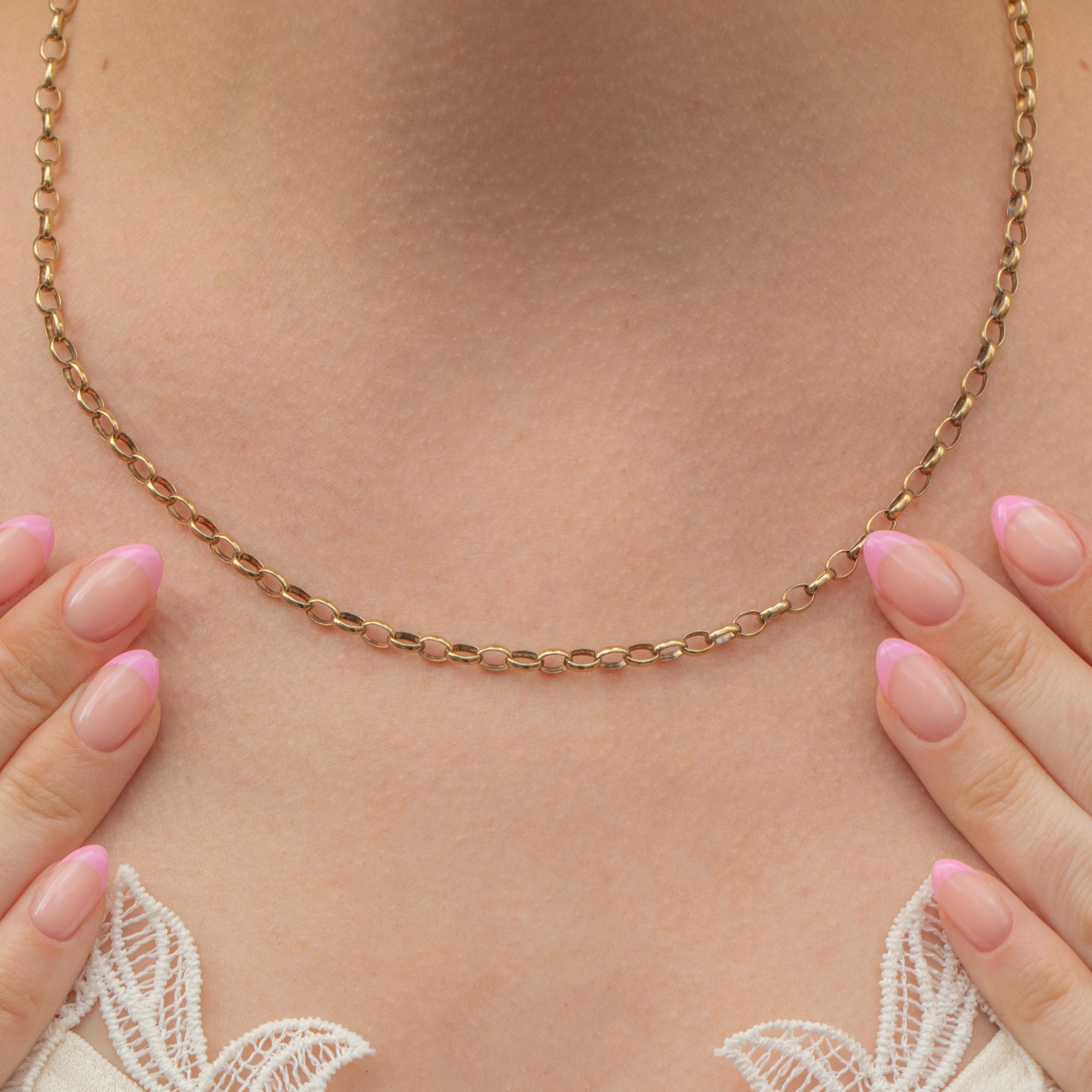 How divine is this 18" 9ct Gold belcher chain?! Formed of larger oval links crafted from buttery 9ct Gold, this solid Gold chain has a lovely fluidity, falling effortlessly around the neck in a smooth and flowing line.