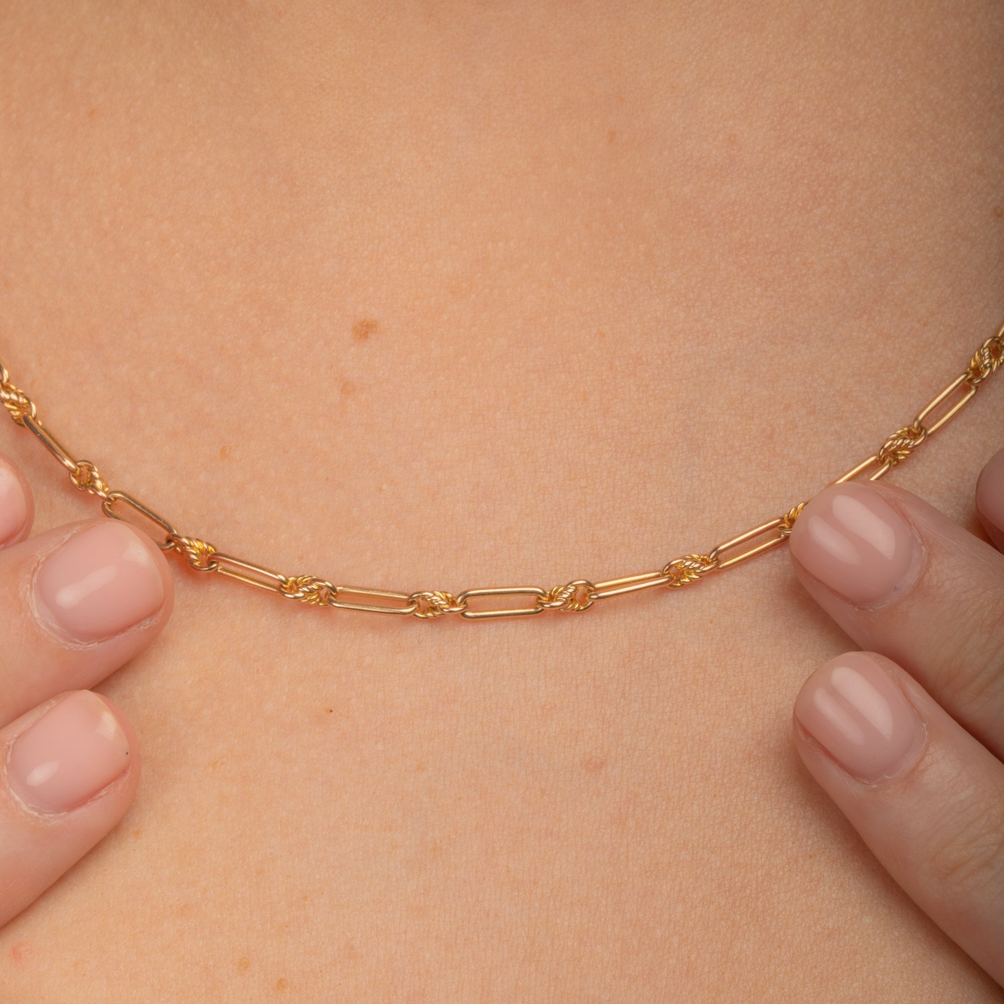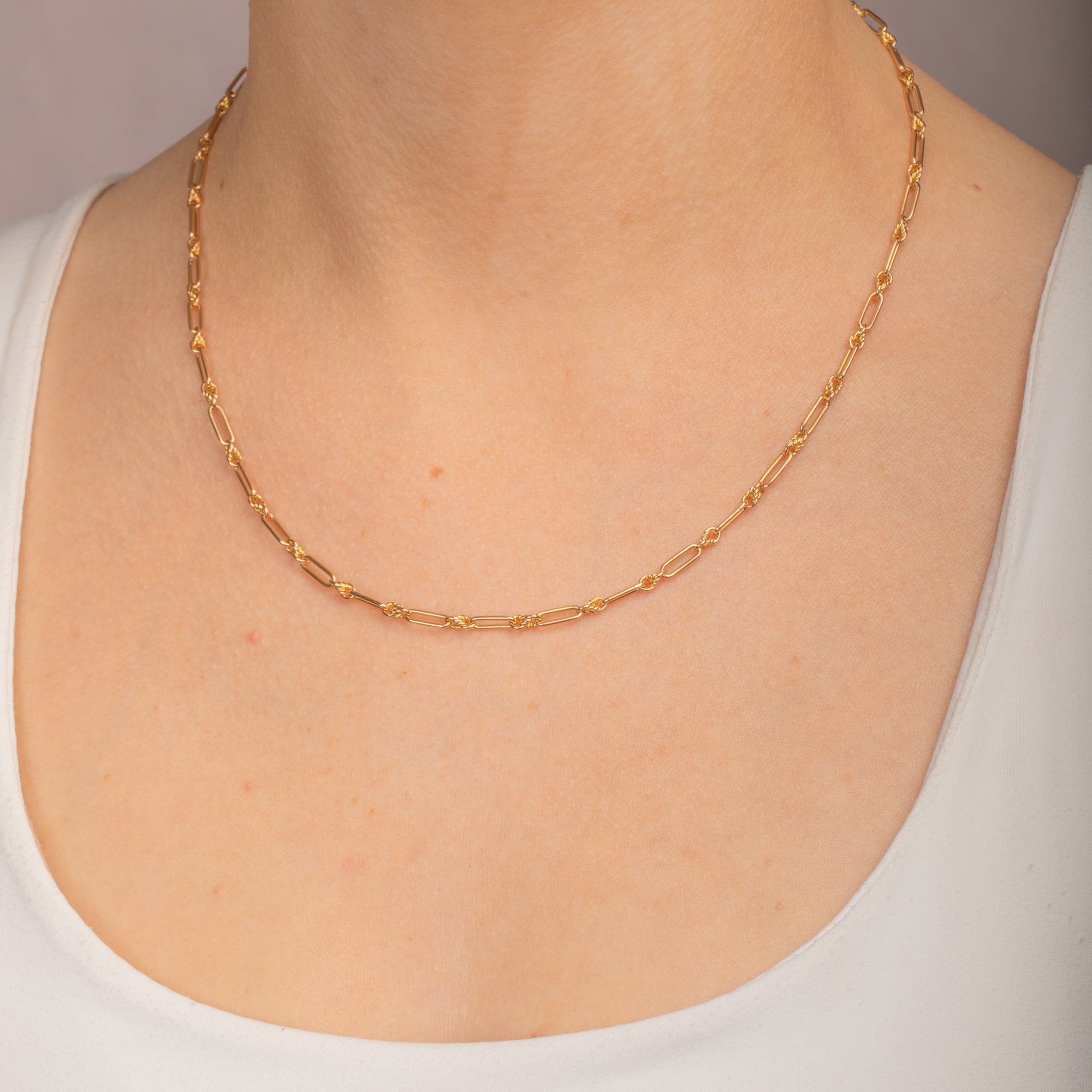 This 18" antique 15ct Gold lover's knot chain is bursting with romantic sentiment! Crafted from sunny 15ct Gold, the light trickles across each curvaceous lover's knot link, adding texture and depth to your neck stack.