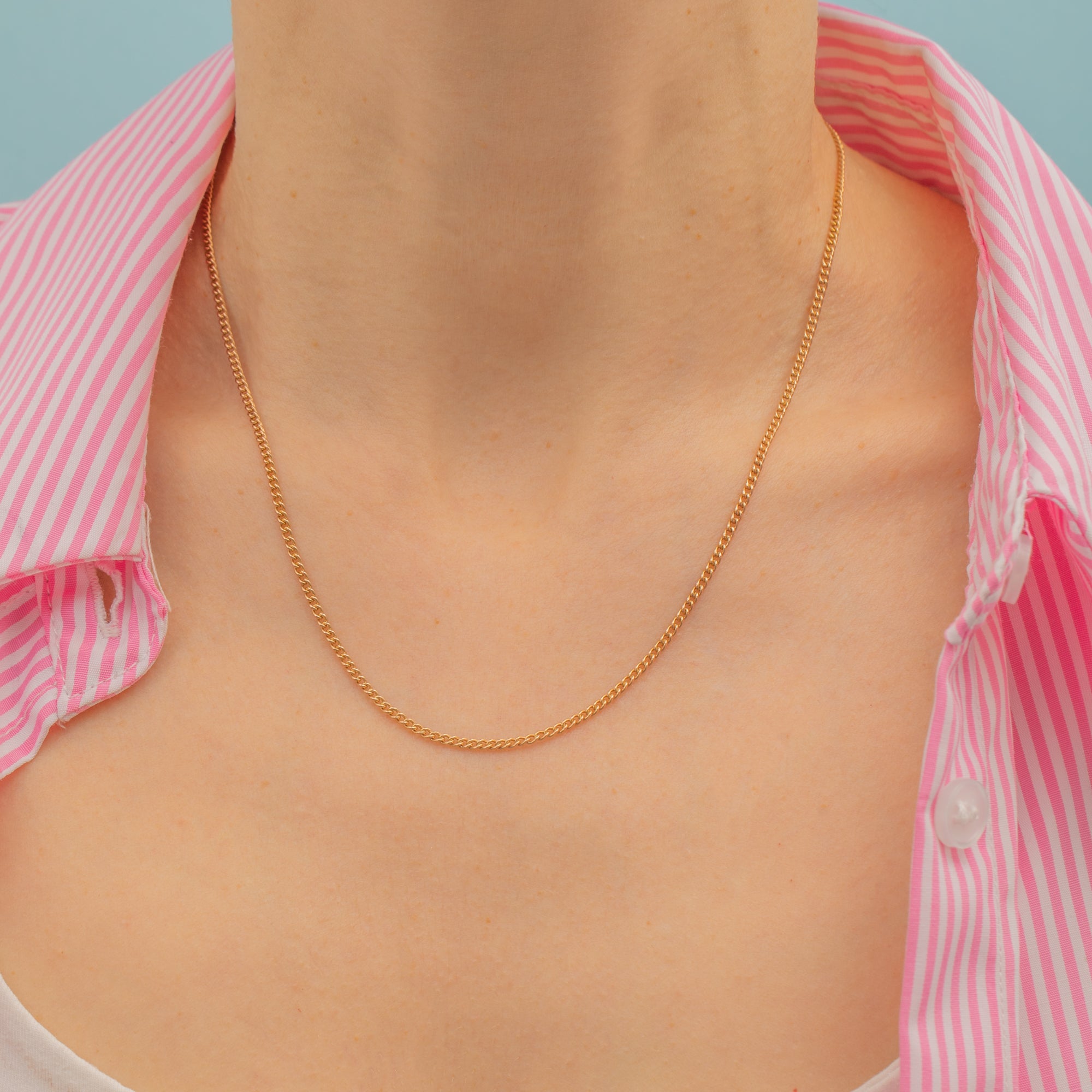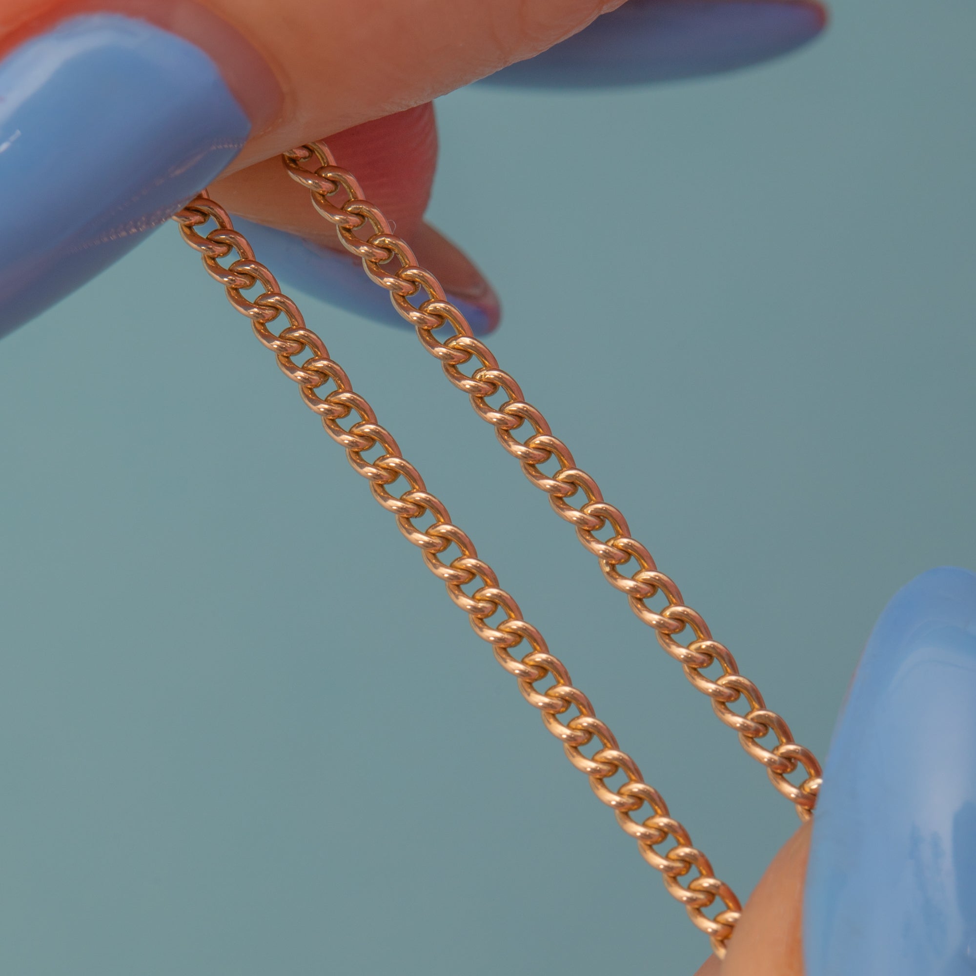 This 18" antique 15ct Gold skinny curb chain is a must-have within your jewellery box! Her skinny curb links, crafted from buttery 15ct Gold, comes complete with a large bolt-ring allow your favourite pendant to affixed with ease, and at 18" long, it will rest centrally across your décolletage.