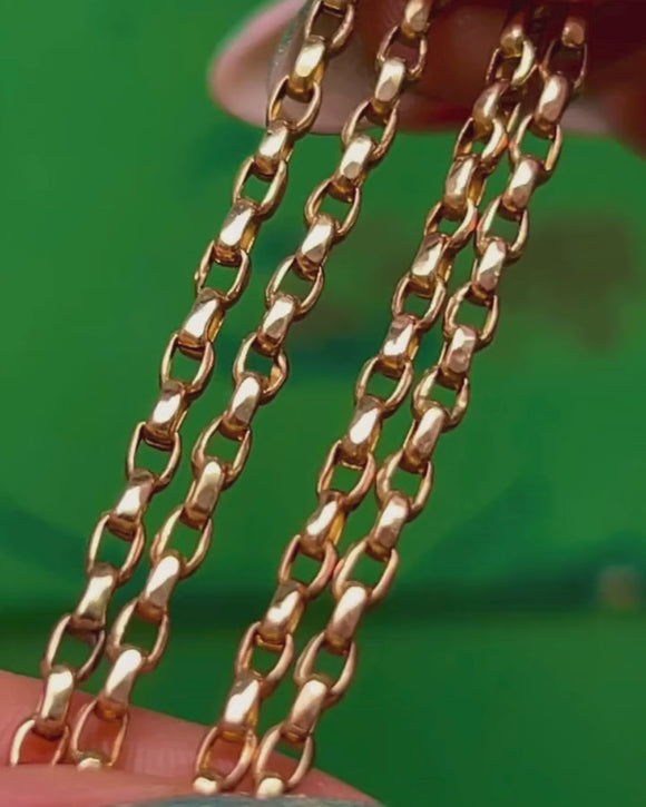 EXCELLENT. This 18" antique 9ct Gold belcher chain is in excellent condition. The links are strong and durable with very little wear, they have many years, if not decades of enjoyment left in them. With a later added bolt-ring, you can wear this antique Gold chain with confidence.