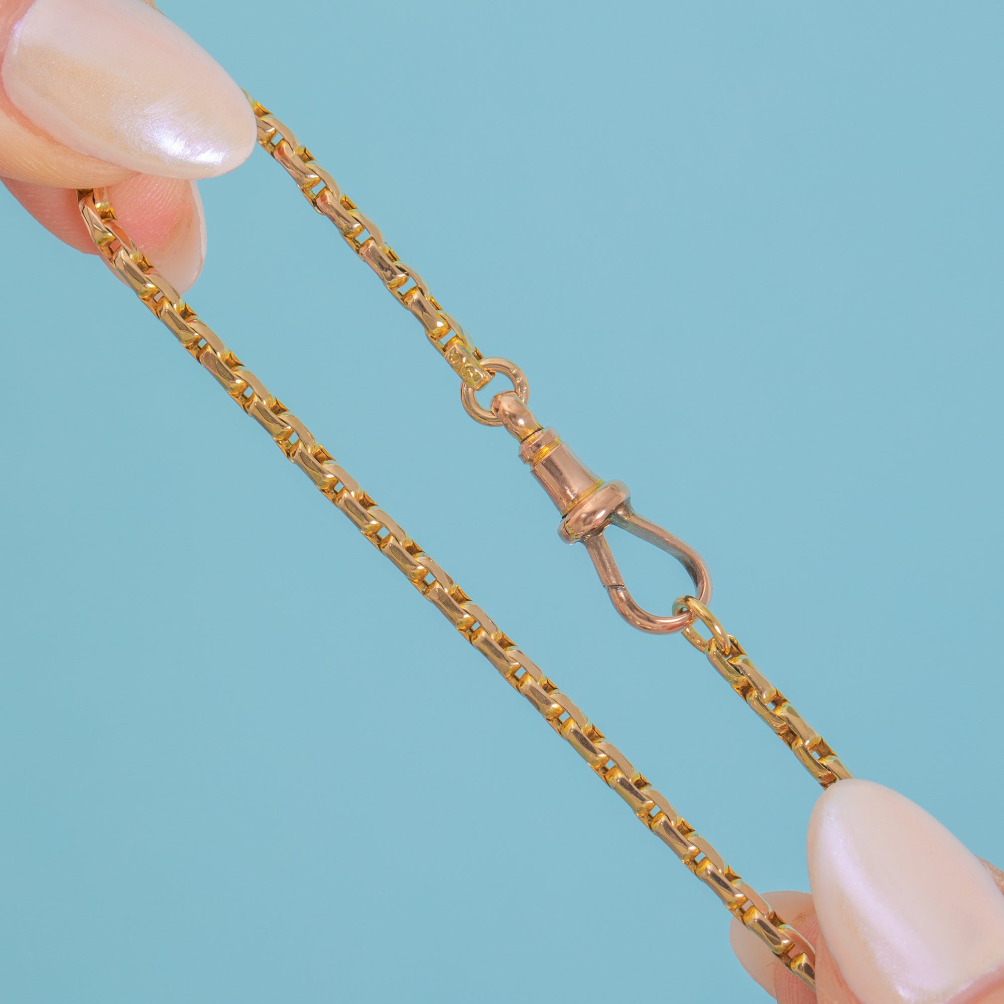 One can never have too many antique Gold chains, and the beauty of this piece is that her chunky belcher links are slightly square in shape, giving you texture and depth. She is complete with an adorable antique dog clip, a highly sought-after addition to any Victorian Gold chain!