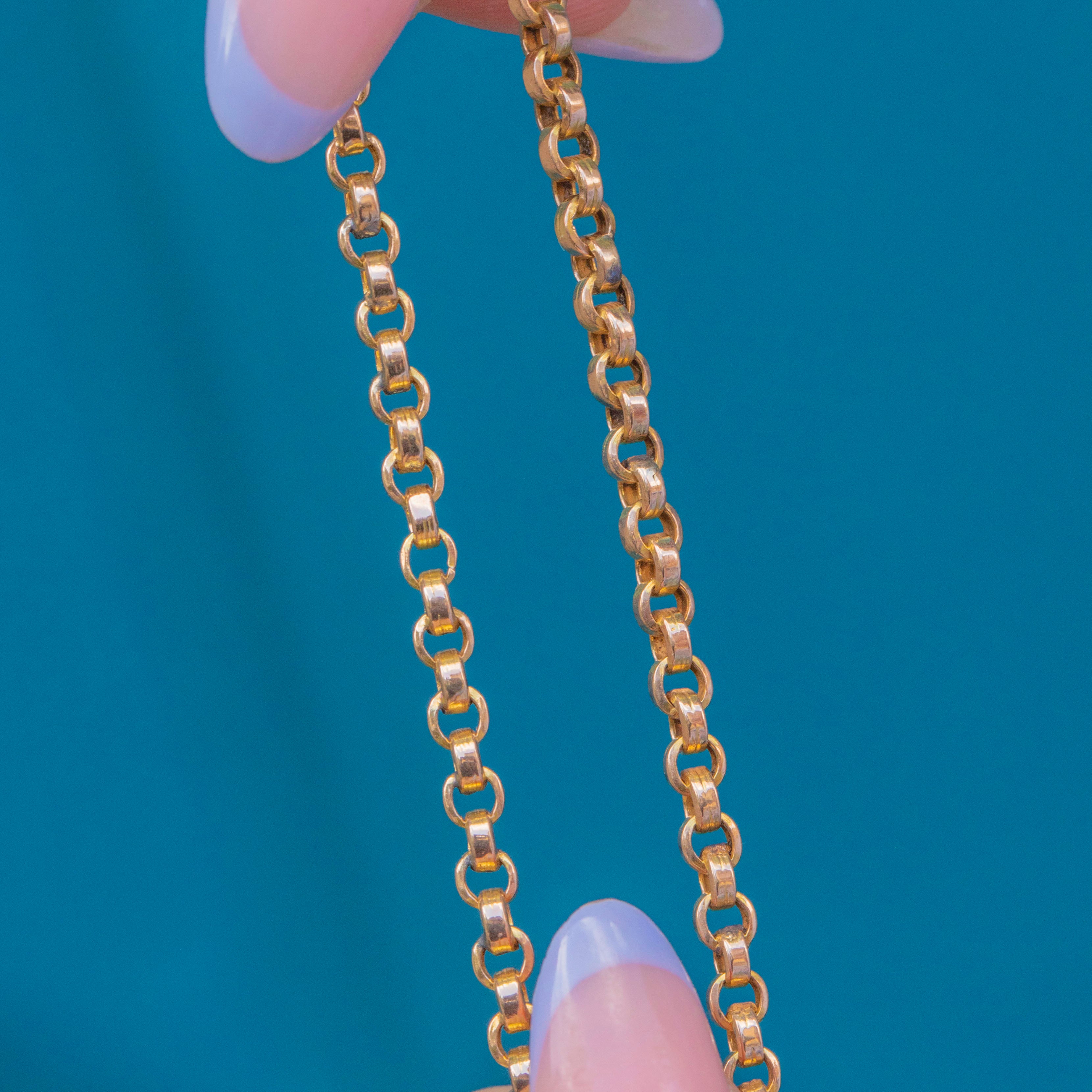VERY GOOD-EXCELLENT: This antique 9ct Gold belcher chain is in great condition. Each of her links is uniform and secure, and though they show some signs of wear and minor discolouration, this is difficult to spot when wearing. With her dog-clip in perfect working order, this antique chain is a must-have piece!