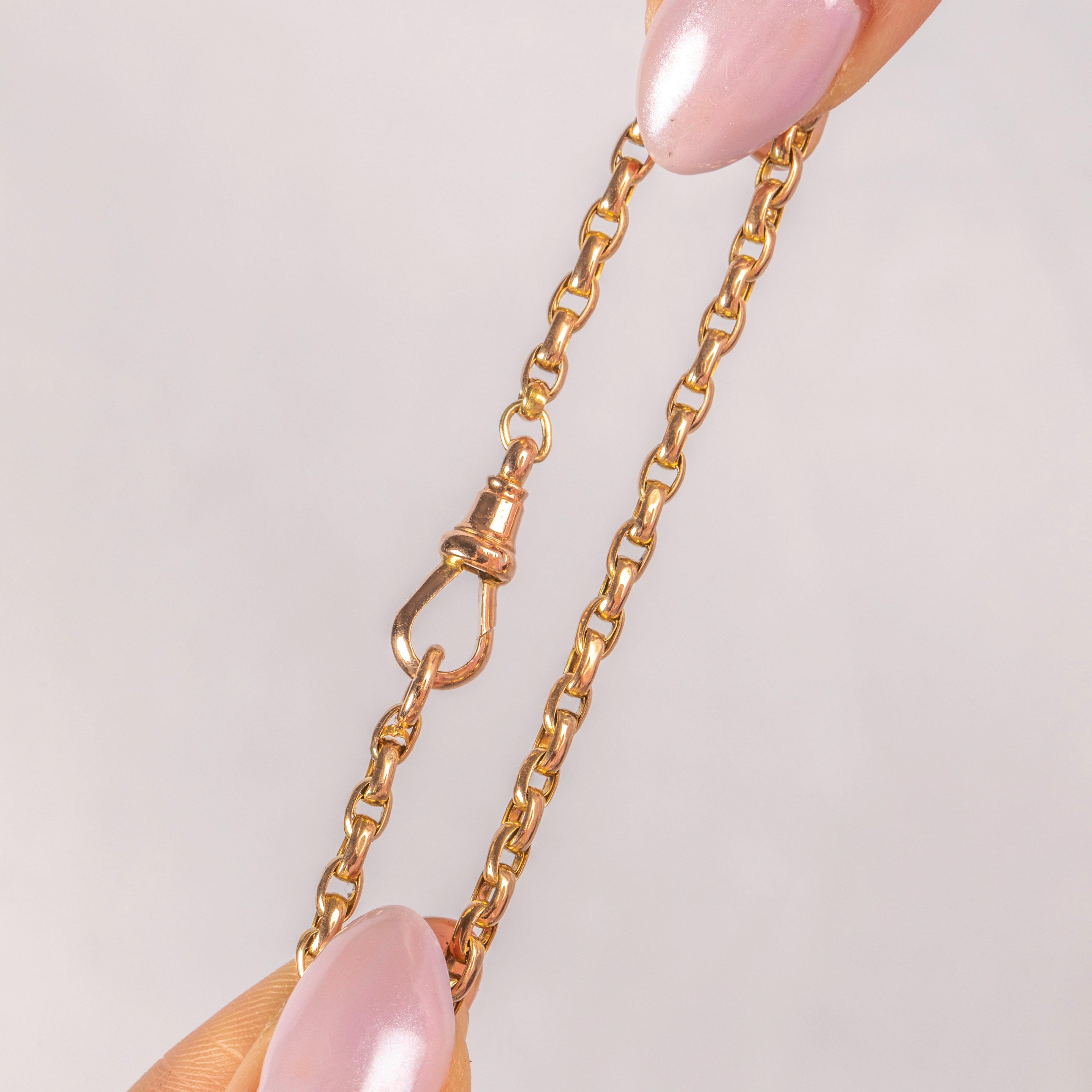 Victorian Gold chains are undeniably versatile, and she is no exception! Lending her a satisfyingly chunky but sophisticated feel, this Antique 9ct Yellow Gold Belcher chain features plump, saturated links and a highly sought after Dog-clip. Her unique Victorian charm is wonderful, and her versatility makes her the ideal chain for your everyday wear.