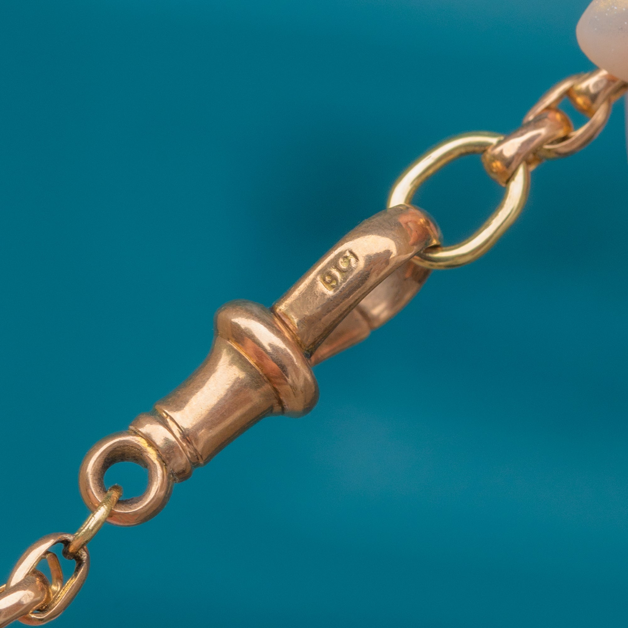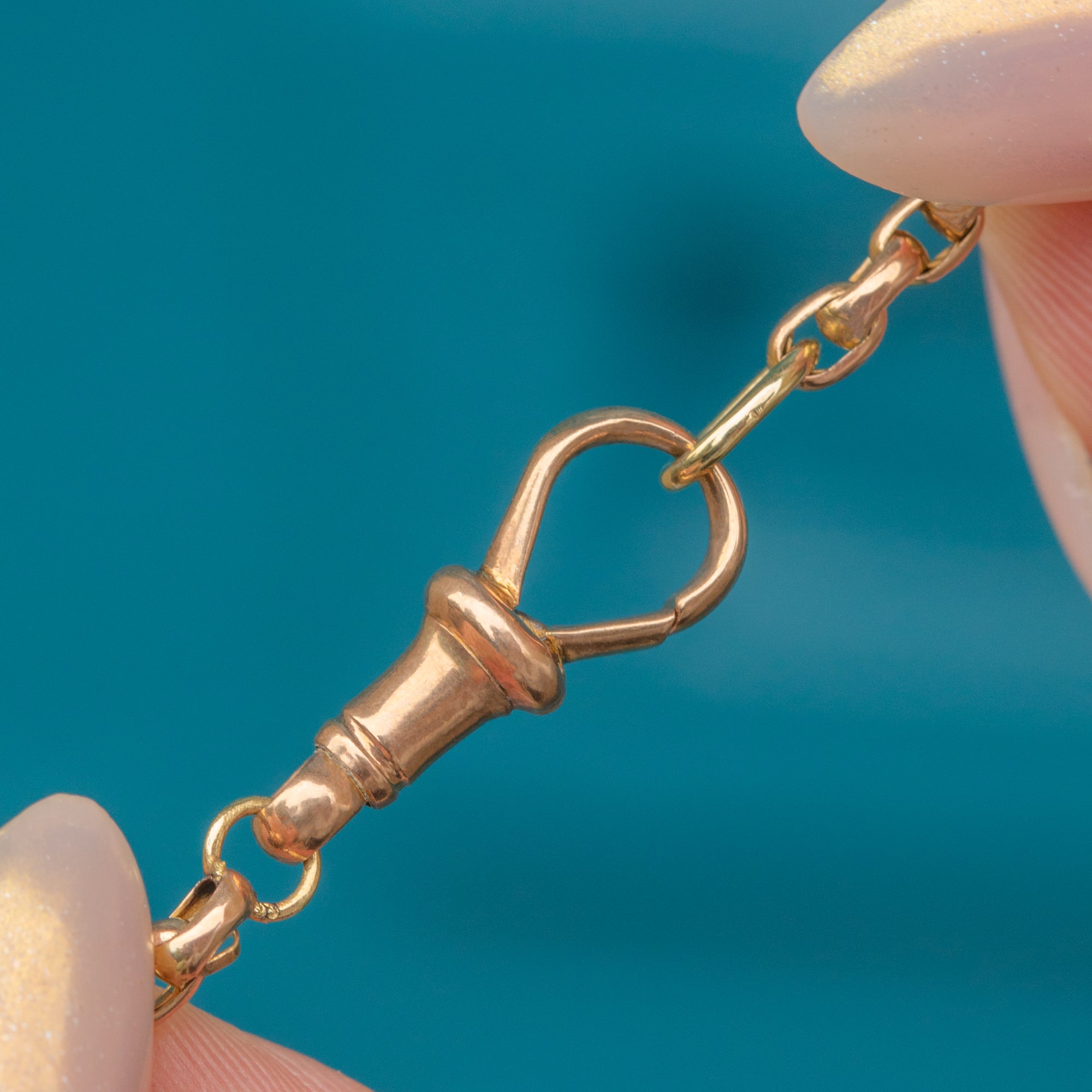EXCELLENT: The Gold links are strong and in superb condition with no signs of damage. The dog-clip clasp is original, secure, and in perfect working order.