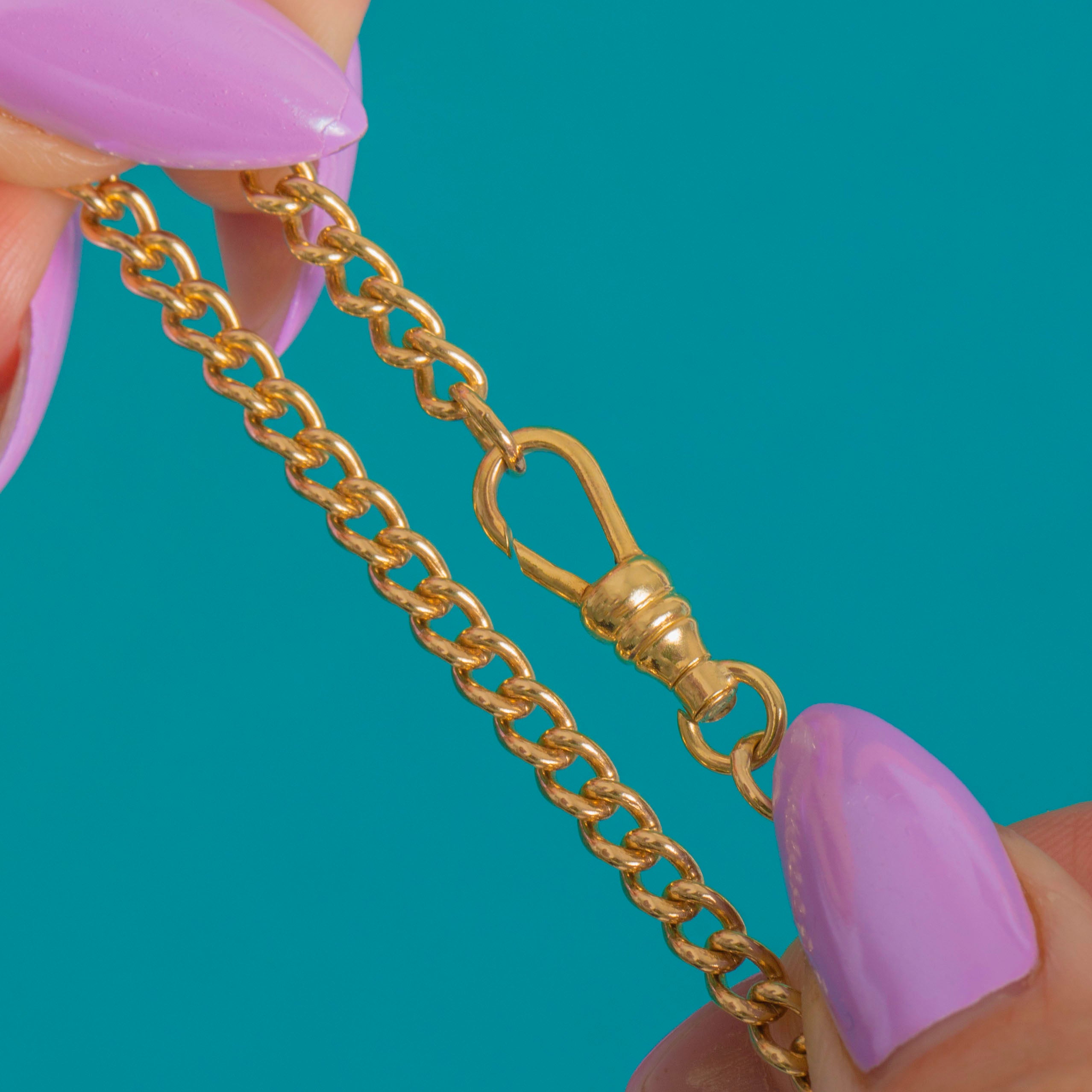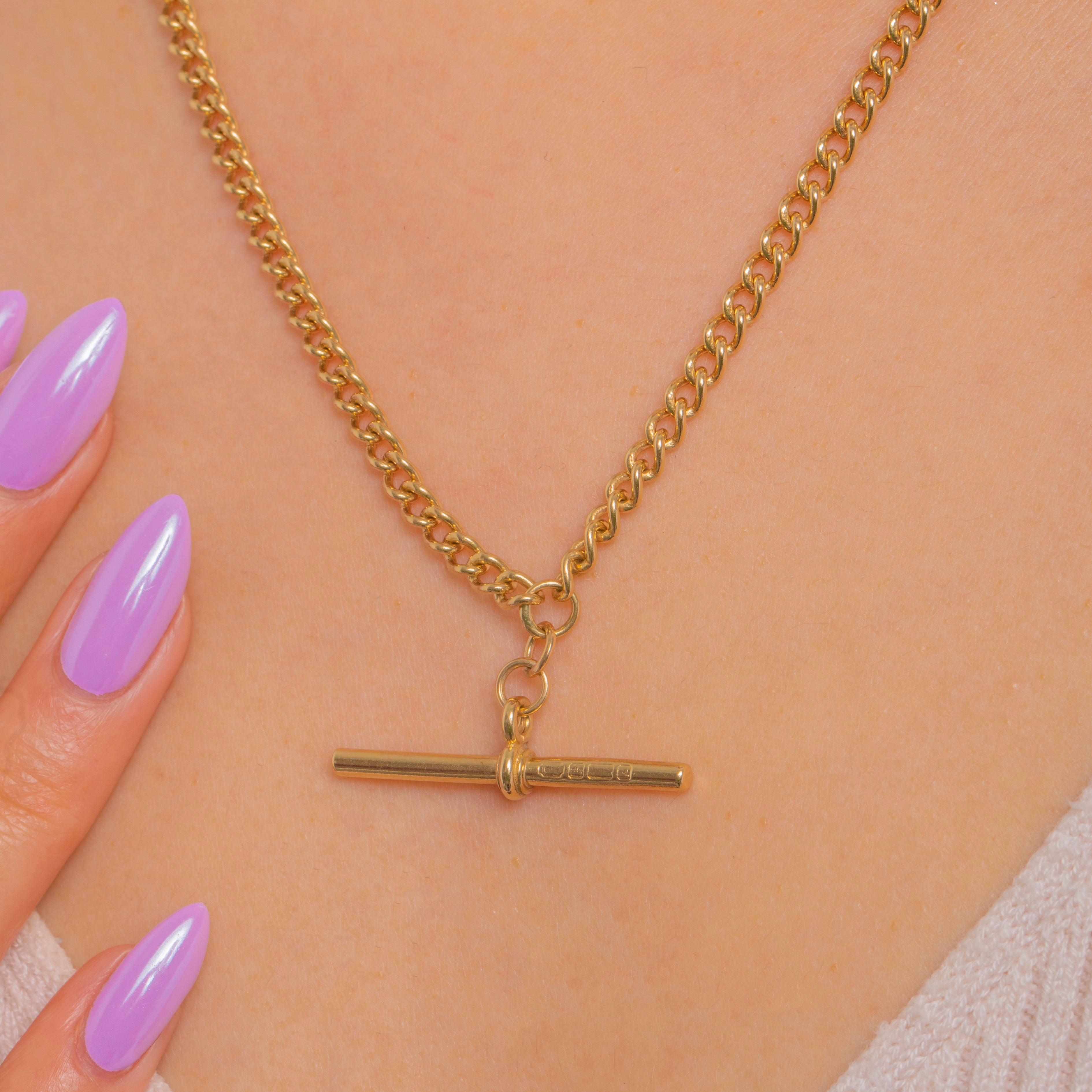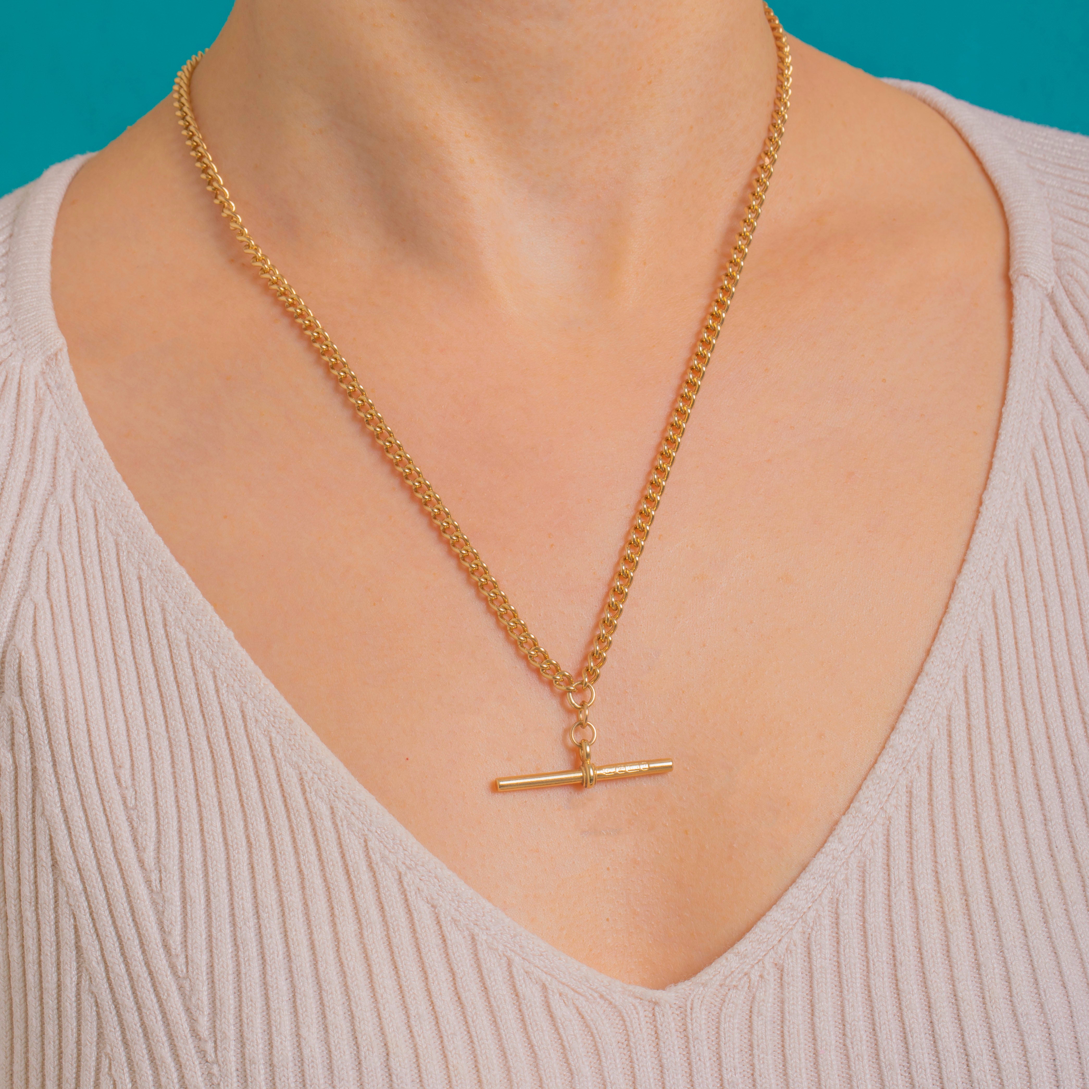 This vintage Albert chain is a wonderfully classic piece, crafted in bright 9ct Gold and fitted with both a dog-clip and T-bar. With its traditional curb links and substantial 18.1g weight, it has all the timeless appeal of a handsome antique watch chain, reimagined as a beautifully wearable necklace.